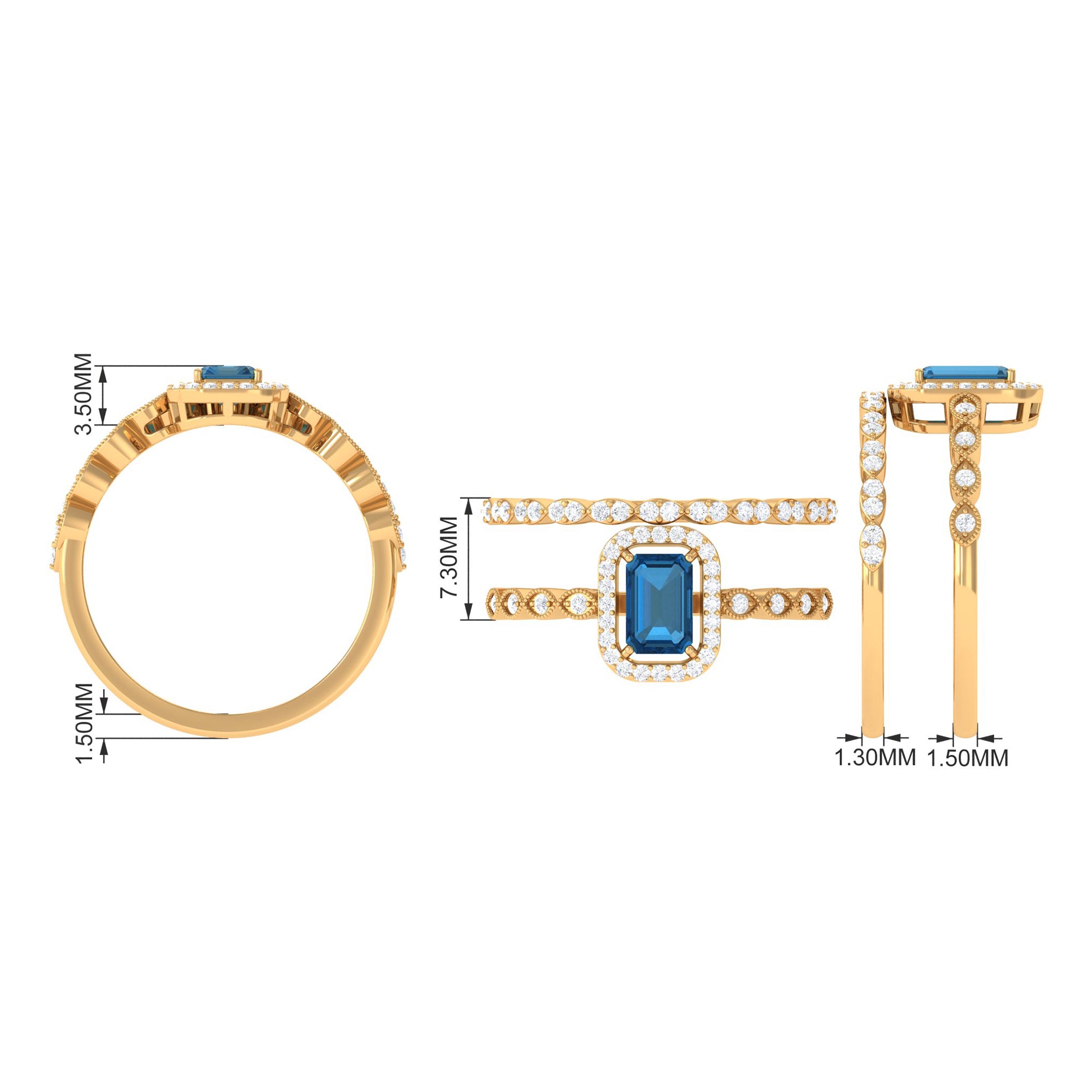 Timeless elegance and vintage allure converge in this stunning Blue Topaz Engagement Ring Set, crafted for brides who appreciate a bold yet sophisticated sparkle. The highlight of this set is an 4X6 mm Emerald Cut London Blue Topaz, securely held in a prong setting, which emanates brilliance and fire, beautifully encircled by a radiant halo of round Diamonds stones. This exquisite halo and accompanying side stones amplify the center stone’s radiance while imparting an antique-inspired aesthetic that is both majestic and romantic. What distinguishes this piece is the elegant combination of the engagement ring with a complementary wedding ring guard. Adorned with both round shaped Diamond stones set in a marquise shaped frames, gives the entire Halo Wedding Ring Set a vintage vibes, without requiring an additional band. This set pays homage to timeless design, with each stone meticulously placed with care and purpose. The blend of dazzling sparkle and vintage charm makes it perfect for the bride who cherishes tradition while desiring a hint of individuality. Whether you are walking down the aisle or commemorating a significant milestone, this Engagement Ring with Wedding Band Set delivers a profound statement of love and sophistication.