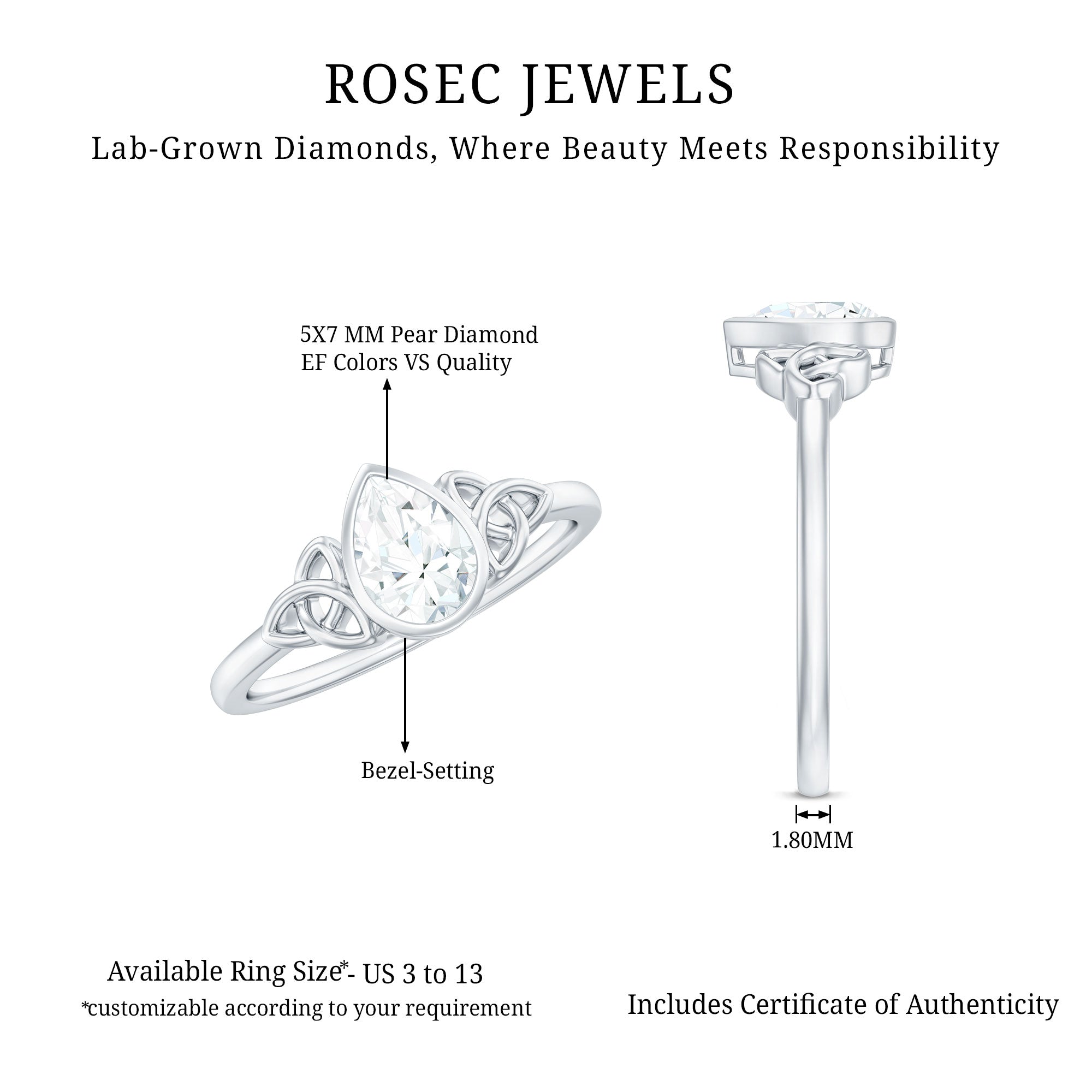 Declare her the ruler of your heart with this elegant and subtle Lab Grown Diamond Ring, signifying her profound importance in your world. The focal point, a securely held Pear Cut Lab Grown Diamond, radiates its brilliance from within a protective Bezel Setting. On either side, delicate Celtic Knot motifs stand as symbols of your unbreakable and everlasting bond.