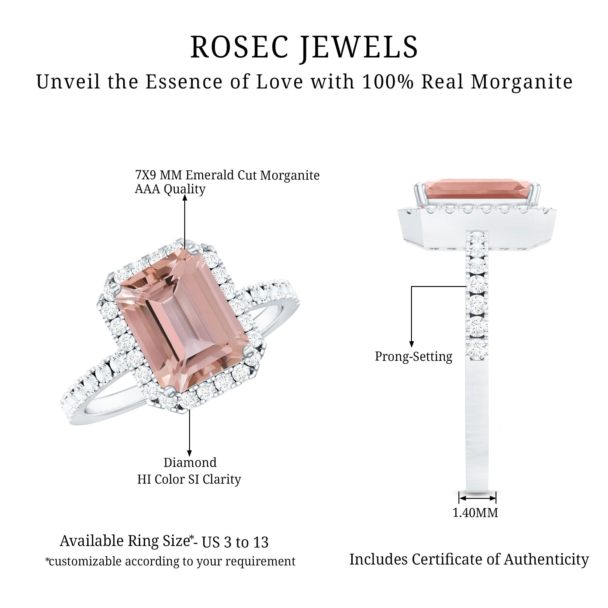 Elegantly adorn her finger with this Morganite Engagement Ring. It features a stunning 7X9 MM Emerald Cut Morganite gemstone set as a center stone and is surrounded by a halo of Diamond. A simple yet elegant choice for your special day.