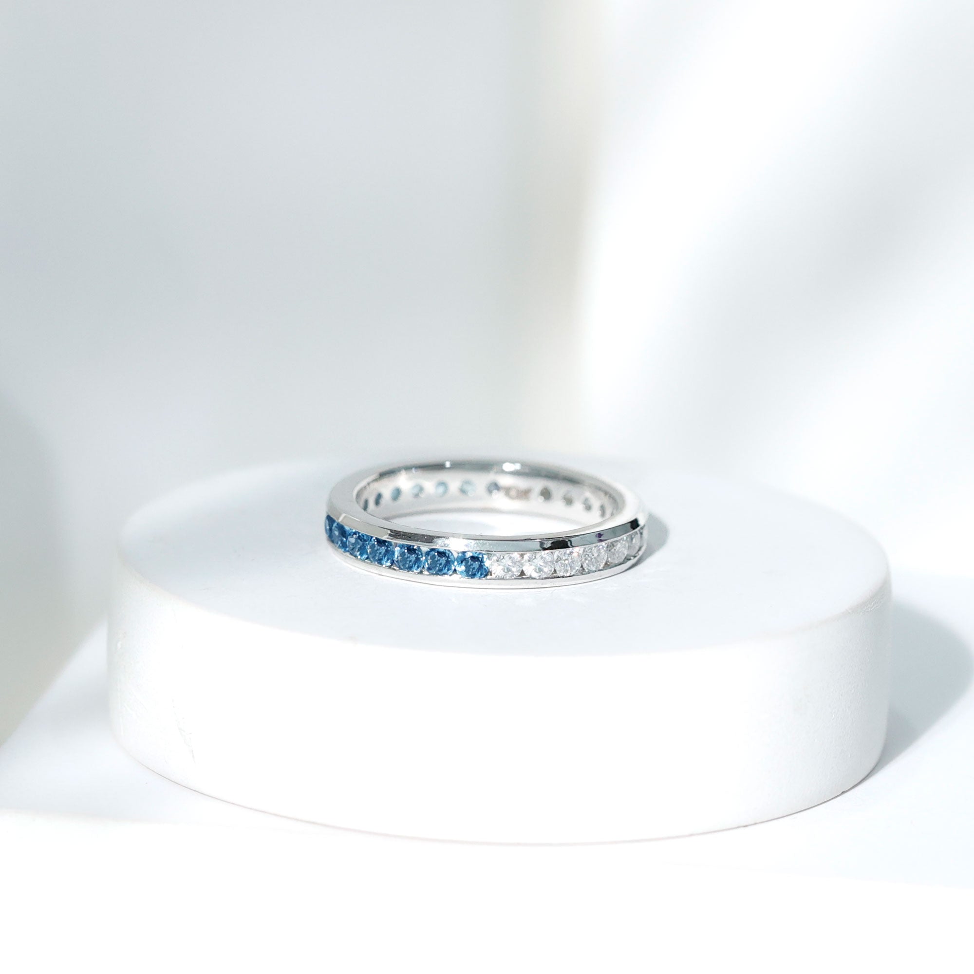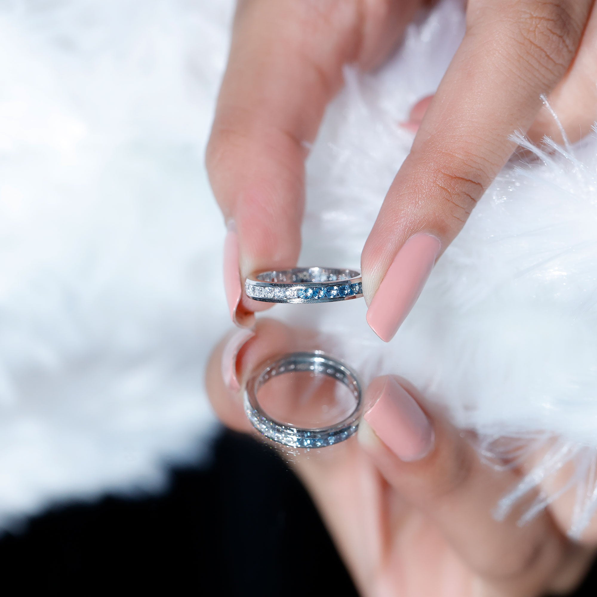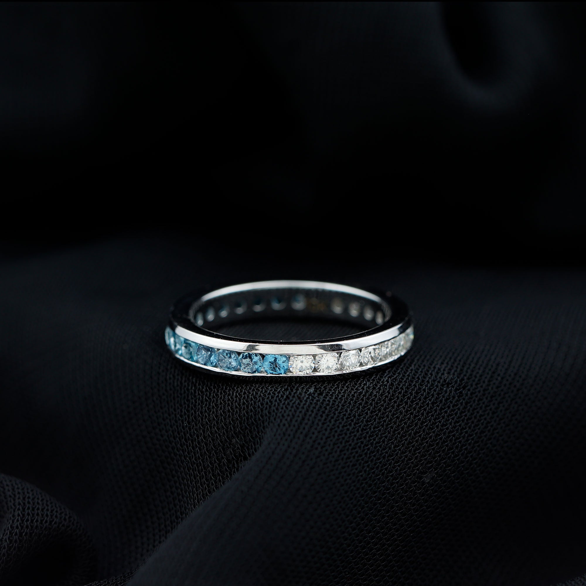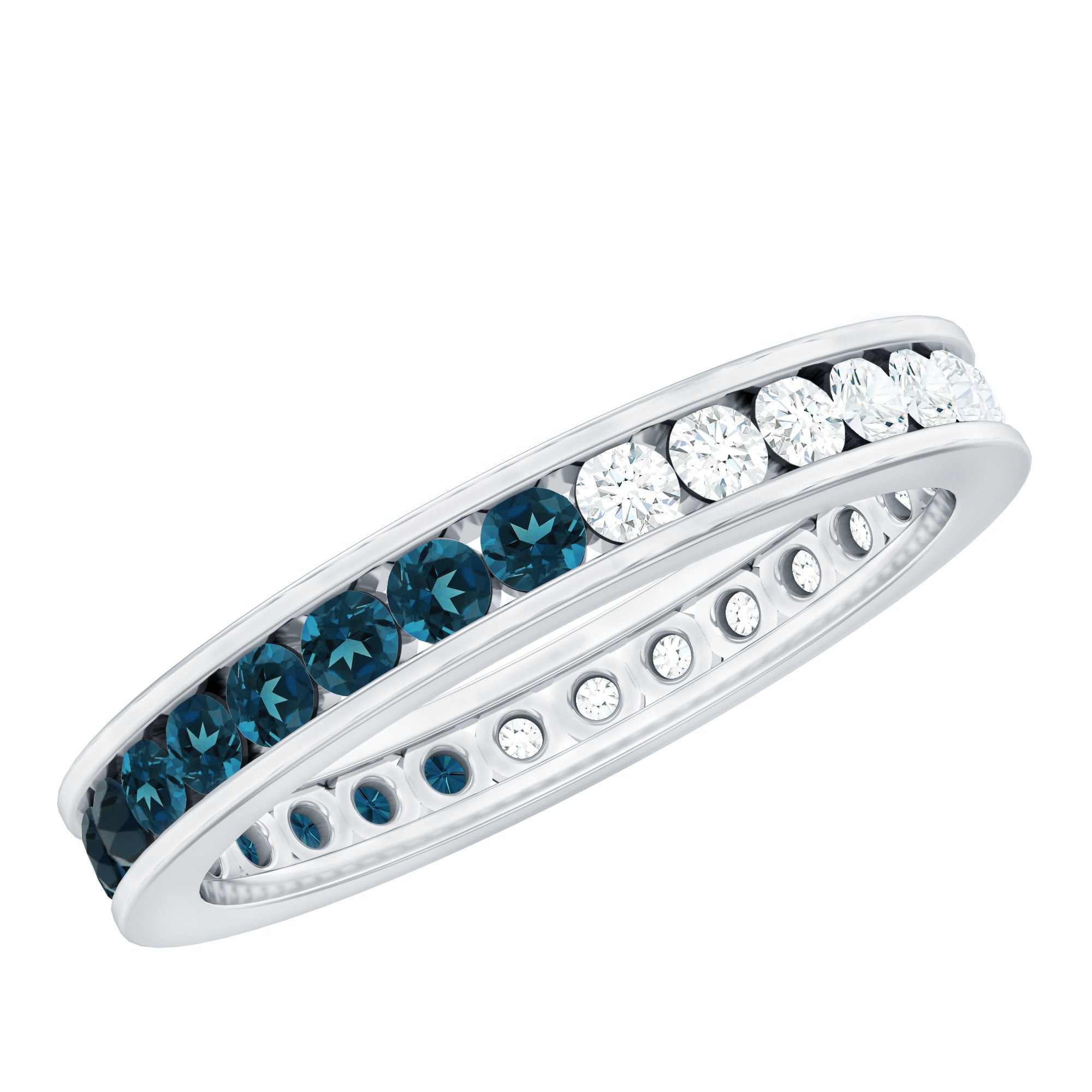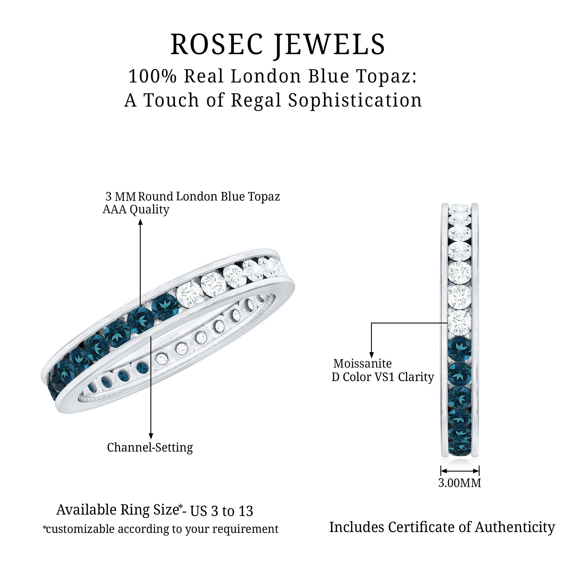 Presenting a ring that redefines the notion of eternal love with a stylish, modern touch. This Full Eternity Ring for Women stands as the ultimate homage to eternity, crafted for those who appreciate a touch of brilliance. It features AAA Quality Round Shape London Blue Topaz set in a Channel Setting, in the half of the band and half band adorned with round shape Moissanites with each gem exuding remarkable brilliance and clarity, enveloping your finger in an unbroken circle of light. This Eternity Wedding Band acts as a luminous reminder of every shared smile, every important moment, and all the heartbeats in between. Designed to attract attention and spark conversations, this London Blue Topaz Eternity Band is presented in an elegant jewelry box, making it a perfect gift, proposal ring, or a special indulgence for yourself. Whether for everyday elegance or anniversary sparkle, this Wedding Anniversary Ring effortlessly integrates into your story, your style. Available in US sizes 3 to 13, ensuring that every woman can find her perfect fit. Delicate yet breathtaking, sophisticated yet radiant, this Channel Set Eternity Band is crafted to shine just like you.