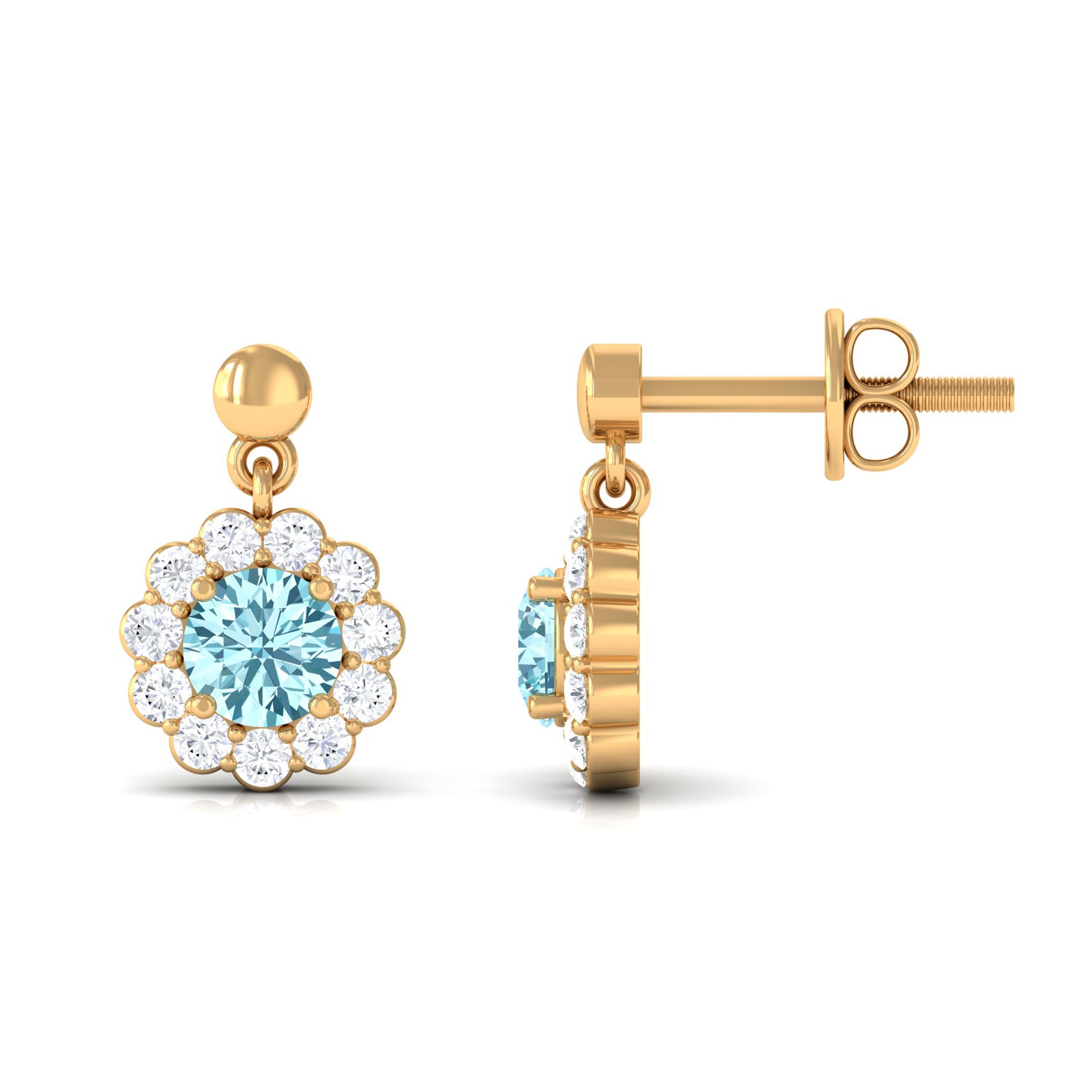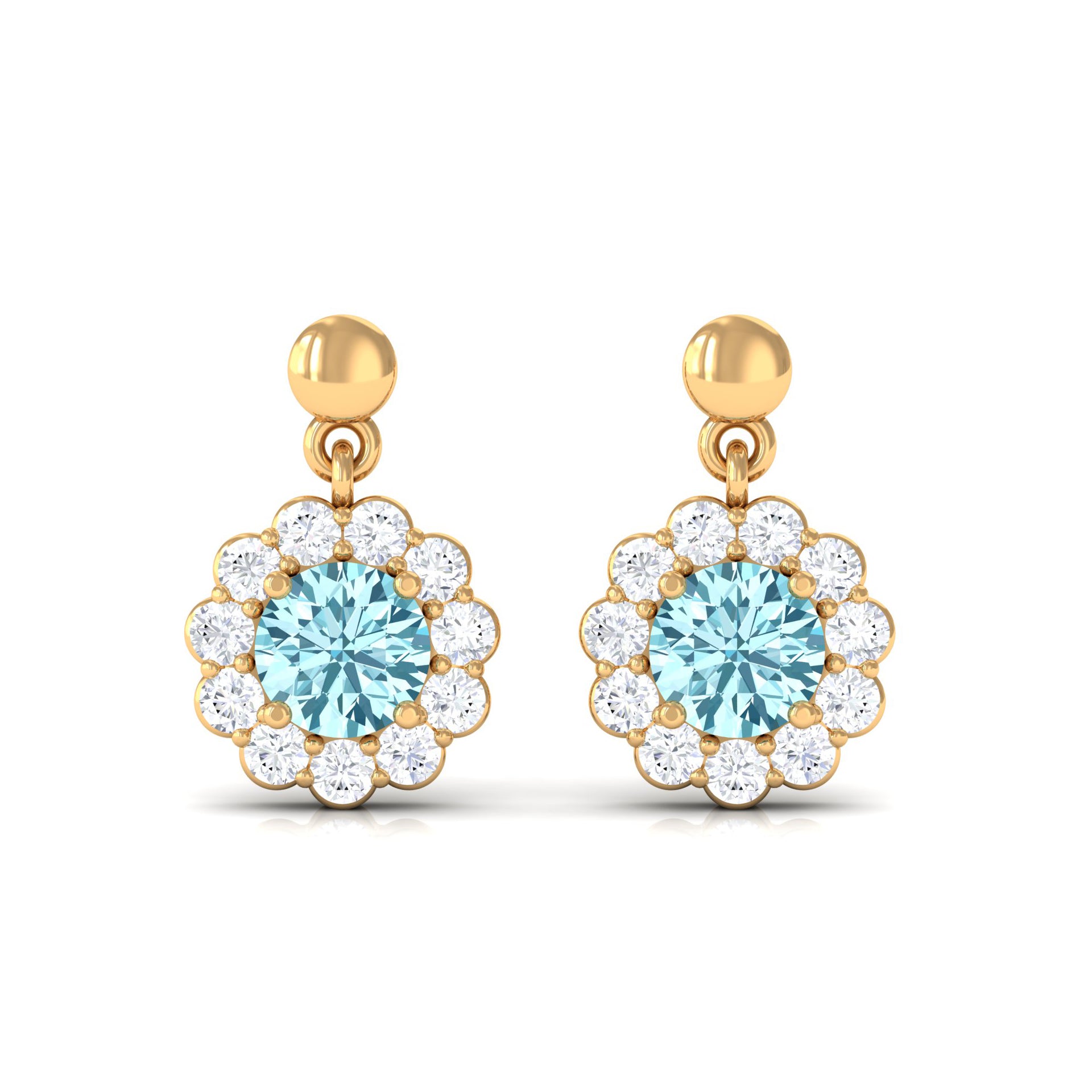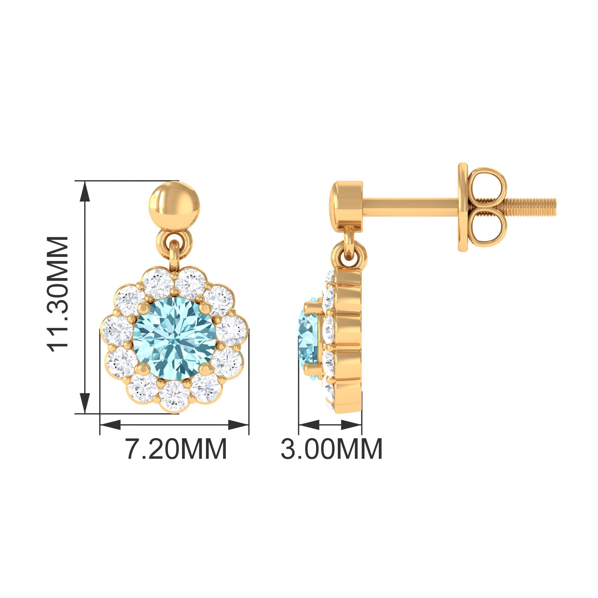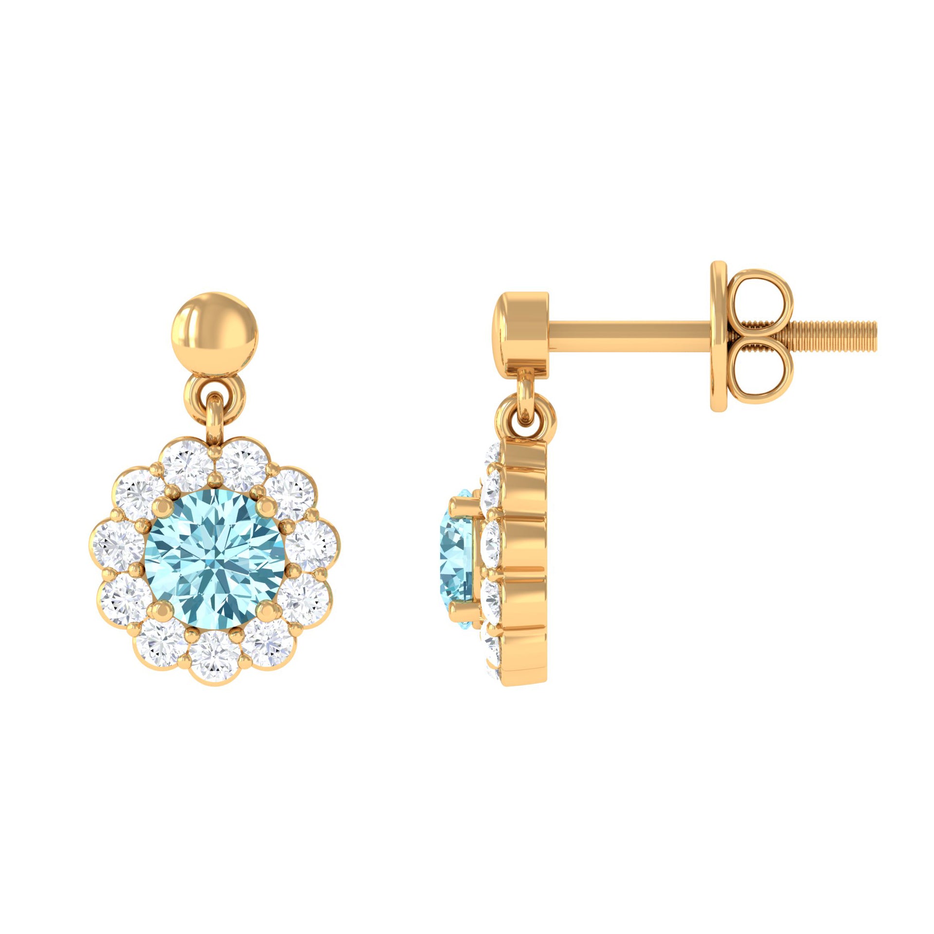 Complete your outfit with this elegantly designed Aquamarine Earrings. This Flower Drop Earrings is crafted with Gold and adorned with Round Shape Aquamarine with Diamond to make for a lovely choice for different occasions. These Halo Earrings and your love make her eyes glitter.