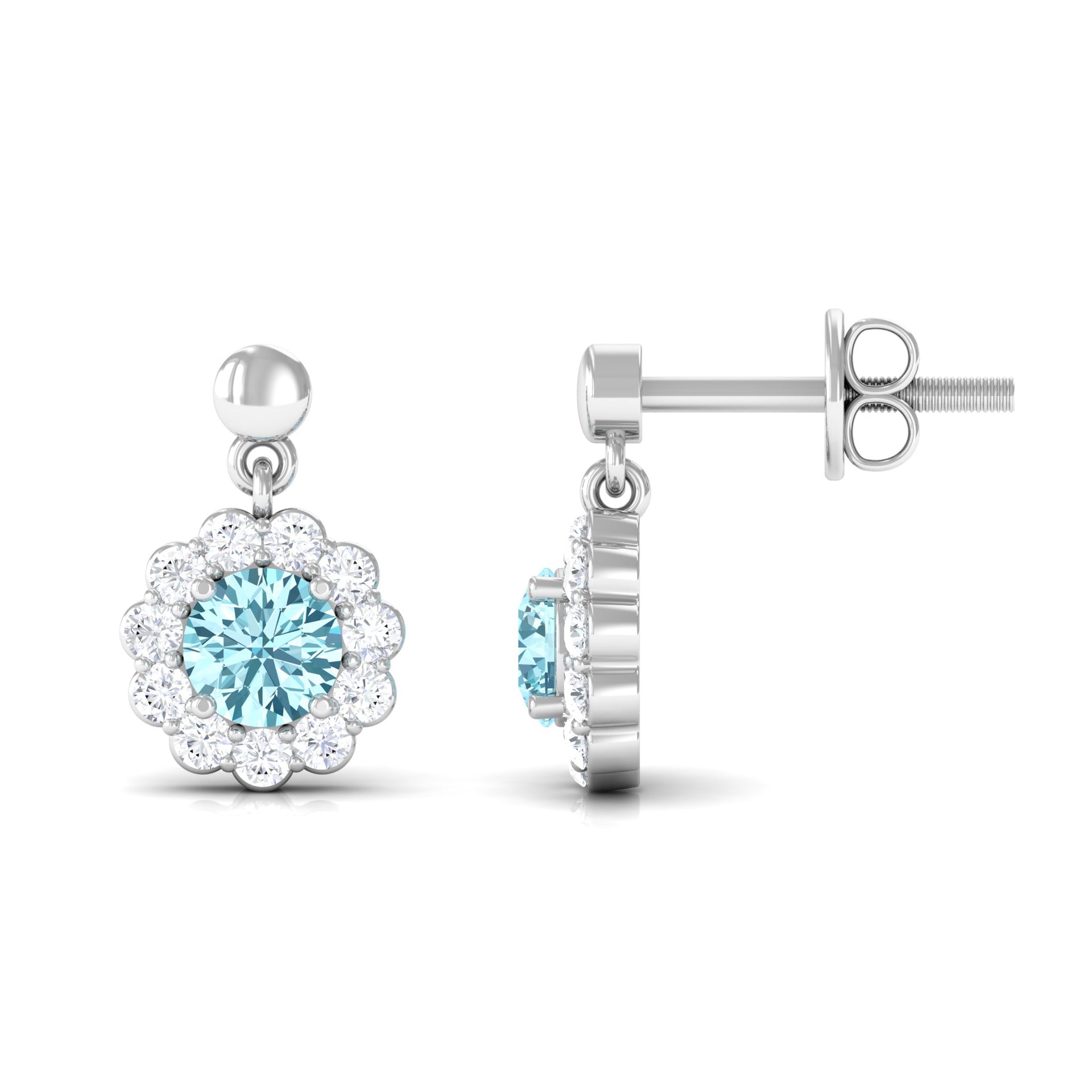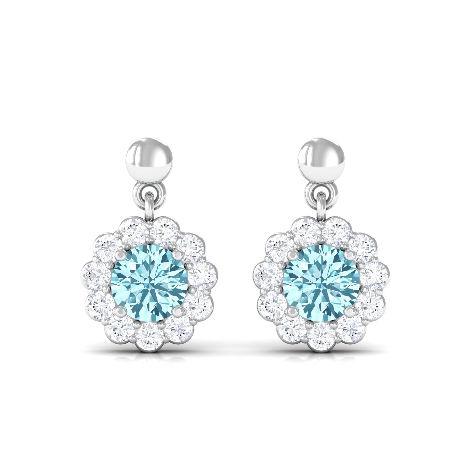 1 CT Real Aquamarine and Diamond Flower Halo Drop Earrings