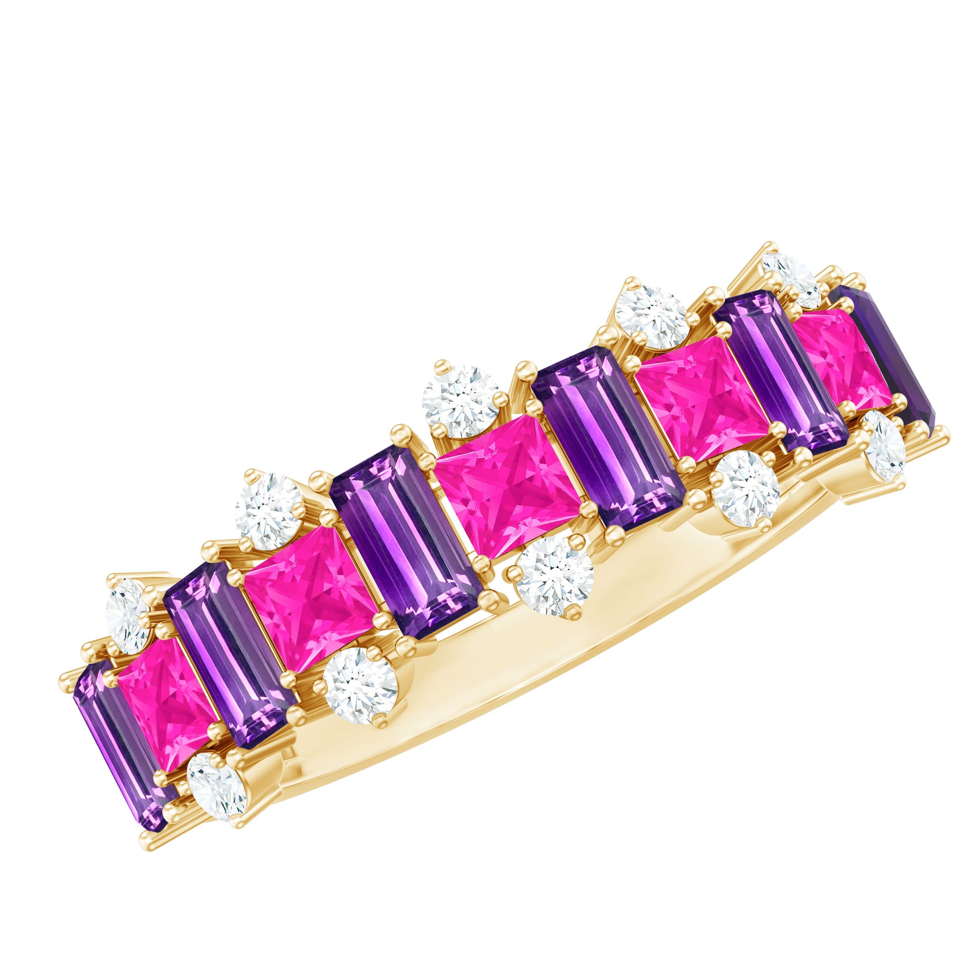 Check Popular Styles: Rainbow rings are available in almost all styles that we see in other rings. Cocktail, designer, halo, heart, promise, two stone, vintage inspired, etc styles can be selected according to preference. For a colorful ring stack, a rainbow eternity band is a perfect choice.