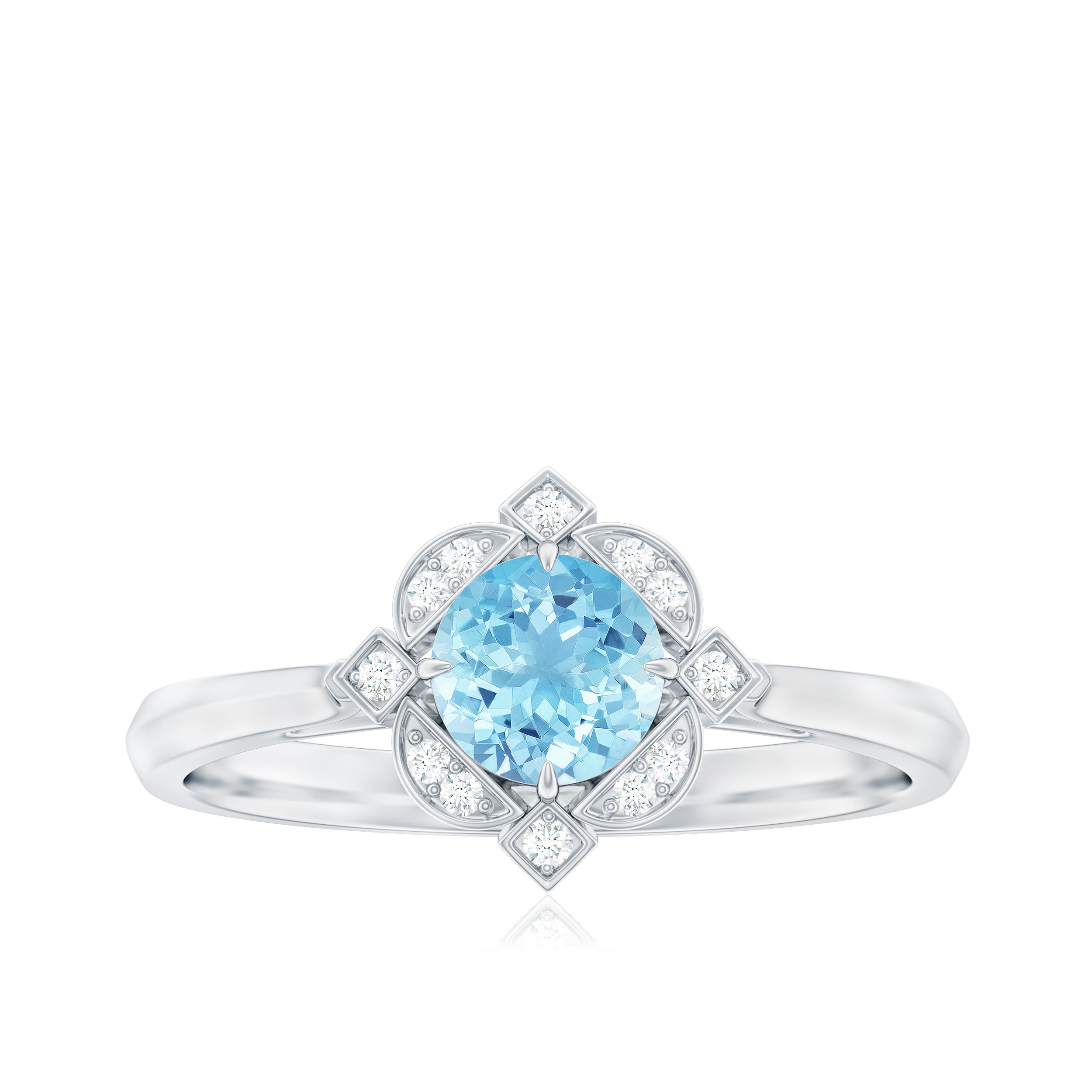 Make a timeless statement with this Aquamarine Classic Vintage Ring. Featuring a Round Shape aquamarine surrounded by a sparkling halo of Diamond stones, this ring is perfect for anniversaries or any other special occasion. Embrace your inner queen and add this beautiful piece to your jewelry collection.