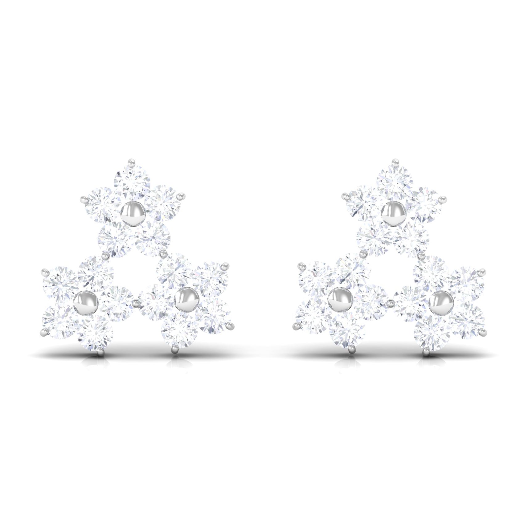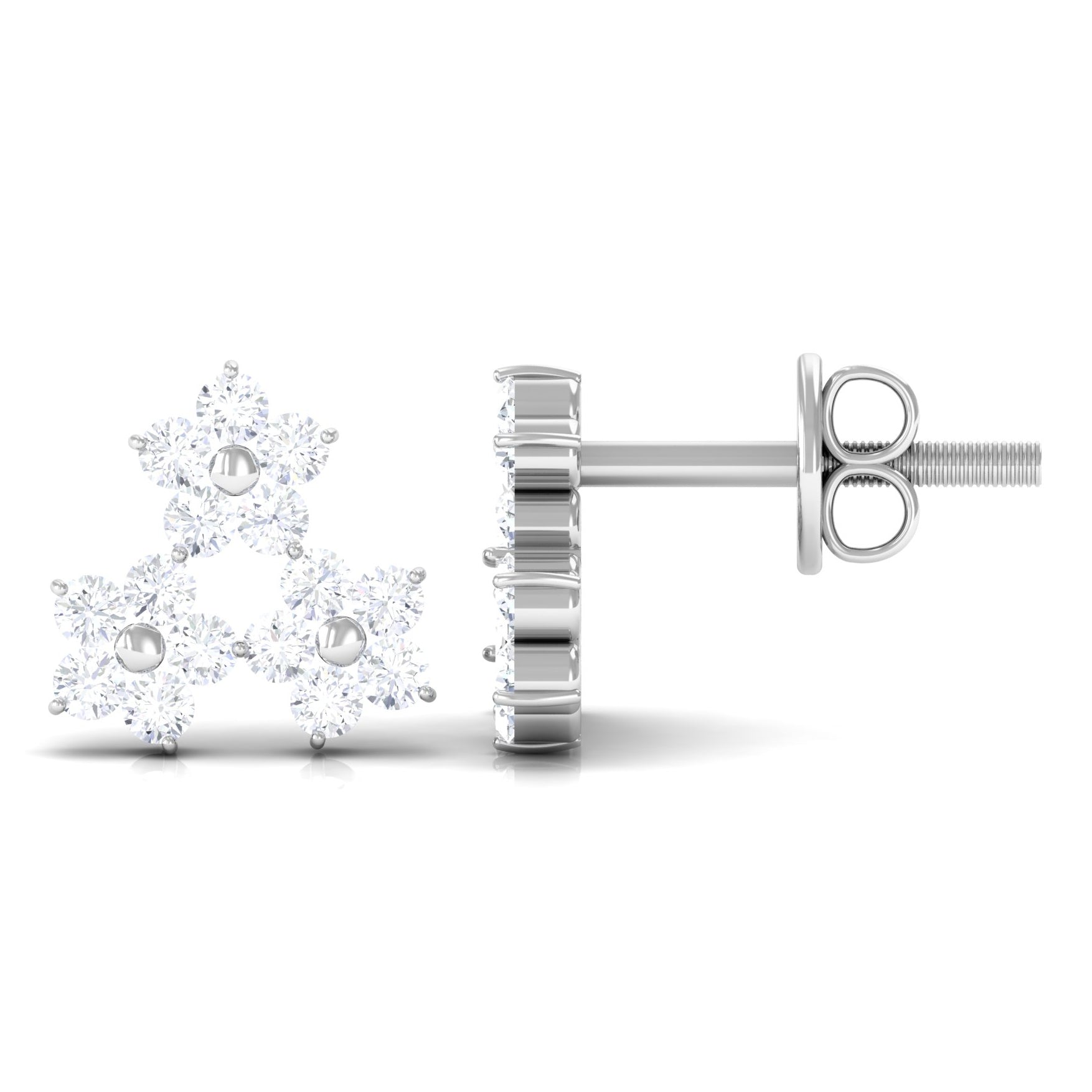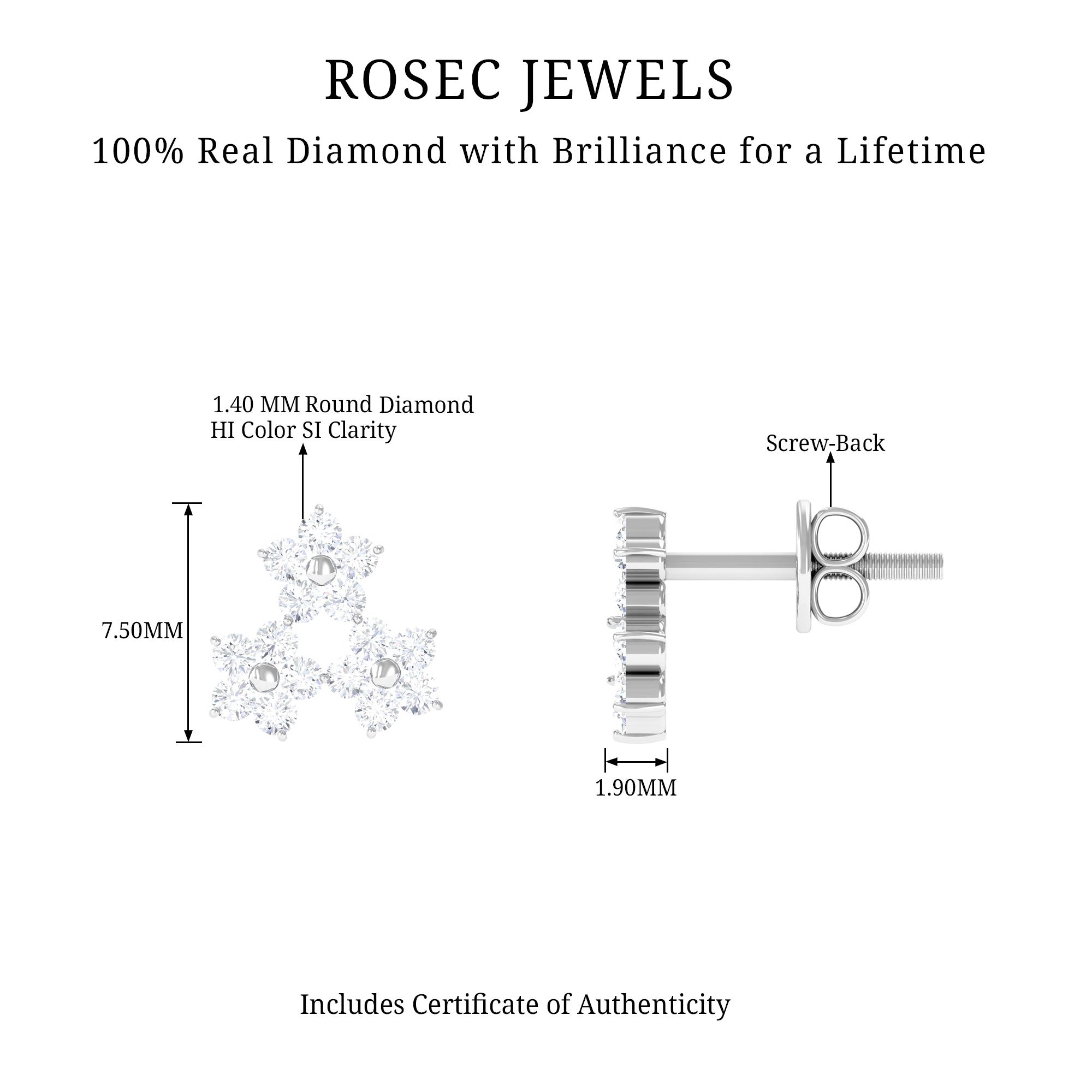 Grab this handpicked elegant jewelry for your loved one and make them happy. The Awesome Floral Stud Earring is adorned with Round Cut Diamonds in Prong Setting studded beautifully as Cluster of Three Flowers. Solid Gold crafting make this Screw Back Finding Stud Earring more Stunning.