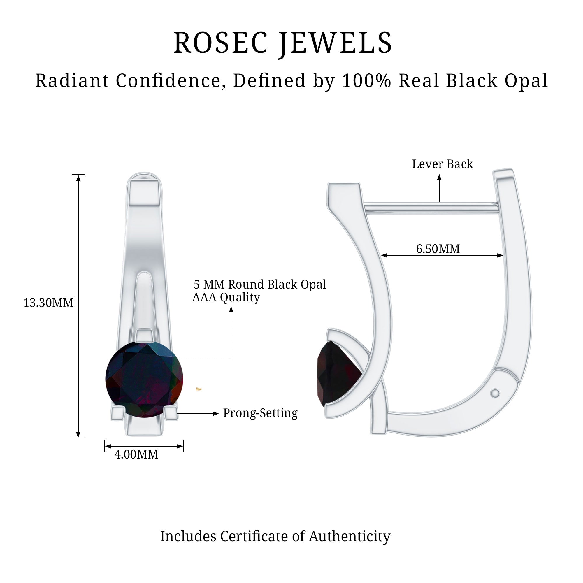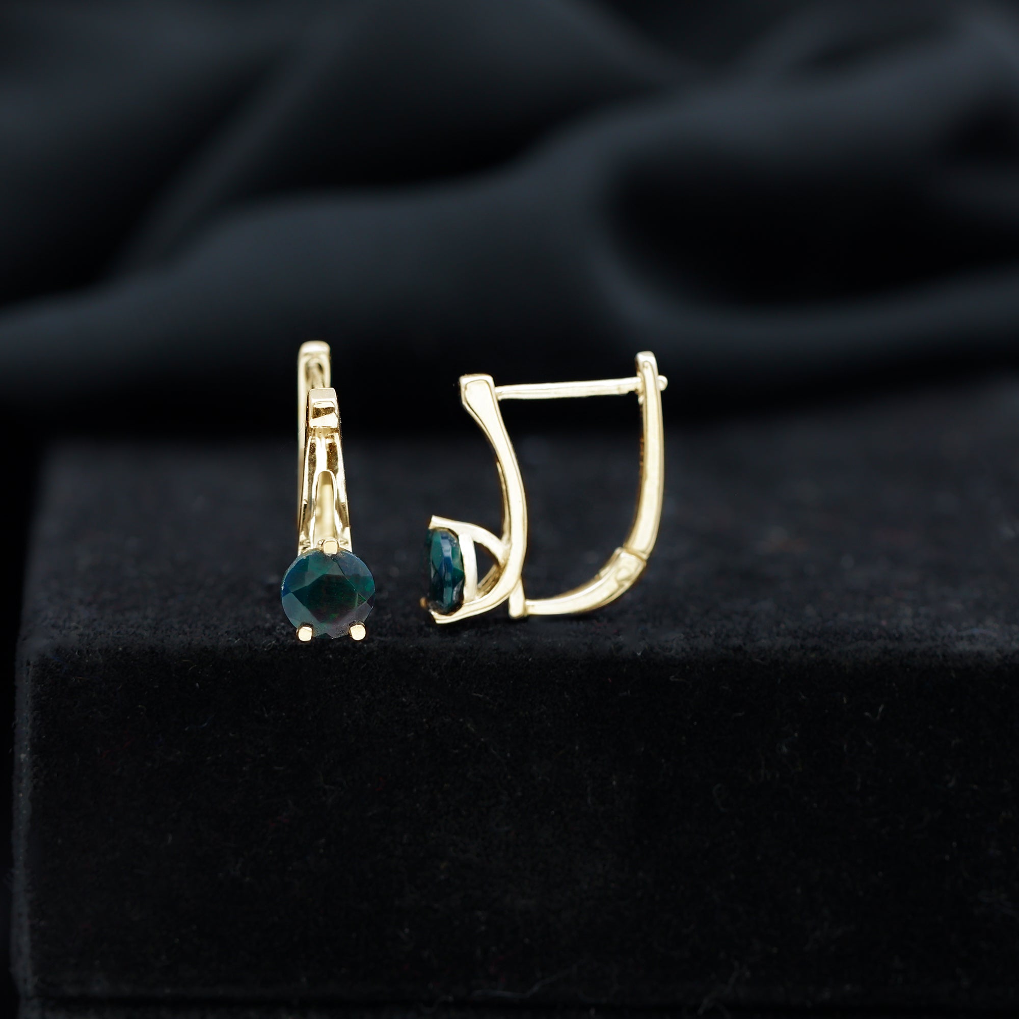 Surprise your special someone with these charming J hoop earrings, featuring a solitary round-cut Black opal gemstone set in a three-peg head setting and a solid gold lever-back finding. These Black Opal earrings are both elegant and simple, making them the perfect gift.