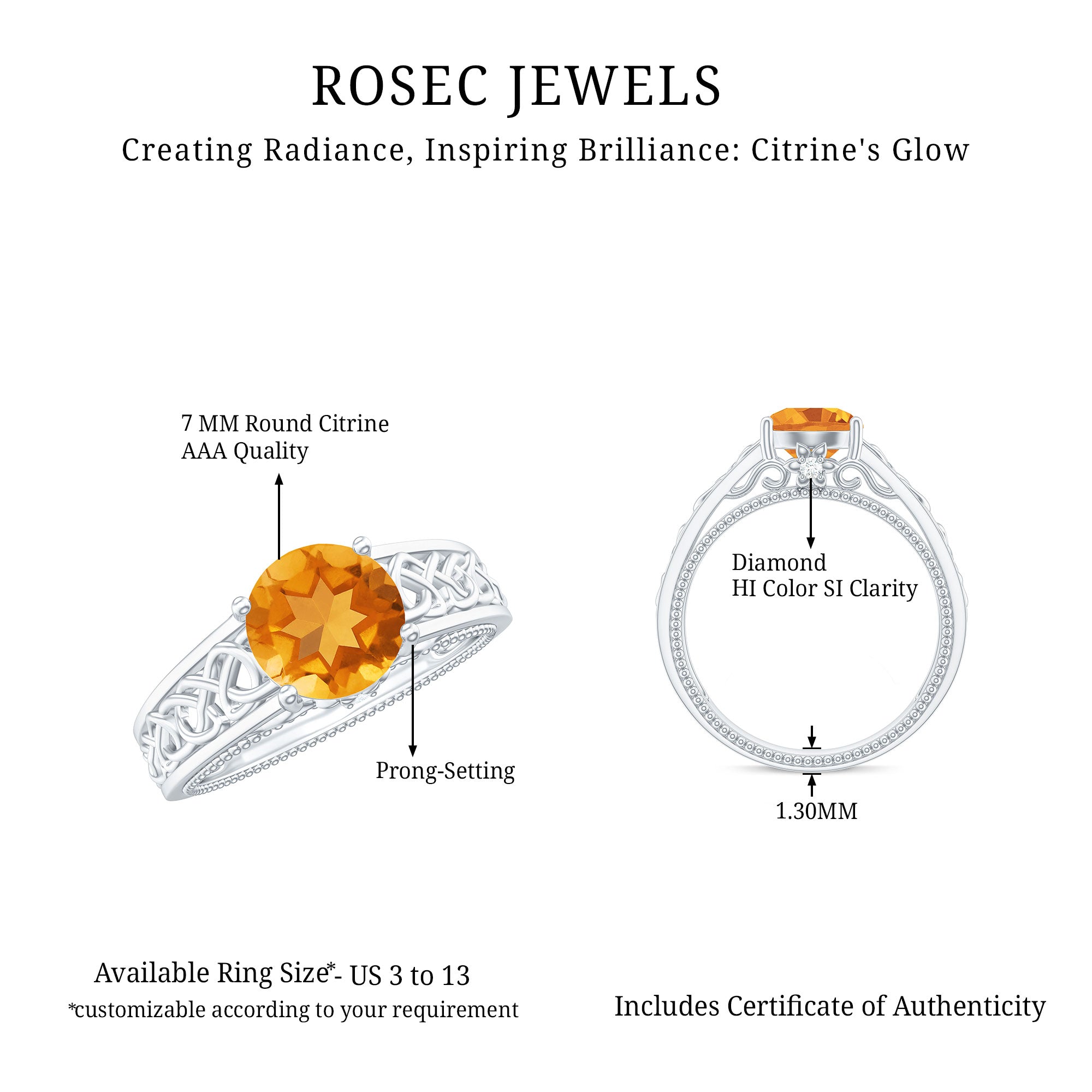 Enhance your attire for any special occasion with the stunning Solitaire Band featuring a Round Shape Citrine and delicate Round Shape Diamond stones. The Band Ring is skillfully crafted with Gold and intricate Celtic Details that add to its charming appeal.