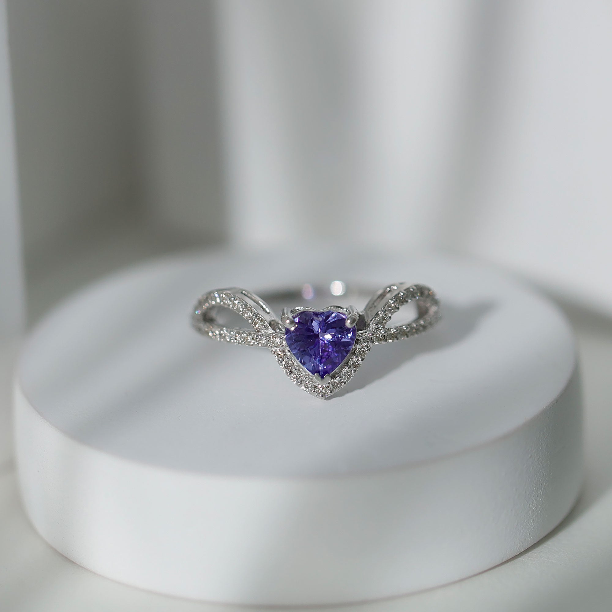 Give a flair of elegance to your look with this Designer Solitaire Ring adorned with Heart Shape Tanzanite set as Solitaire in a Prong Setting with Diamond Accent and Split Shank design gives this ring a amazing look, crafted in Gold, this designer Ring is a timeless treasure.