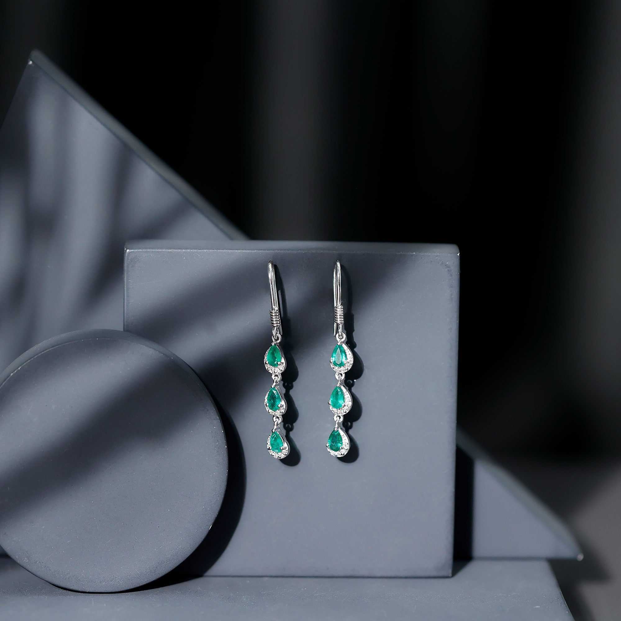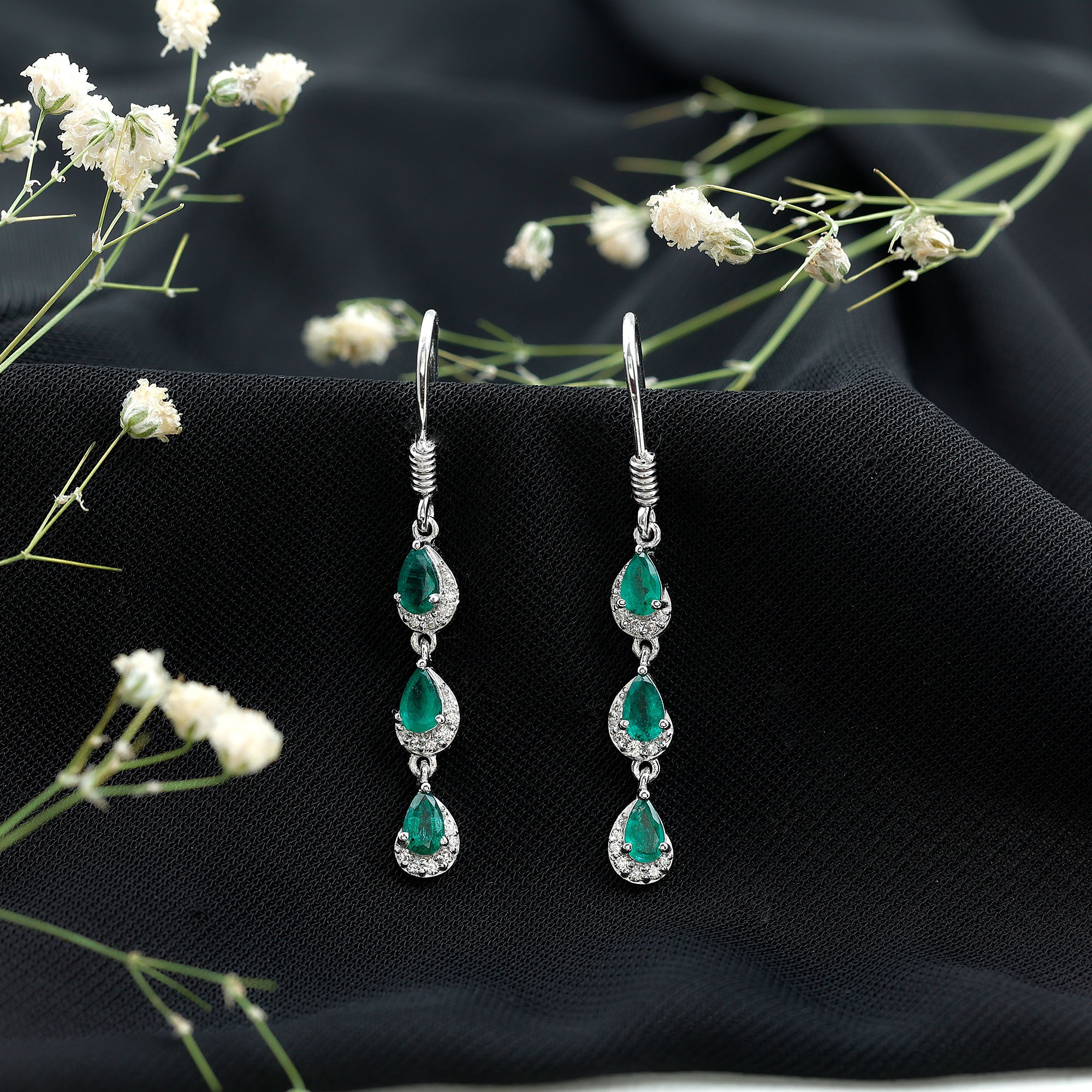 1.50 CT Pear Cut Emerald Dangle Earrings with Diamond