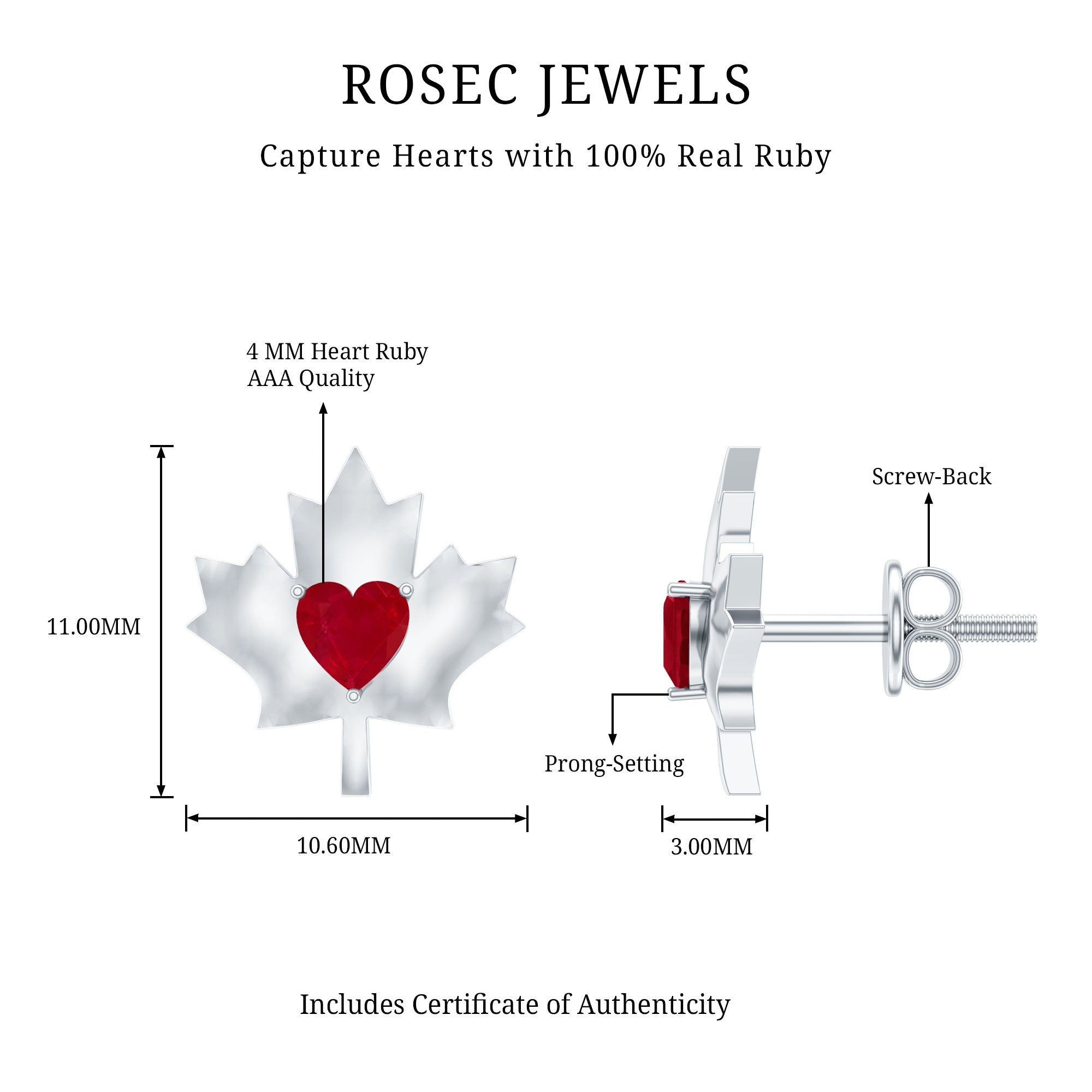 1 CT Maple Leaf Stud Earrings with Heart Shaped Ruby
