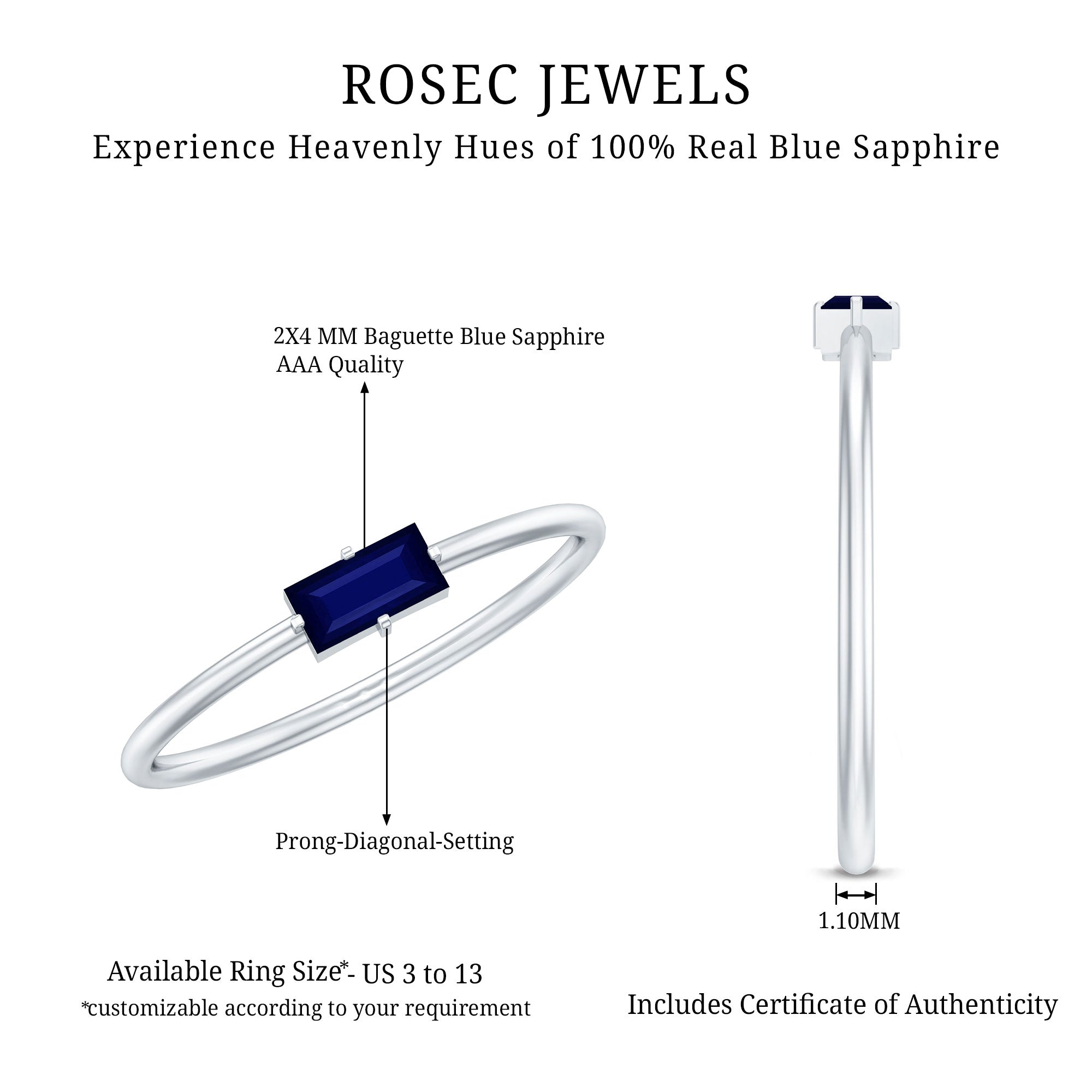 2.5X5 MM Baguette Cut Blue Sapphire Solitaire Ring in 4 Prong Diagonal Setting