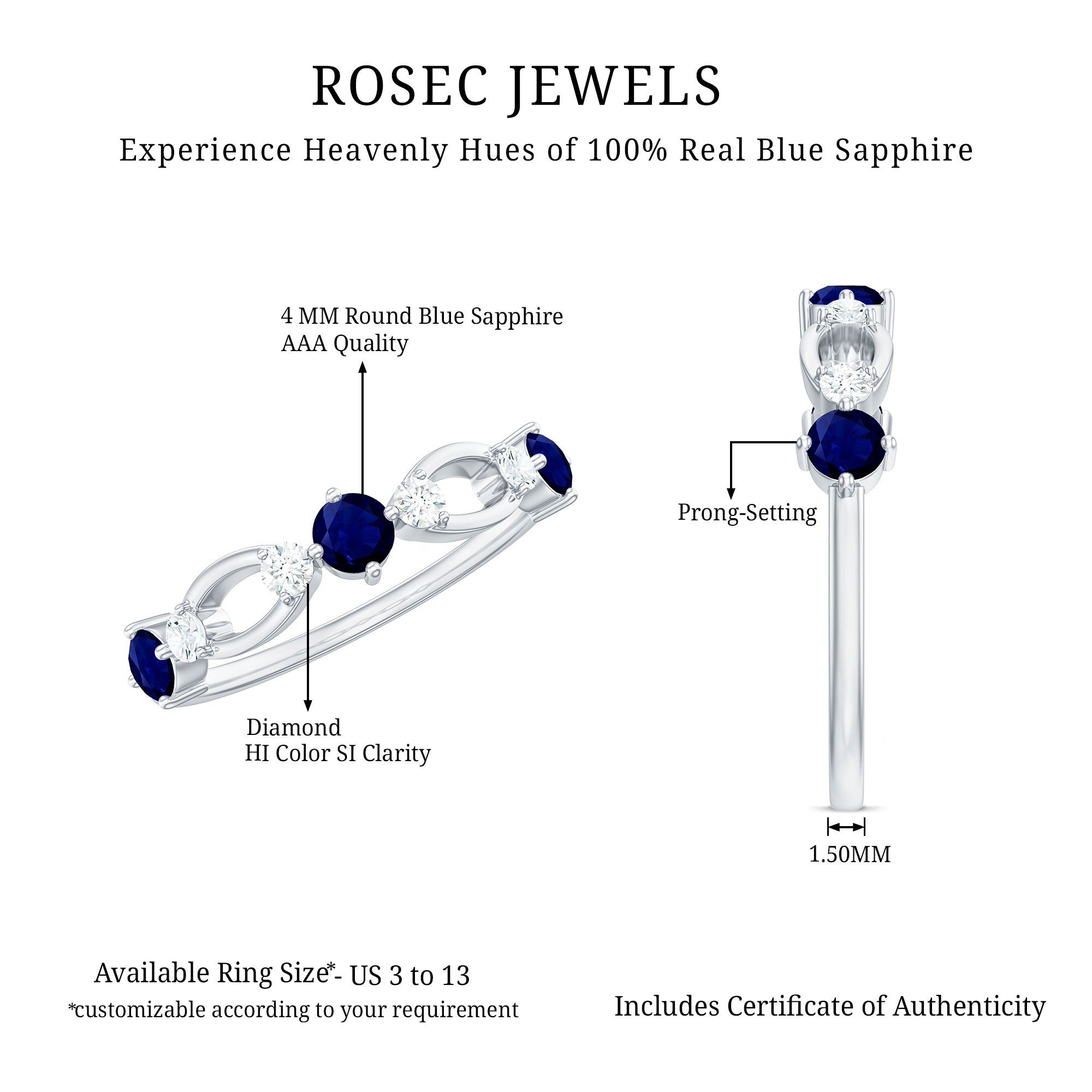 This sleek and elegant Half Eternity Ring has Round Shape Blue Sapphire in Prong Setting and Diamond is a stunning gemstone jewelry for you.