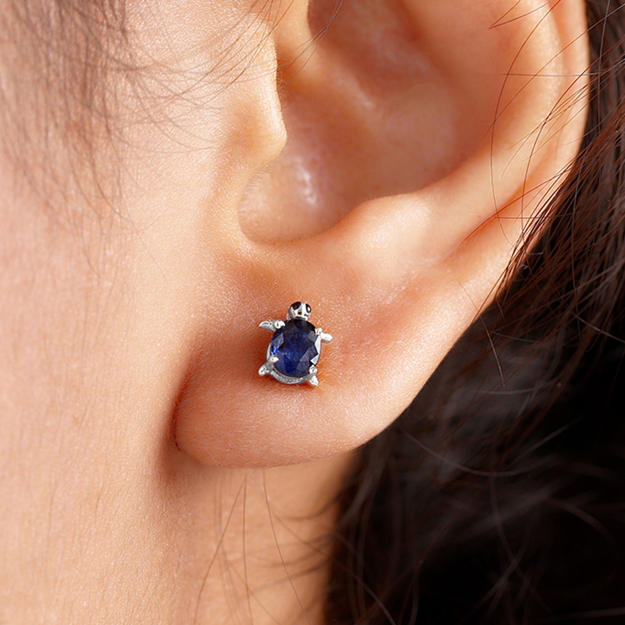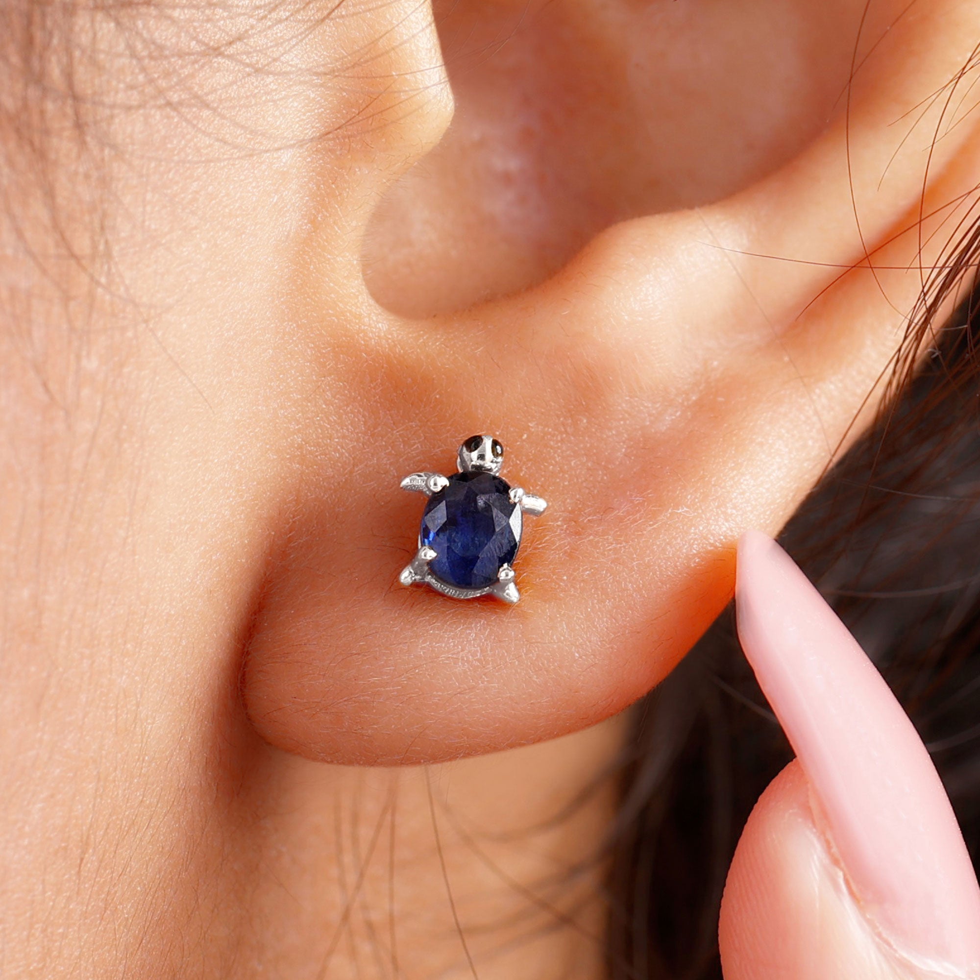 Surprise her with the cute Turtle Stud Earring. Adorned with an Oval Cut Blue Sapphire, this Blue Sapphire Solitaire Stud Earring is a unique and adorable piece for a woman. Perfect for a special occasion or just to show your love, this earring is sure to bring a smile to her face. With its charming design, this stud earring is a wonderful present that she will treasure for years to come. Make her day even more special with the Turtle Stud Earring.
