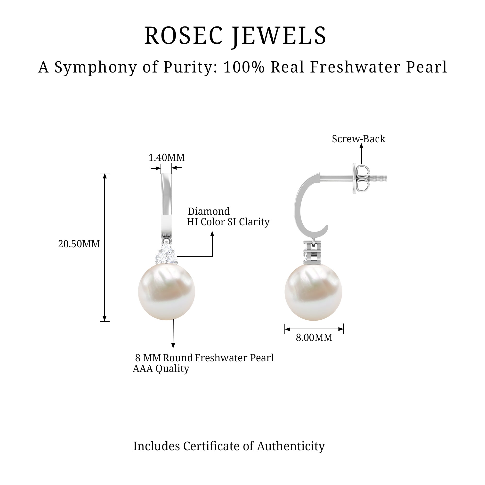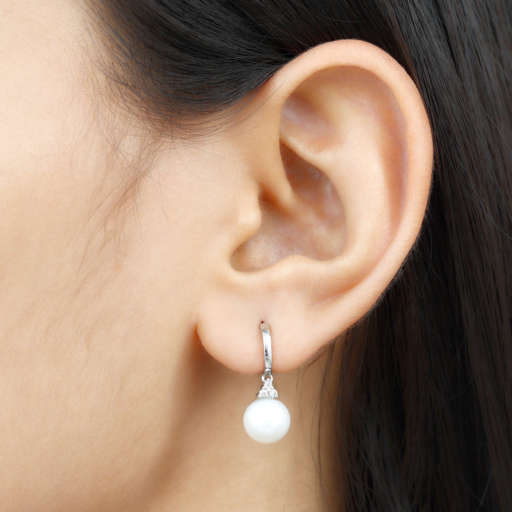 The Hoop Earrings feature Prong Set Round Diamond Trio and 8 MM Round Shape Freshwater Pearl in Bead Setting as Solitaire. The Wedding Hoop Earrings are a perfect Wedding Day gift for your beloved.