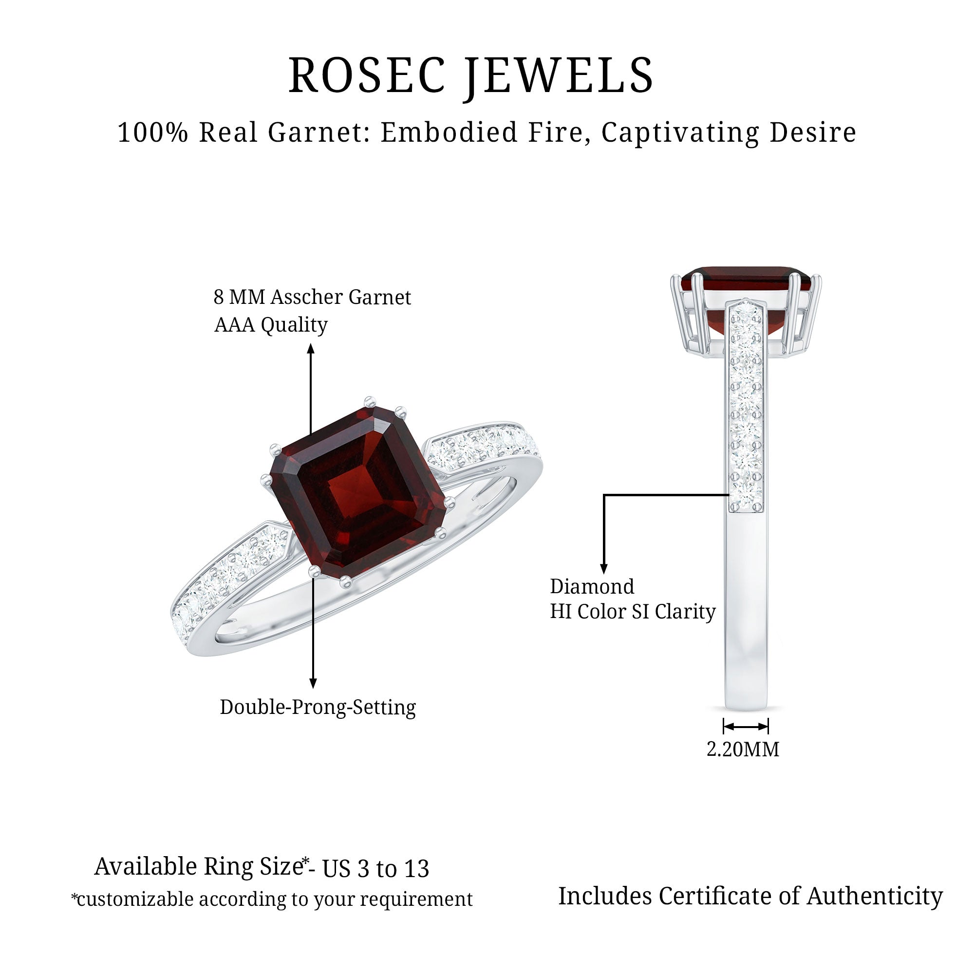 Mark your forever with this Asscher Cut Engagement Ring, a bold yet timeless symbol of your eternal love. The deep, captivating 8 mm Asscher Cut Garnet set in Double Prong Setting, draws the eye with its rich red color, a perfect reflection of the passion you share. Its angular lines and elegant facets create a stunning play of light, while the Diamond Side Stones add a touch of sparkle, enhancing the natural beauty of Garnet without overshadowing it. This exquisite design blends classic charm with a modern edge, making this Garnet Engagement Ring the perfect piece for someone who wants their love story to shine brightly and uniquely. With its thoughtful balance of warmth and elegance, this Garnet Diamond Ring is ready to make the most special moment of your life even more unforgettable. Available in various sizes and presented in a signature jewelry box, this Solitaire Engagement Ring is the perfect choice for a proposal or a celebration of love that is meant to last.