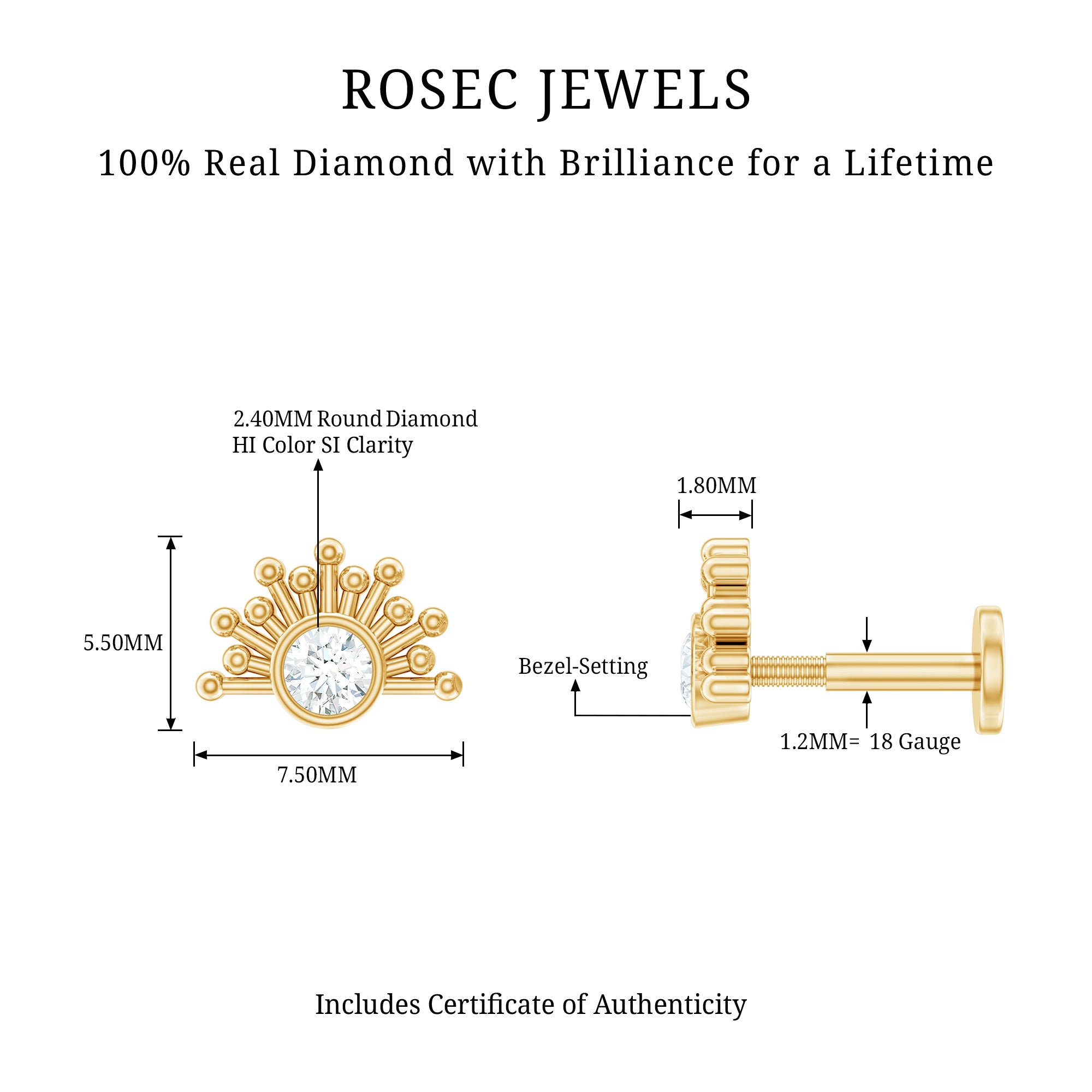 This Diamond Gold Sunburst Earring features a Round Cut Diamond set in a bezel setting as the centerpiece, creating a unique and elegant design. The Diamond is showcased as a Solitaire, making it a stunning and eye-catching accessory. You can wear this Piercing Earring on your Helix, Cartilage, Tragus, Conch, or Upper Lobe Piercing.