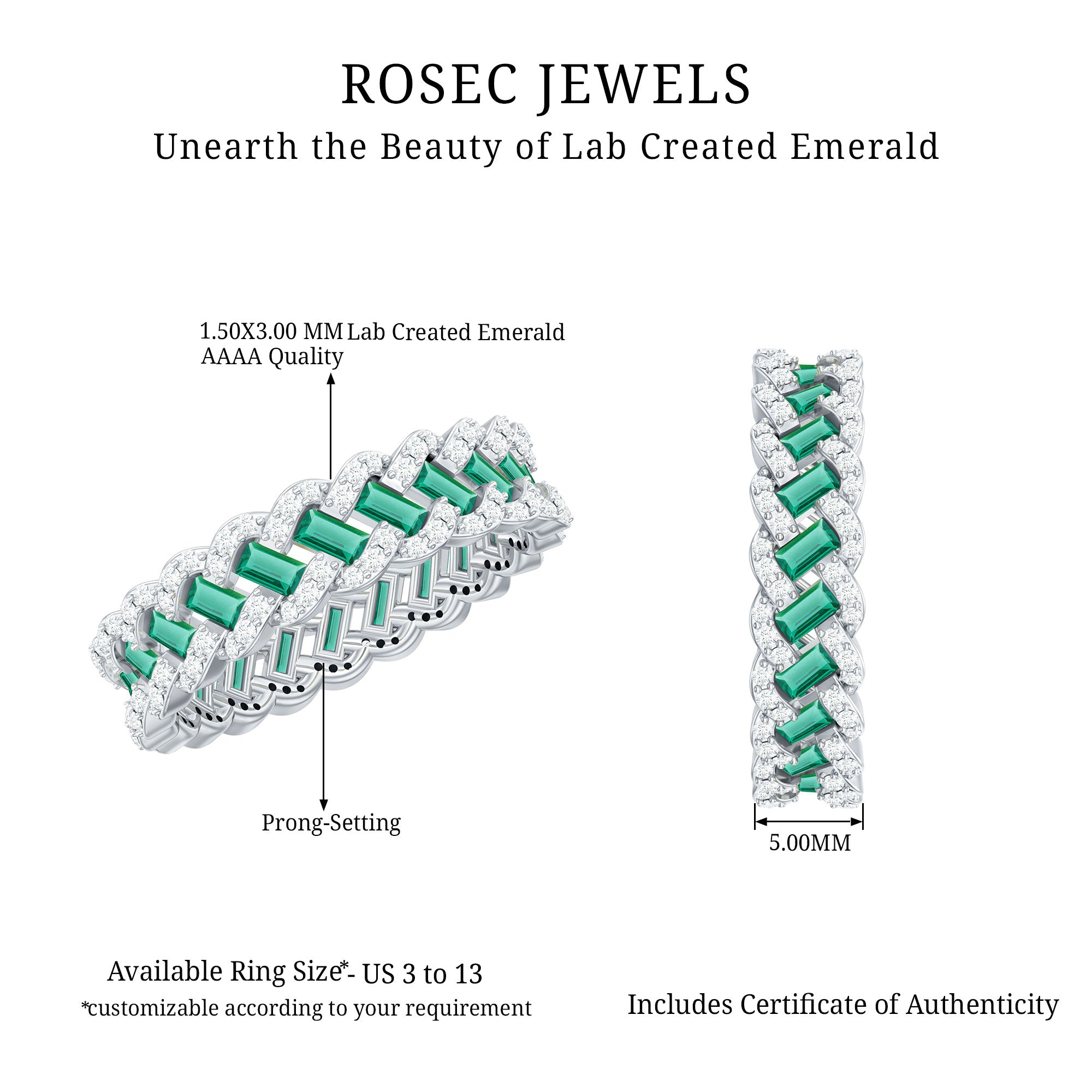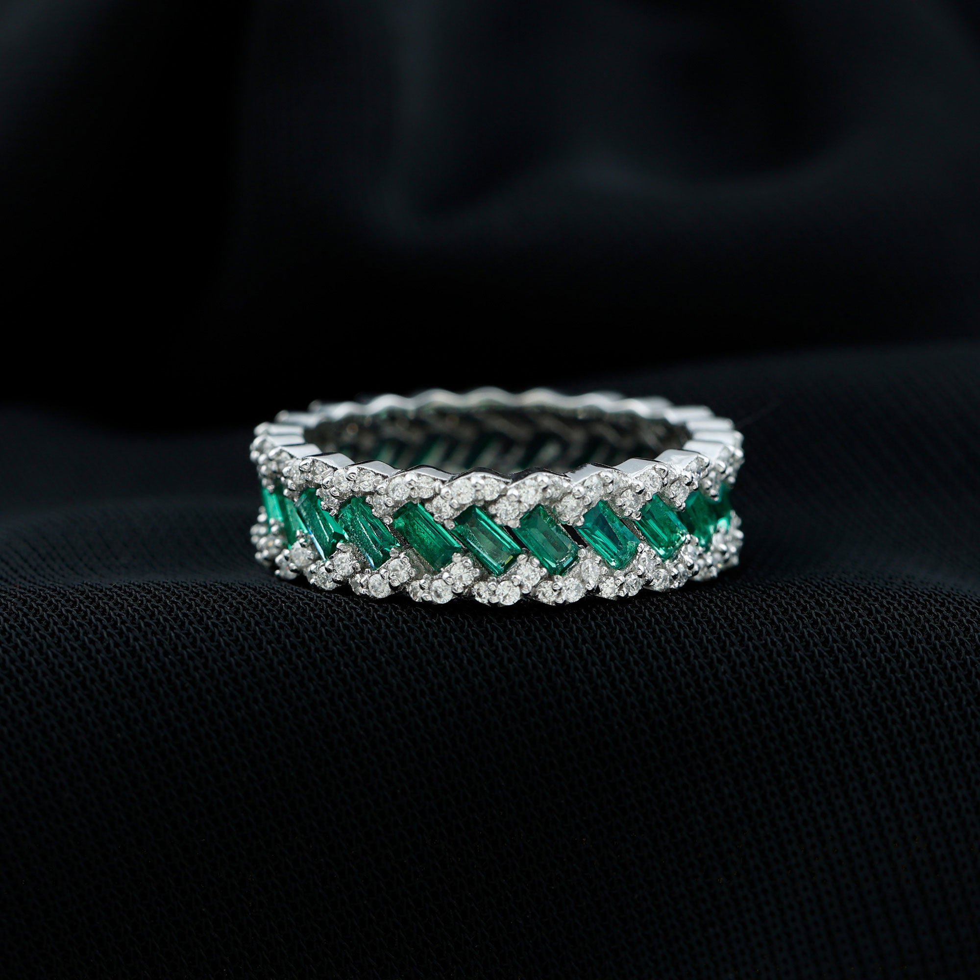 Delight in the enchanting allure of our Anniversary Ring, an irresistible accessory that will captivate your partners heart. This Wedding Anniversary Band showcases Baguette Created Emerald gemstones at its center, and the braided shank is adorned with the brilliance of Round Shape Moissanite, enhancing its beauty. This Eternity Wedding Ring beholds the unmatchable shine of AAAA Quality Lab Grown Emerald and D-VS1 Quality Moissanite which perfectly light up the celebration. The ring will invoke a romantic and timeless charm which makes it an ideal choice to express your love to her. This Emerald Wedding Ring will be a classic choice to start a new chapter of life. The Certified Wedding Ring will be shipped to you in a premium pack ensuring that your feelings attached to this ring are safe and secured.