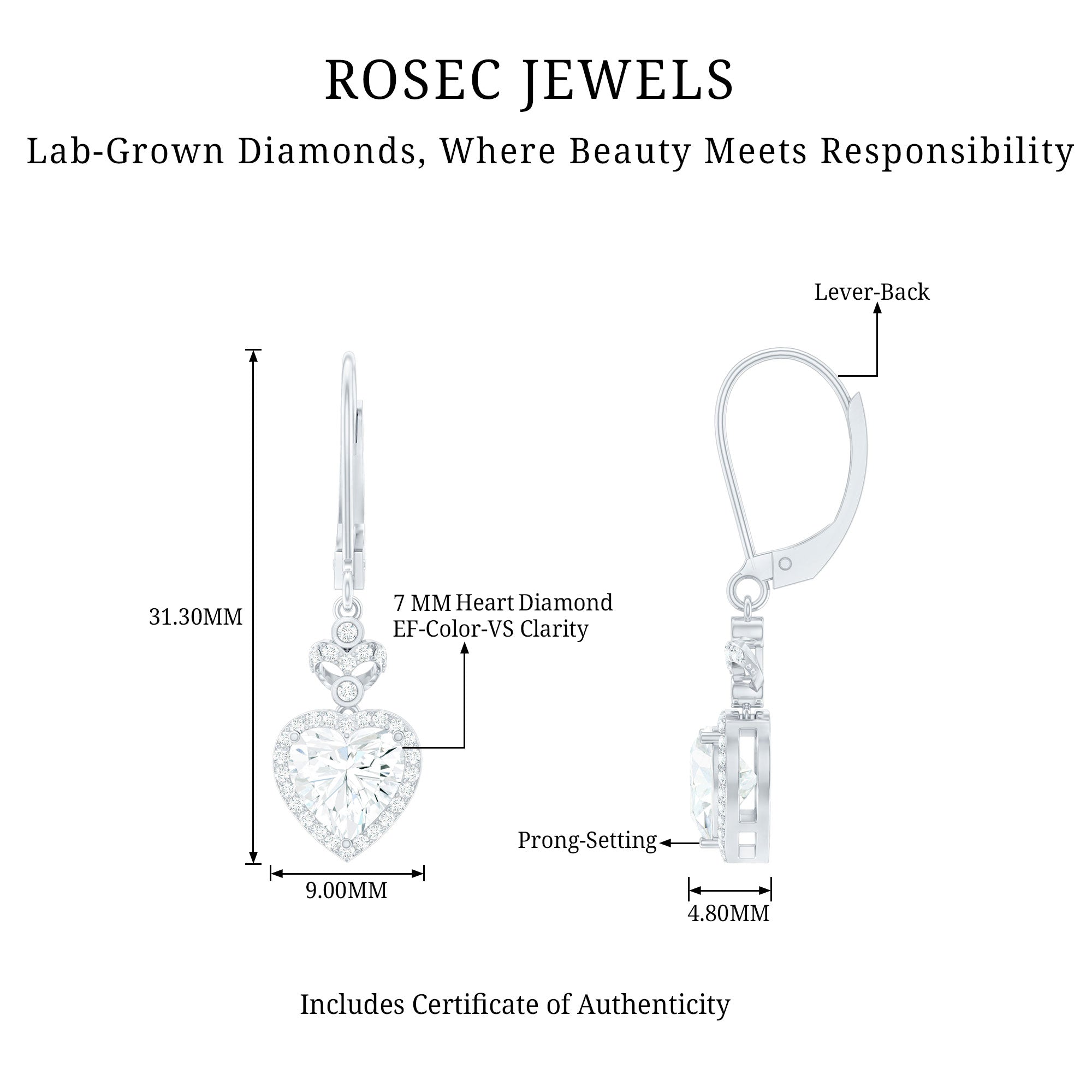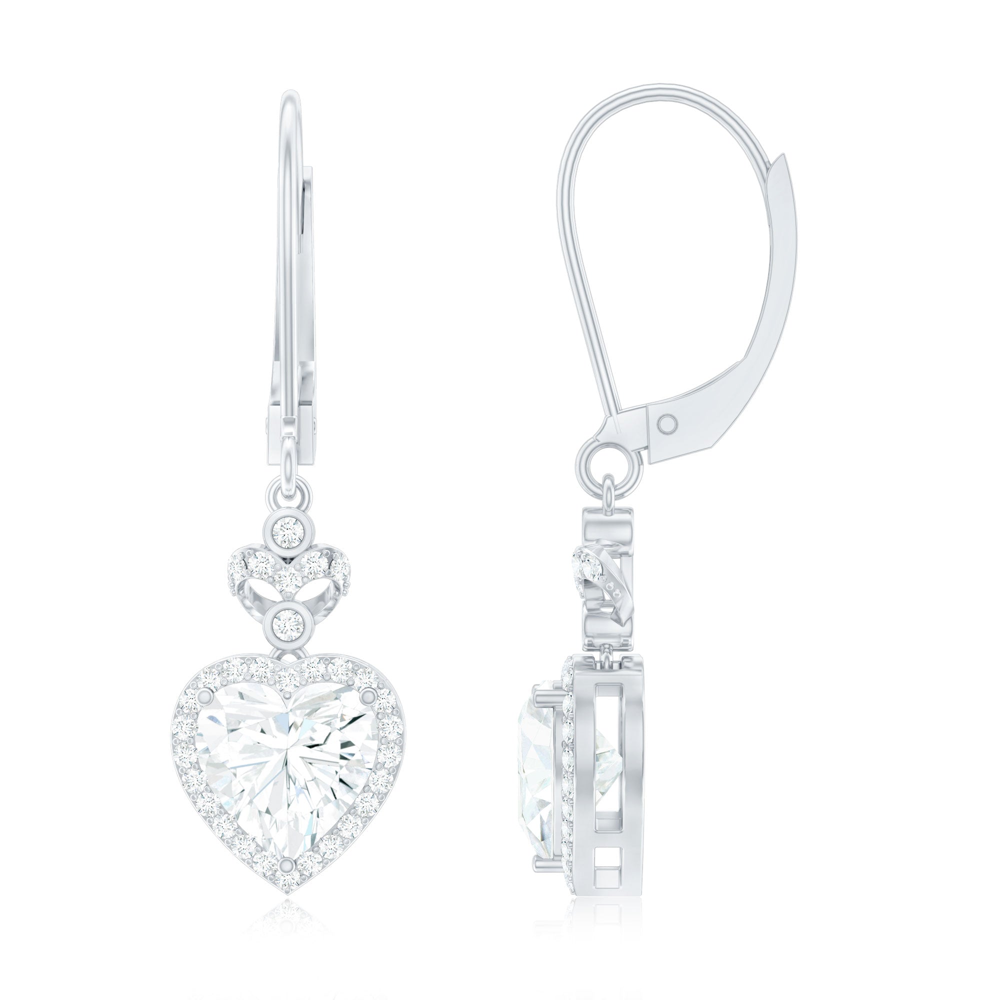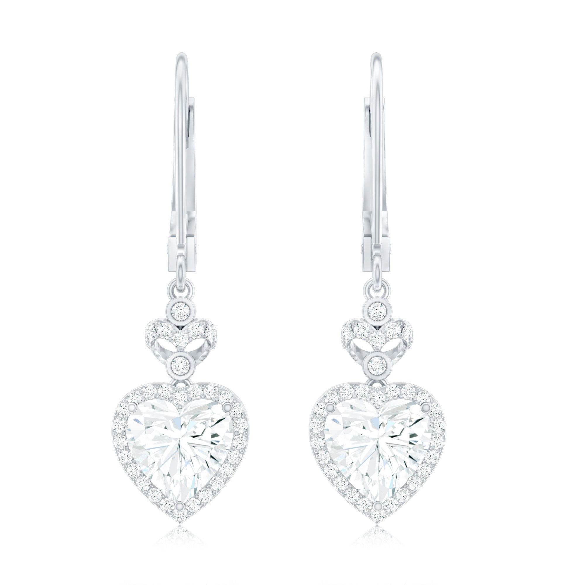 Celebrate love and romance with these breathtaking Heart Drop Earrings, ideal for a bride on her special day. The design features a captivating prong set 7MM heart shape diamond (lab created) as a centerpiece, surrounded by a delicate round cut diamond halo. Above the main stone, two dainty bezel set diamonds are set with an open heart motif adorned with small stones. The drop style allows the Diamond Heart Earrings to sway beautifully with every movement, making them a mesmerizing addition to any jewelry collection. Handcrafted with precision, the secure lever back closure ensures a comfortable and snug fit, allowing you to wear them effortlessly throughout the day. They are ideal as Bridal Earrings or a thoughtful Anniversary Gift for Her.