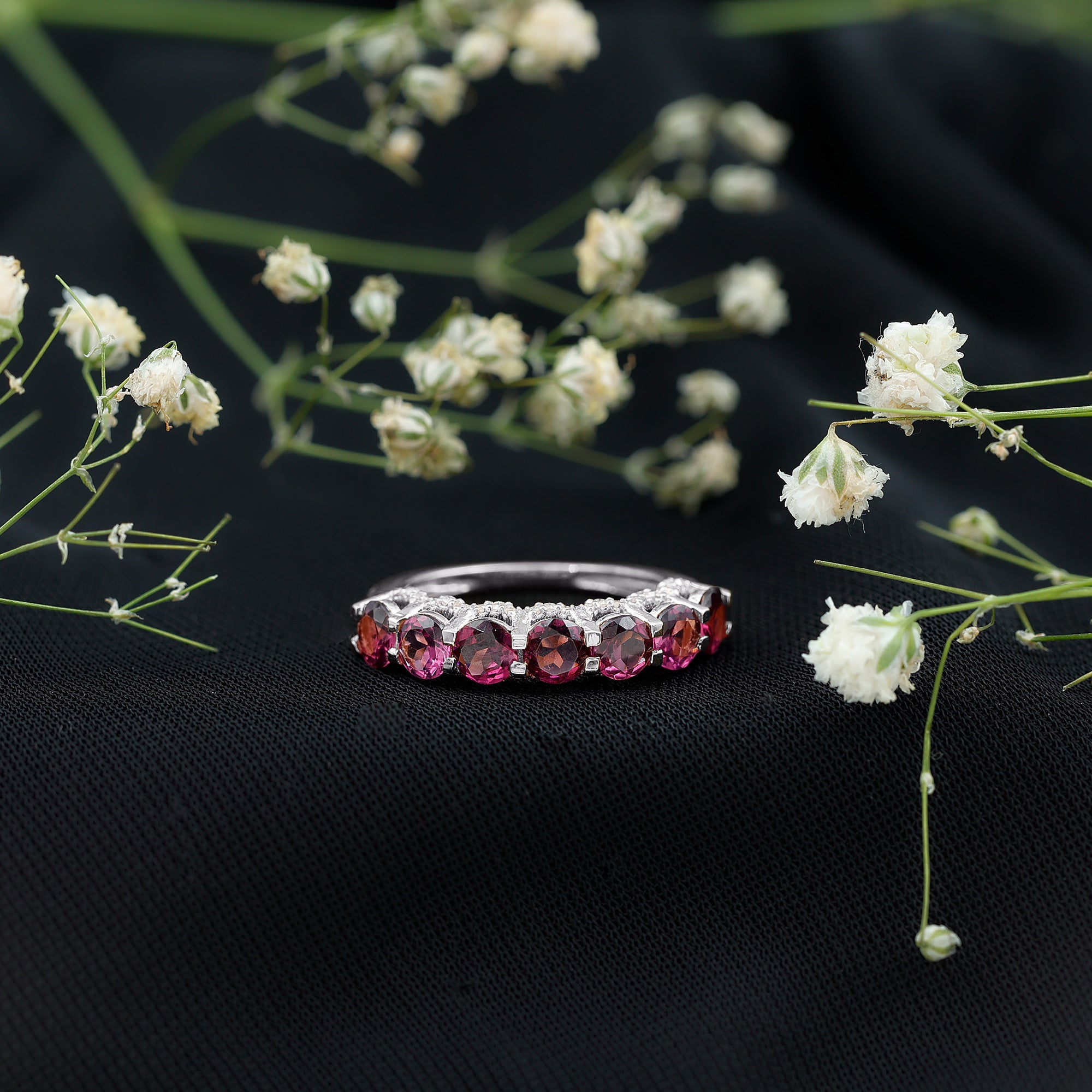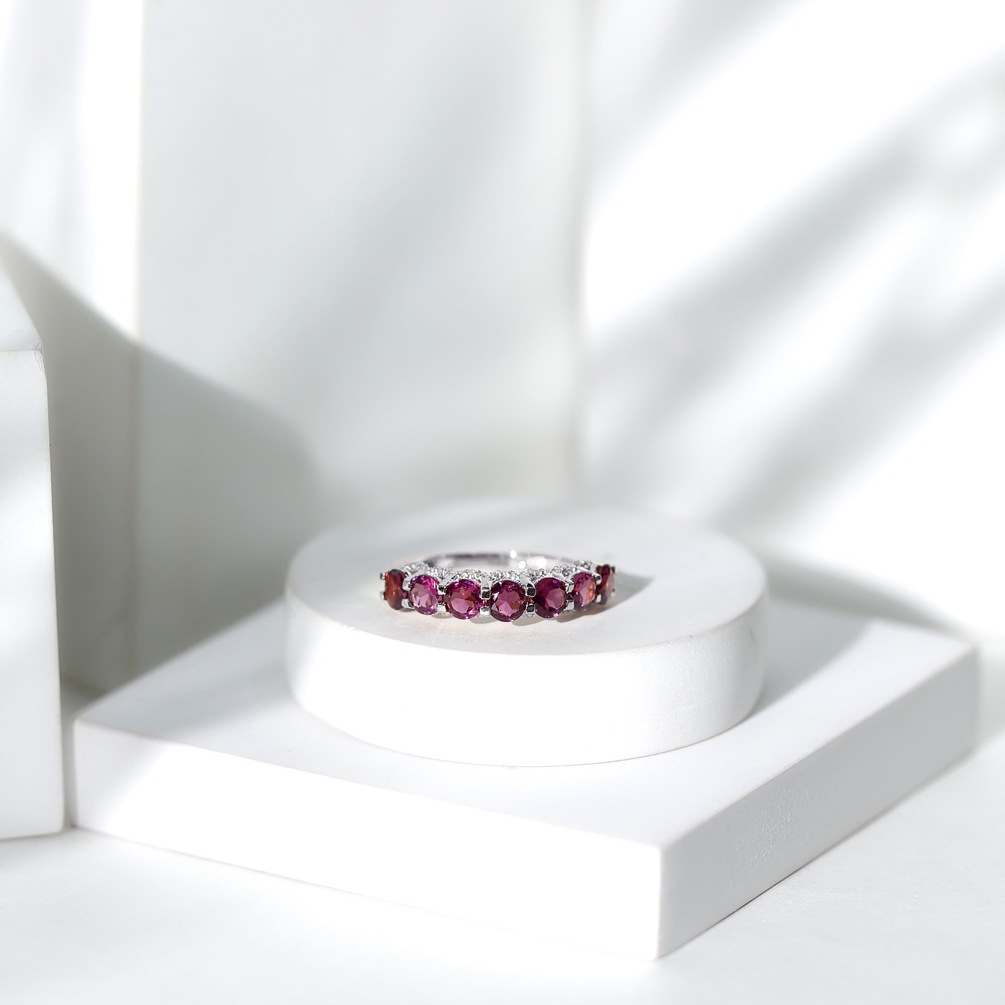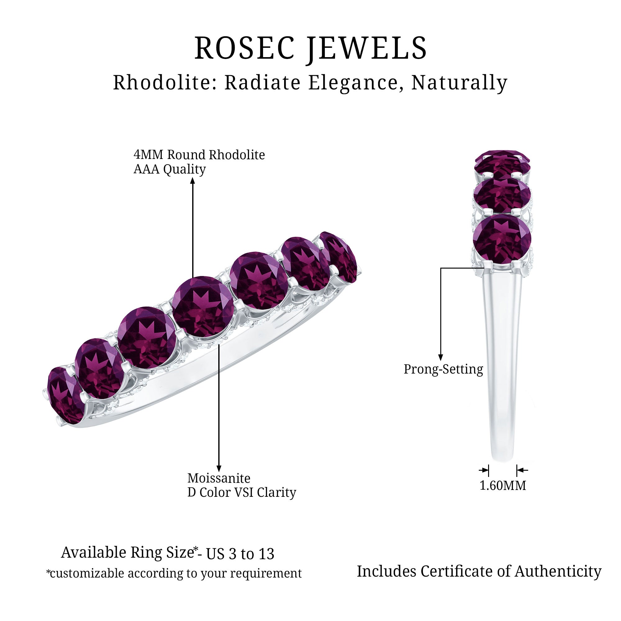 Embracing the half band of this exquisite wedding ring, the dazzling Rhodolite Stones exude an aura of sophistication and elegance. Complementing this, the coastal crescent motifs, gracefully adorned with delicate moissanite stones, infuse a unique and captivating element to the rings edge, intensifying its overall radiance and charm.