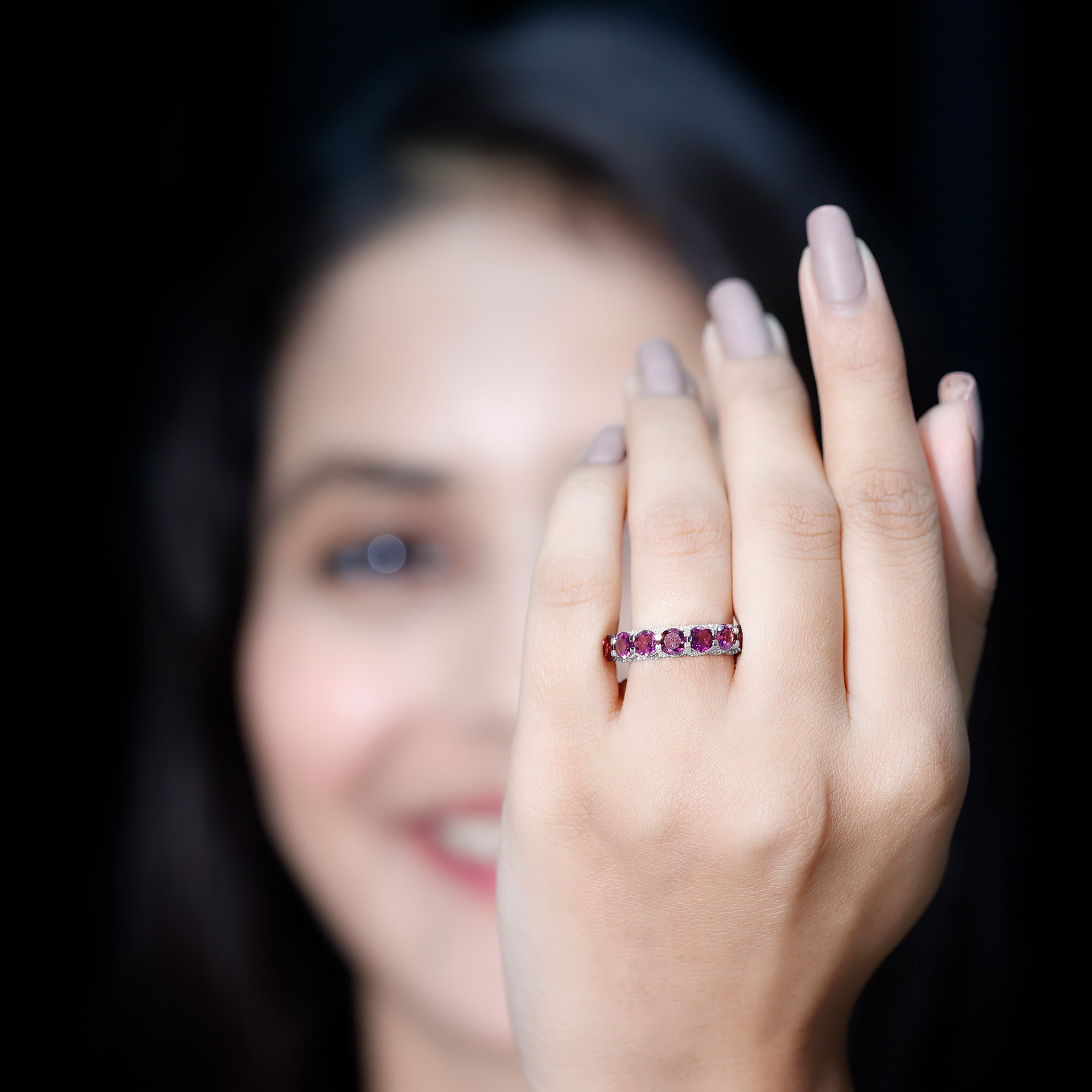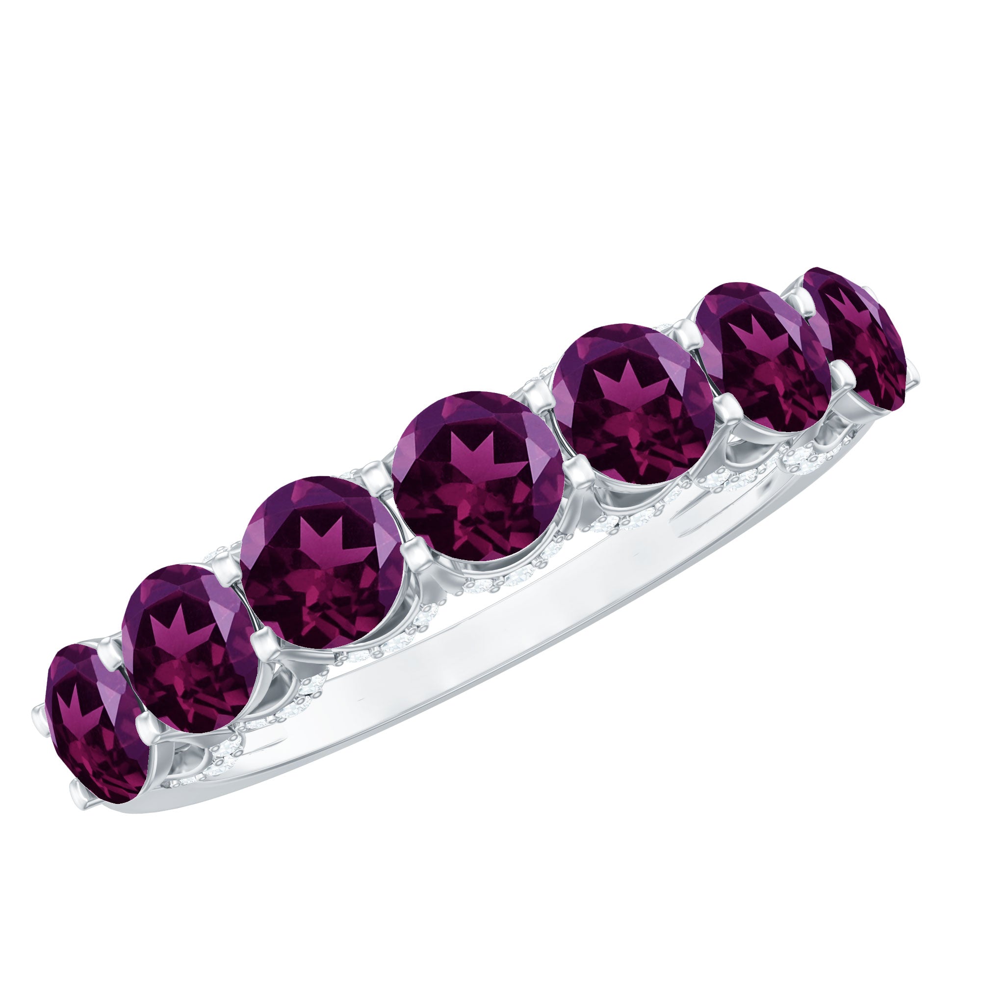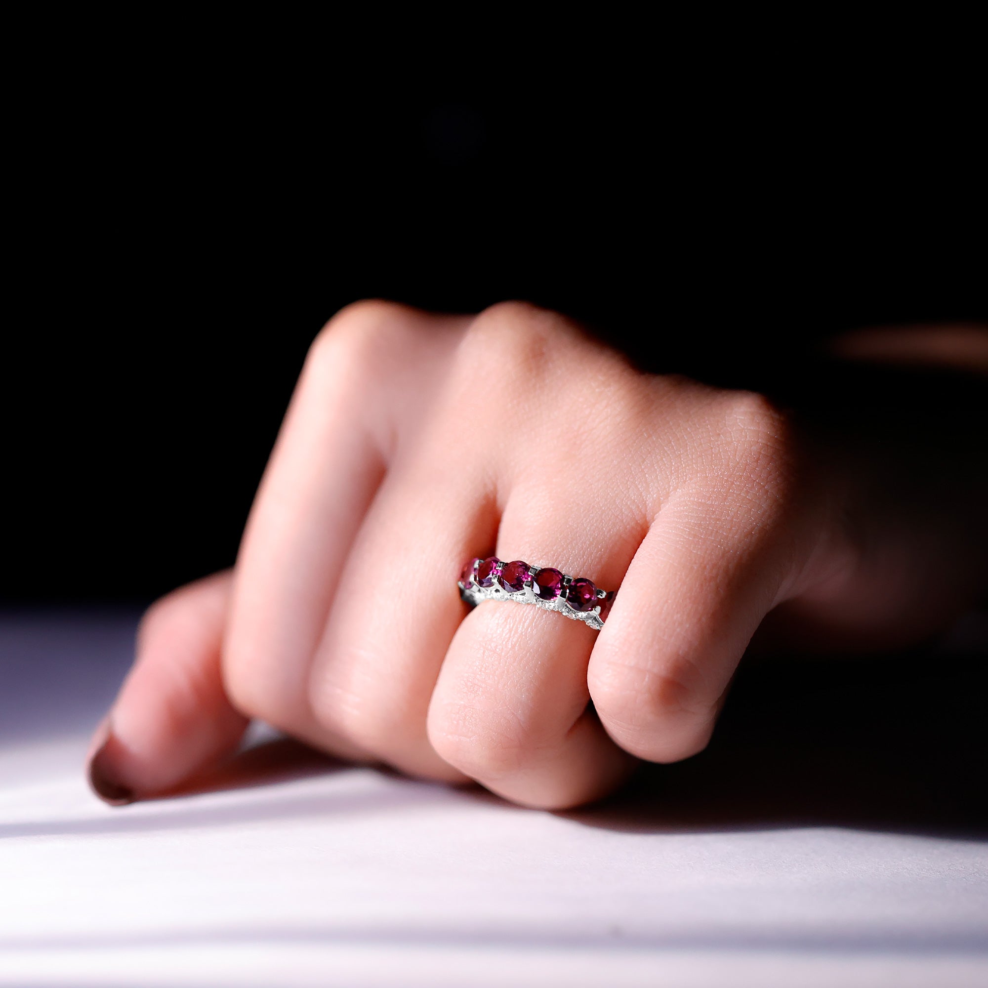 Embracing the half band of this exquisite wedding ring, the dazzling Rhodolite Stones exude an aura of sophistication and elegance. Complementing this, the coastal crescent motifs, gracefully adorned with delicate moissanite stones, infuse a unique and captivating element to the rings edge, intensifying its overall radiance and charm.