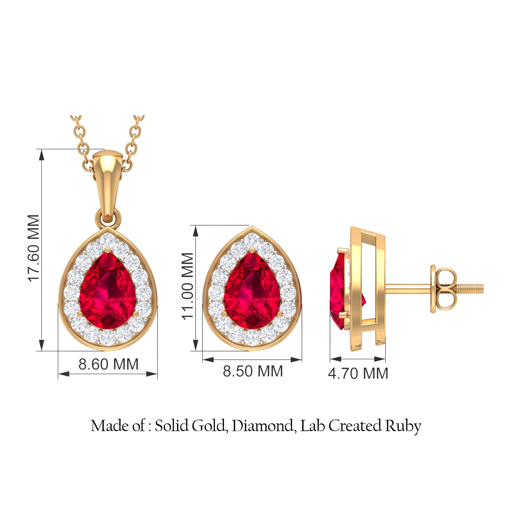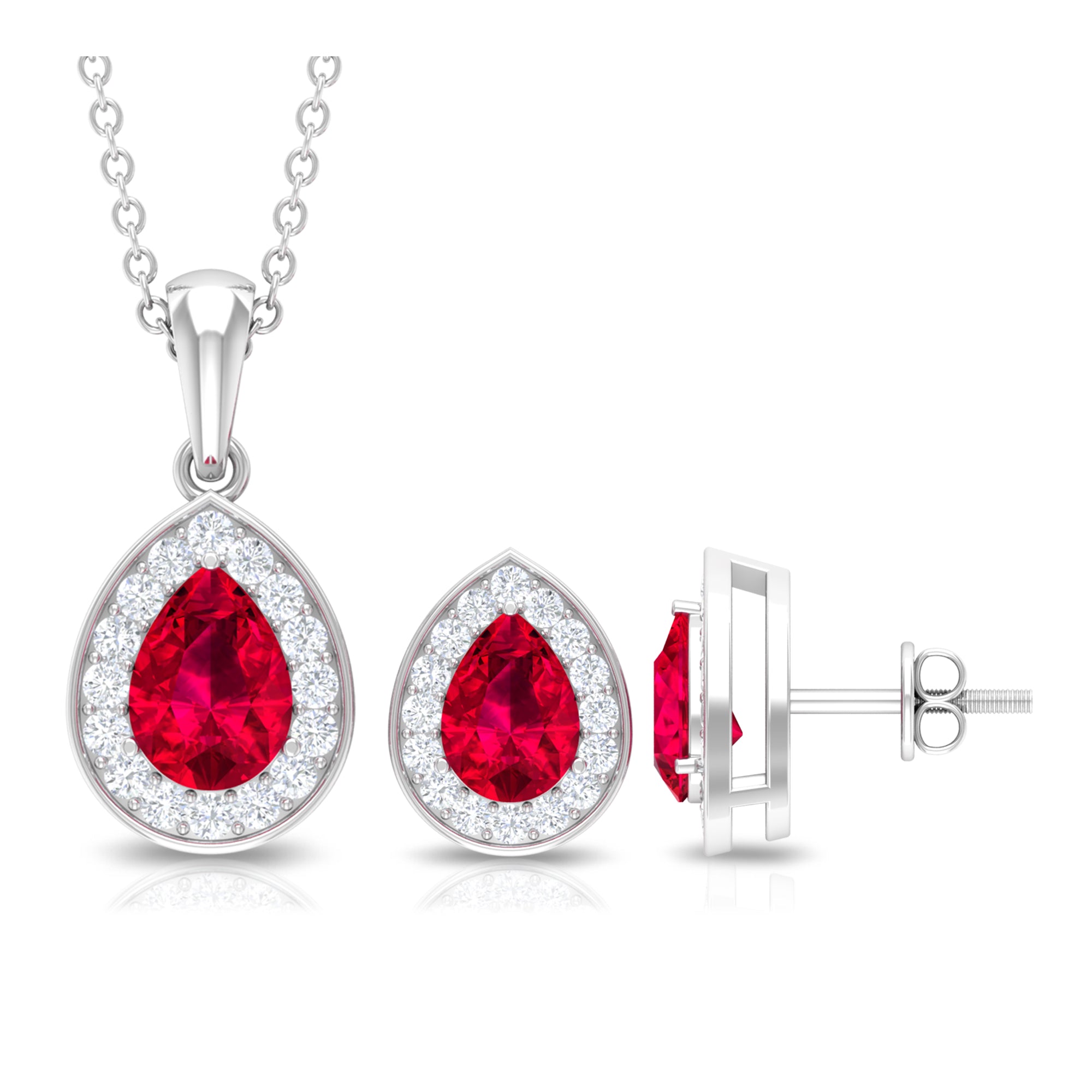 This Earring and Pendant Set takes its inspiration from Art Deco design, featuring a Pear-Shaped Created Ruby Pendant and Created Ruby Stud Earrings. The Jewelry Set is embellished with a dazzling Moissanite Halo, adding a magnificent touch to the Created Ruby Jewelry Set. This Party Wear Jewelry Set is an essential addition to every womans collection.