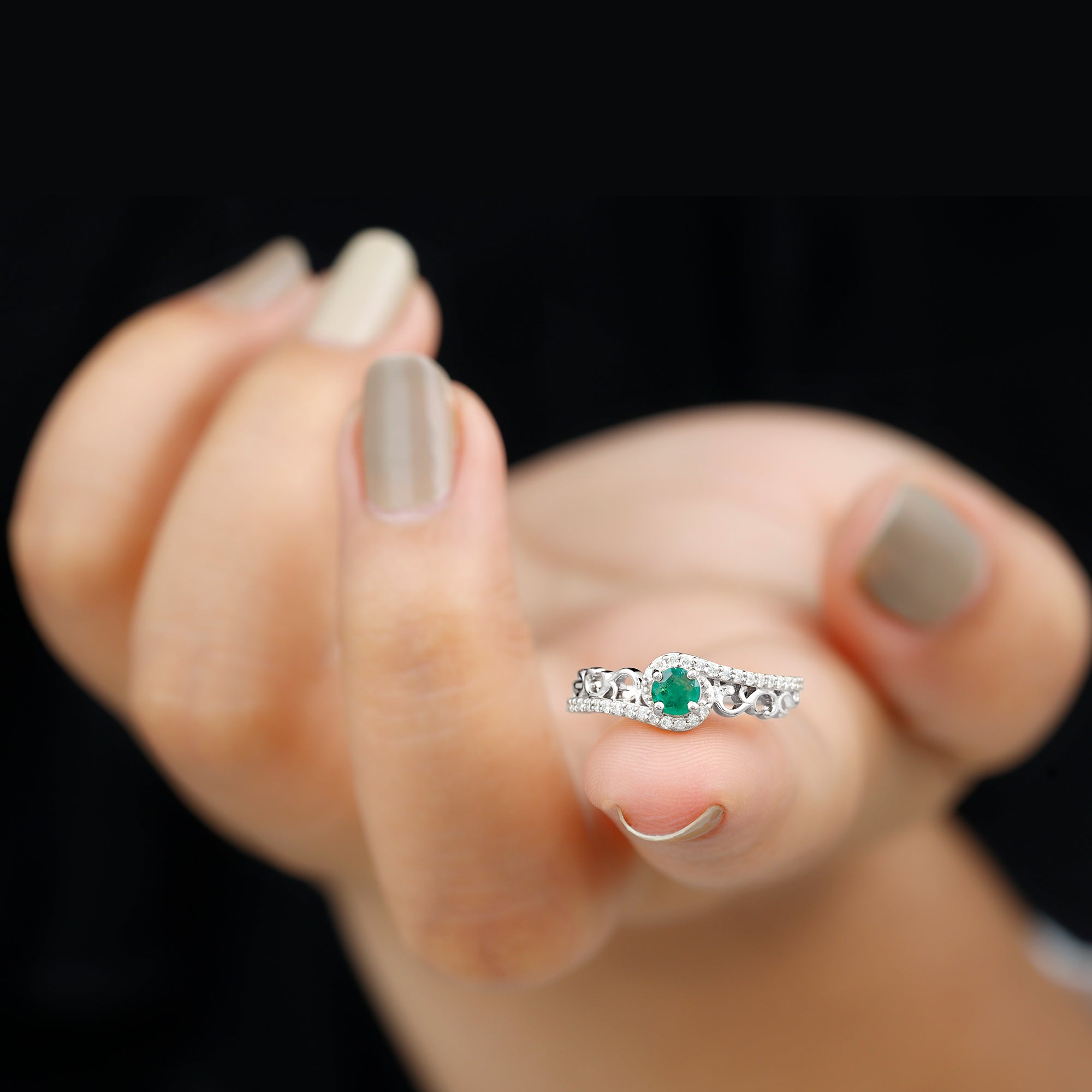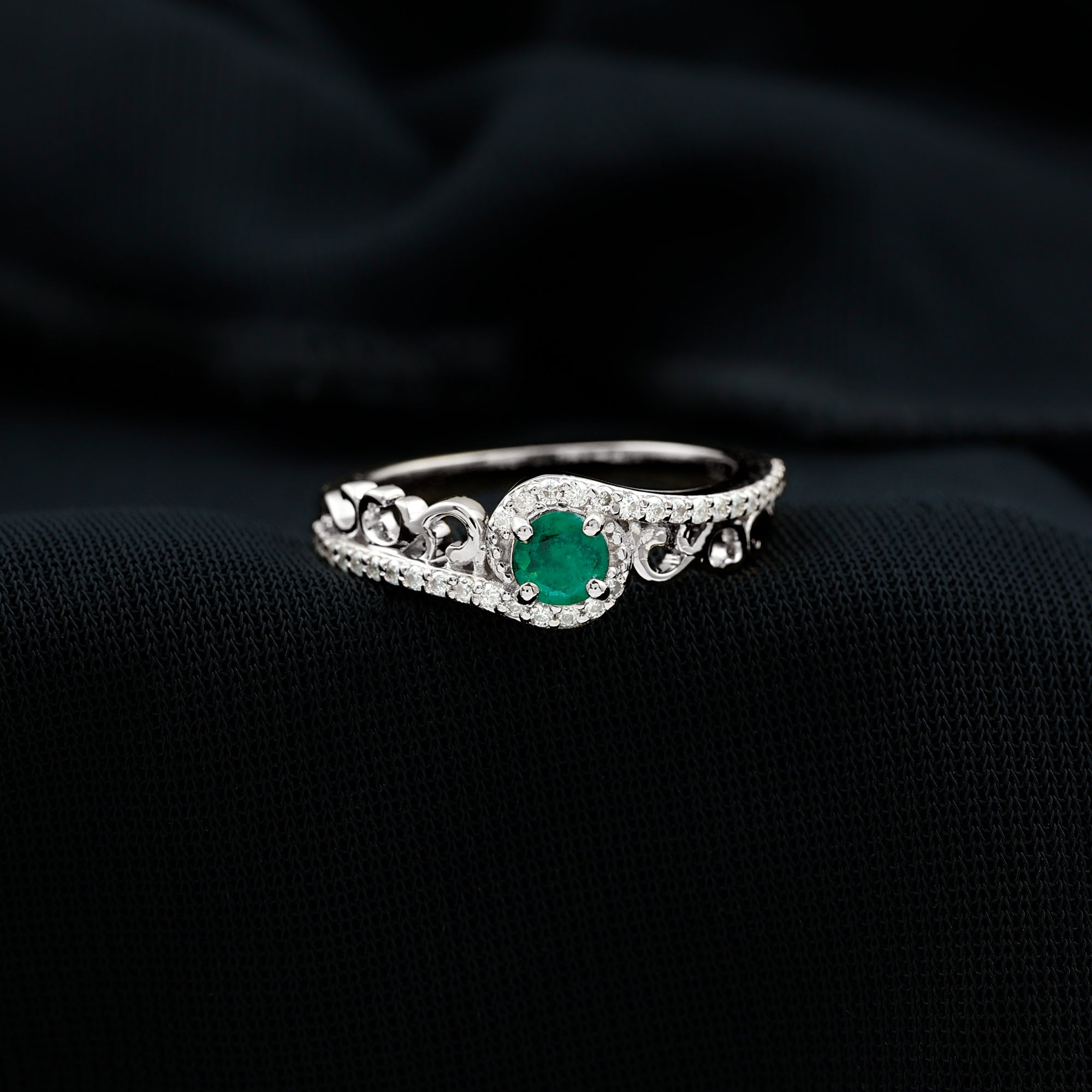 This stunning Designer Ring is truly captivating. The stunning round-cut emerald takes center stage, held securely in a claw setting, while Diamond accents grace the designer bypass shank of this solitaire engagement ring, creating a beautifully subtle statement piece.