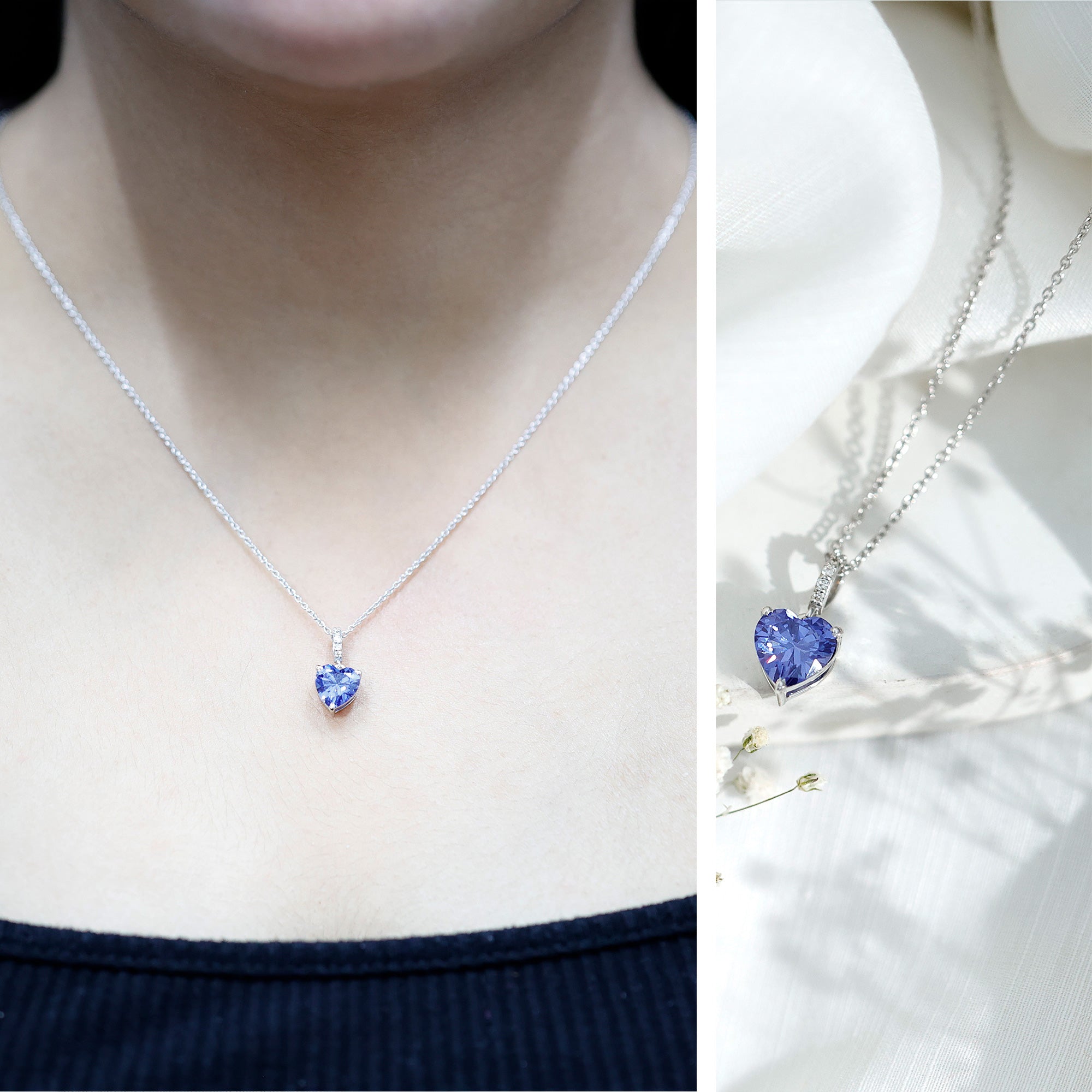 Embrace the breathtaking beauty of this exquisite drop pendant, where a heart-shaped created blue sapphire takes center stage within a dazzling diamond halo. The mesmerizing created blue sapphire captures the spotlight with its magnificence, while graduating round diamonds gracefully enhance its central presence, lending an aura of sophisticated elegance to the design.