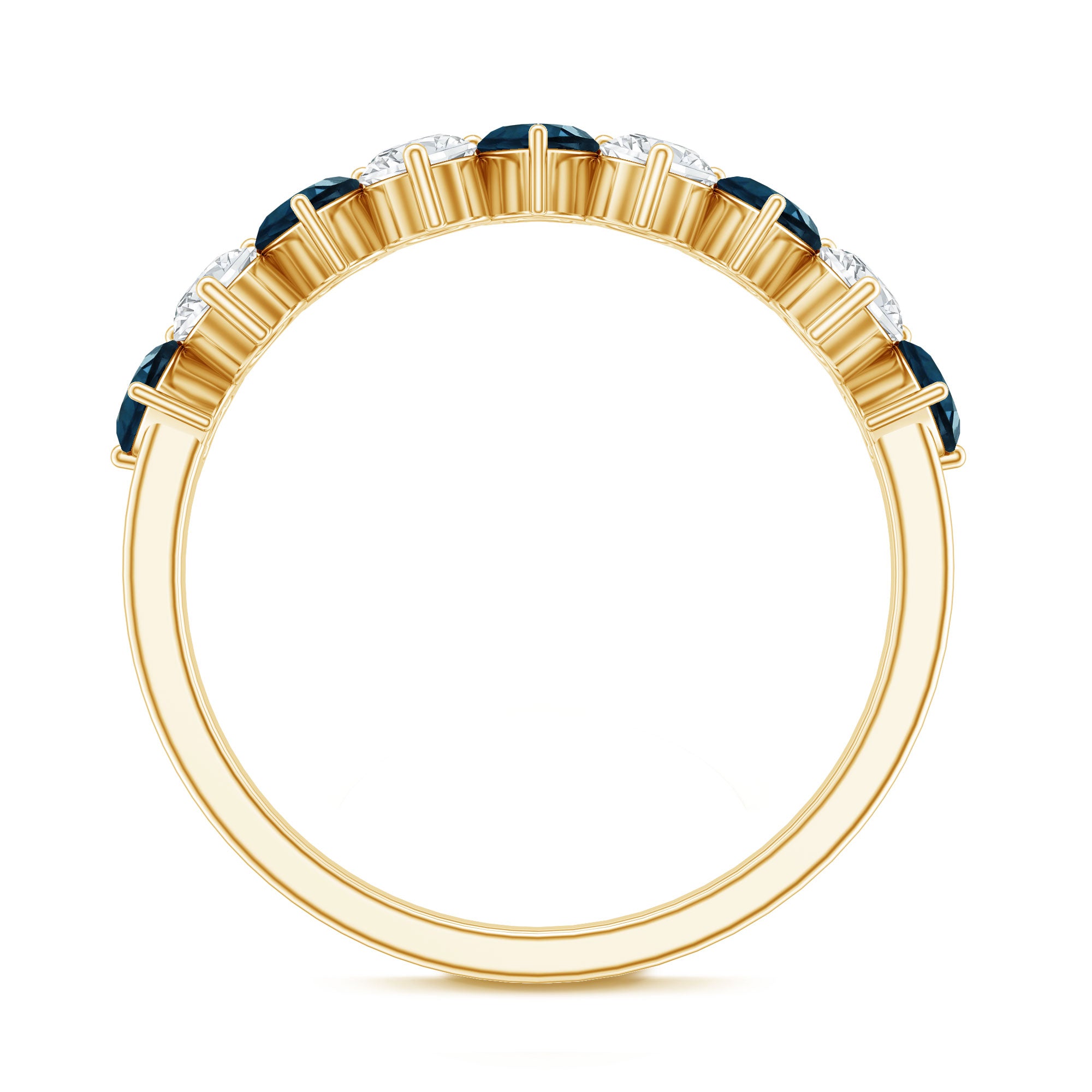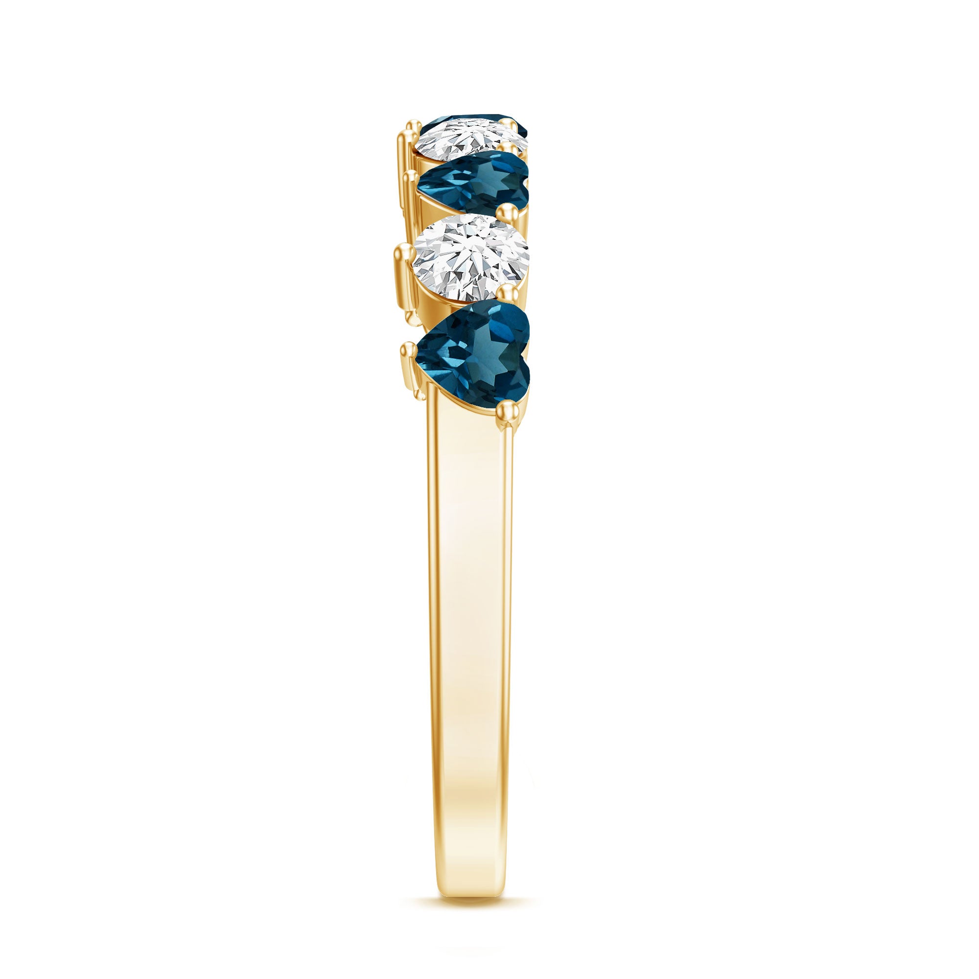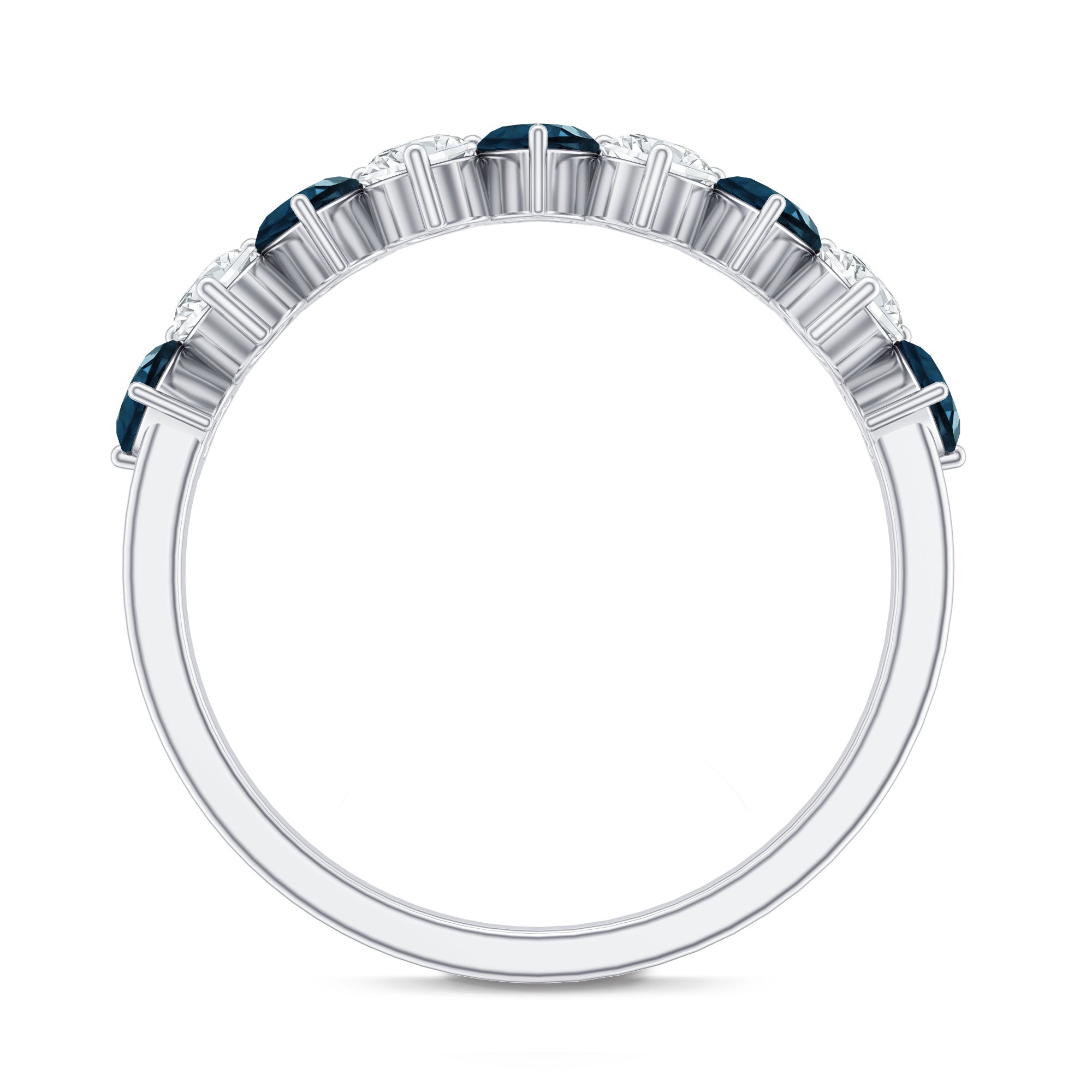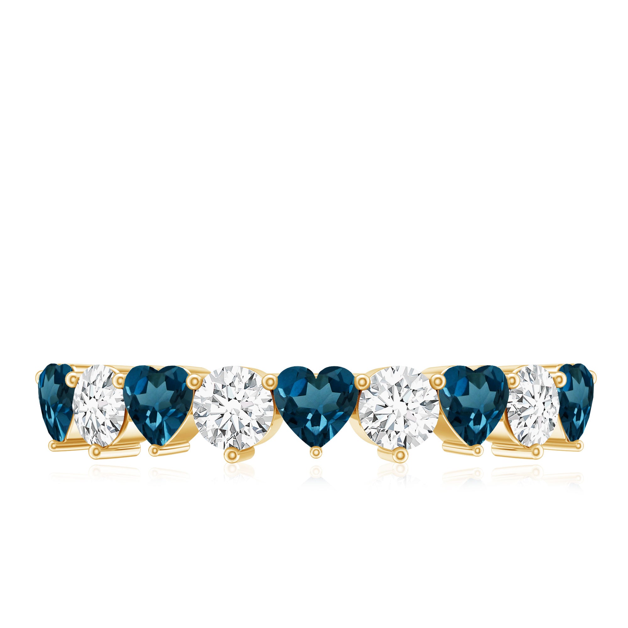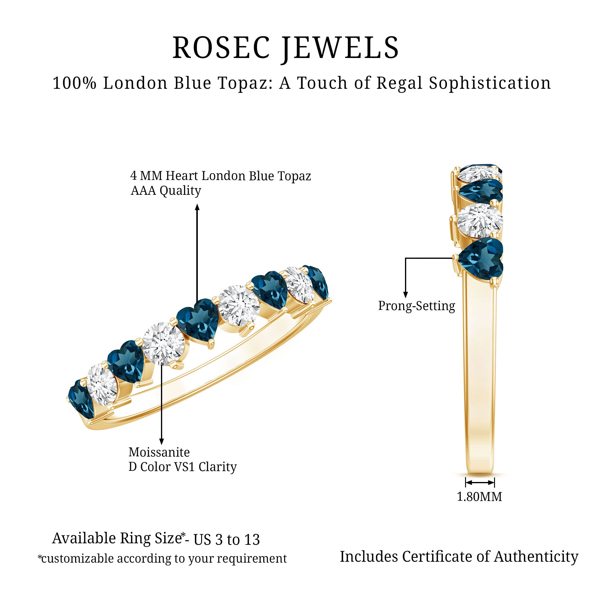 A piece of jewelry that conveys the essence of love. This Blue Topaz Wedding Band embodies significance in every aspect. Crafted to celebrate the enduring connections that last a lifetime, this Heart Eternity Ring serves as an elegant emblem of commitment, meticulously designed to enhance your daily attire. It showcases carefully chosen 4 MM heart-shaped London Blue Topaz gemstones, securely set in prong settings. Each london blue topaz is accompanied by sparkling round-cut moissanites, each nestled within delicate heart-shaped frames. The alternating design creates a harmonious interplay of contrast and brilliance, imparting a gentle romantic glow to the overall aesthetic. Created with care and precision, the Heart Wedding Band features a half eternity style, offering perfect balance and comfort for everyday wear. It is ideal for individuals who appreciate jewelry with a personal touch, embodying both style and sentiment in equal measure. Whether worn solo or stacked with other rings, it brings a subtle elegance to your hand. The heart motifs introduce a romantic touch, making it a considerate choice for an anniversary, a promise, or simply a meaningful gift. This handcrafted Half Eternity Band serves as a tender reminder of enduring love and the cherished moments shared along the journey. Whether commemorating a significant occasion or merely expressing your feelings for someone special, this Eternity Stackable Ring is a timeless treasure, designed to be valued every day.