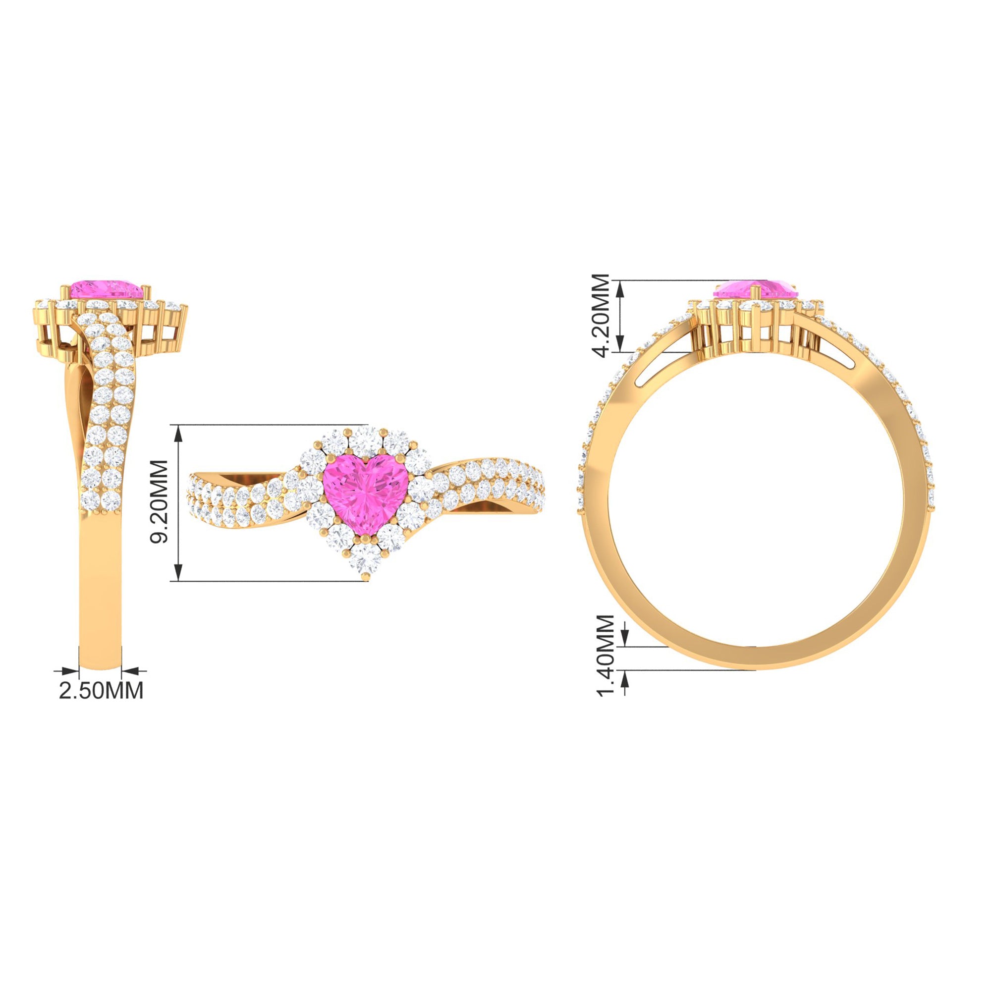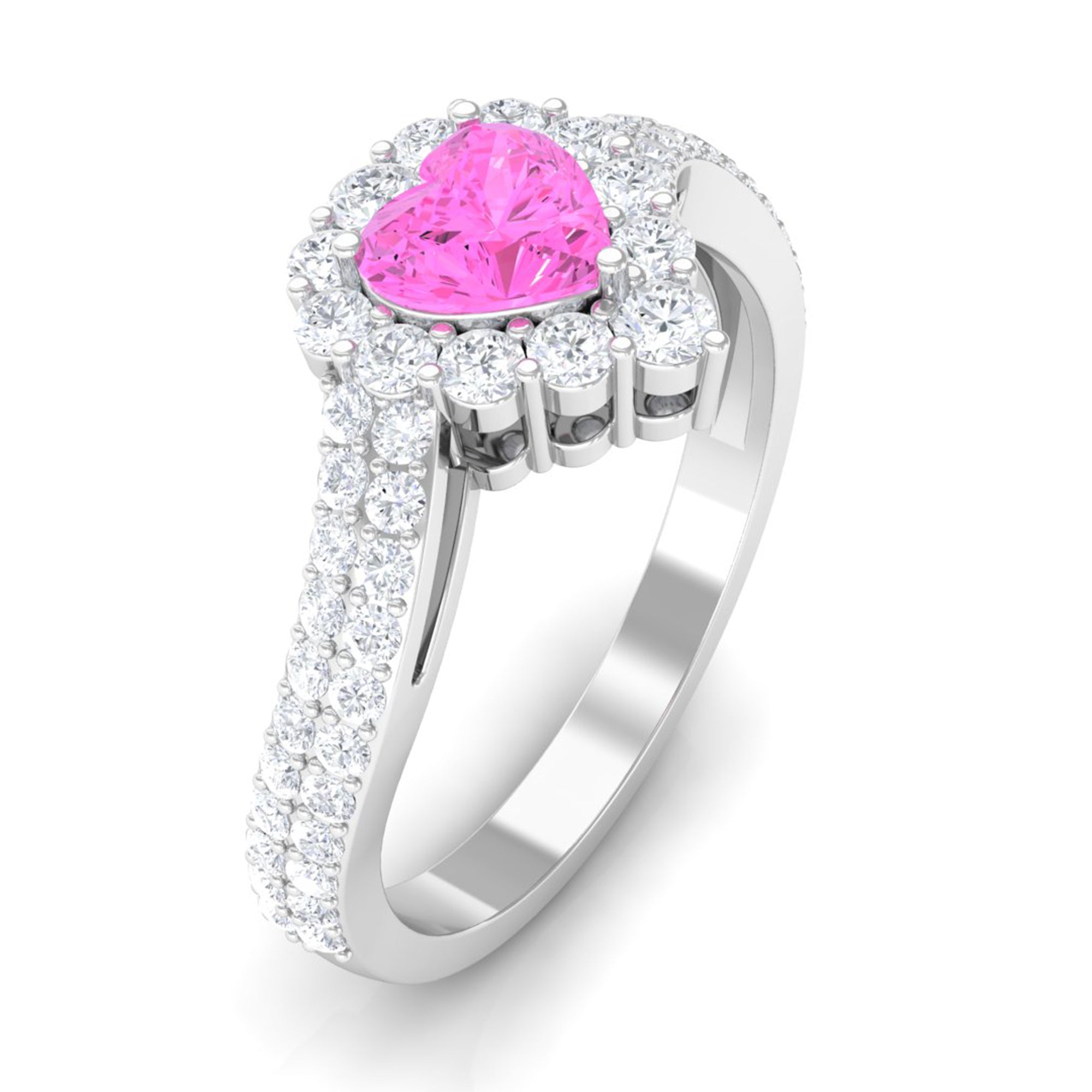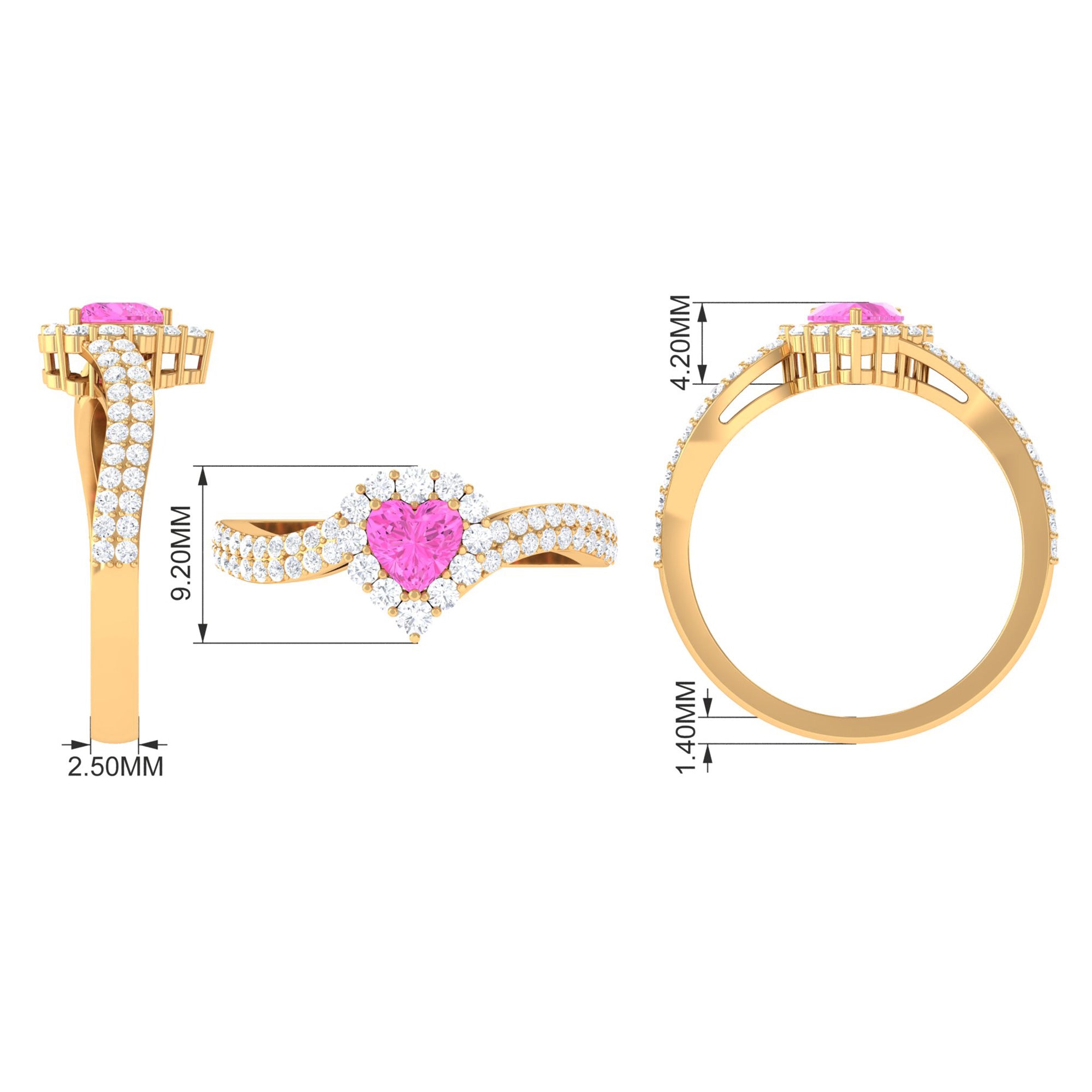 This exquisite Engagement Ring, adorned with a Heart Shape Pink Sapphire in a delicate Prong Setting with Bypass Shank, will leave her speechless. Its radiant brilliance shines from every angle, enhanced by the captivating presence of Diamond.