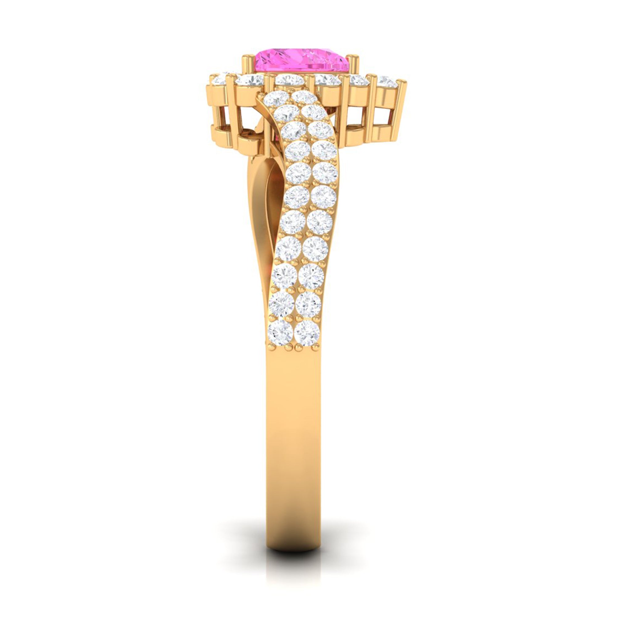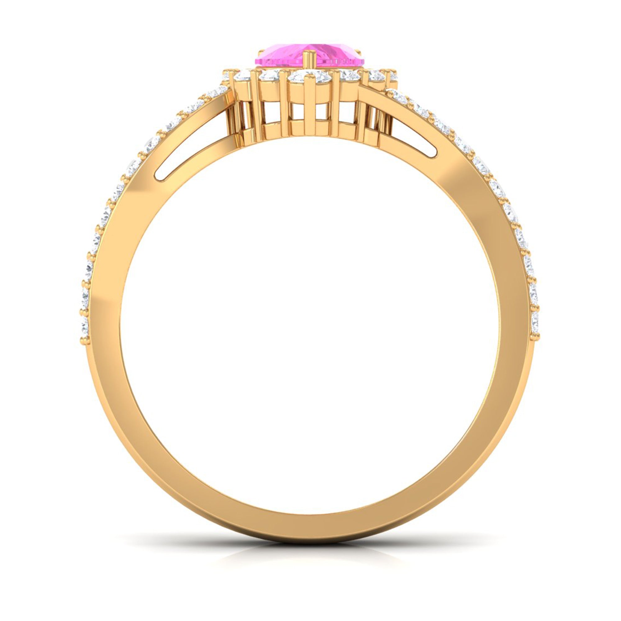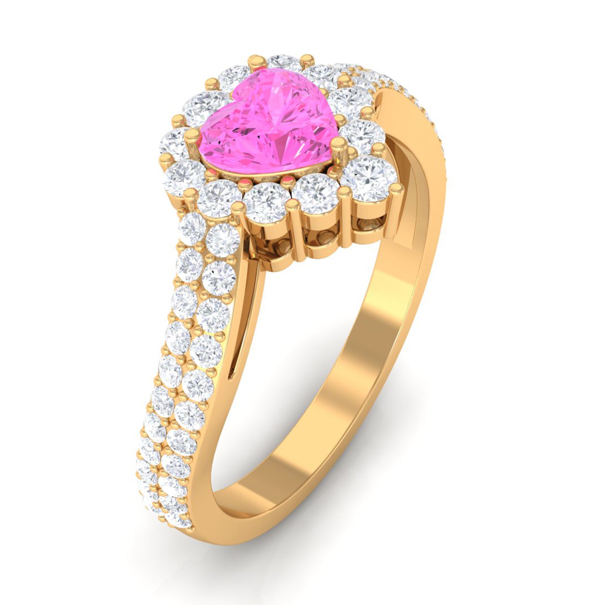This exquisite Engagement Ring, adorned with a Heart Shape Pink Sapphire in a delicate Prong Setting with Bypass Shank, will leave her speechless. Its radiant brilliance shines from every angle, enhanced by the captivating presence of Diamond.