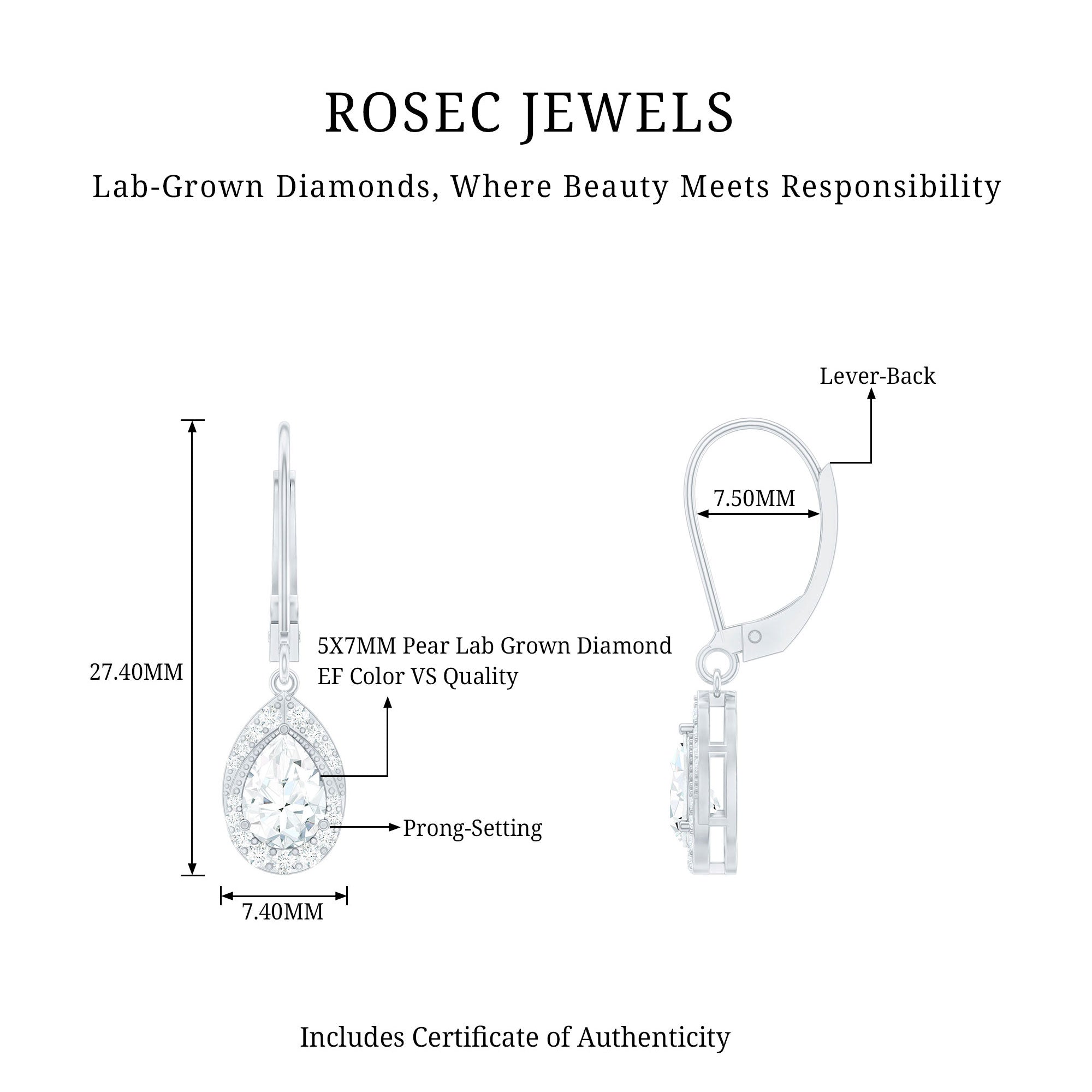 Discover the epitome of versatility with our Lab Grown Diamond Dangle Earrings, a perfect complement to any attire. The central 5x7mm Pear Shaped Lab Grown Diamond steals the spotlight, while round lab grown diamonds gracefully adorn the sides of the metal, creating a harmonious balance. The top and bottom accents of Ef-Vs Quality lab grown diamonds leave just enough space for the metal to radiate its own brilliance. Diamonds are forever and so will be its radiance in your life. Elevate your style effortlessly with this Diamond Drop Earrings from Rosec Jewels, a specialist in crafting stunning jewelry using certified Lab Cultivated Gemstones.
