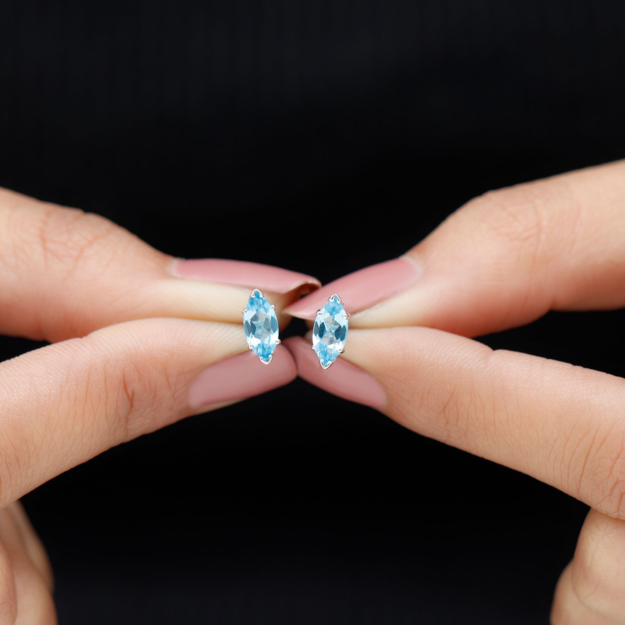 Elevate your elegance with our exquisite stud earrings, adorned with Marquise Cut Swiss Blue Topaz gems delicately set as solitaires in secure prong settings. These stunning accessories enhance your beauty, adding a touch of sophistication and brilliance to any ensemble. Whether for a special occasion or everyday wear, these earrings are the perfect choice to showcase your style and grace.