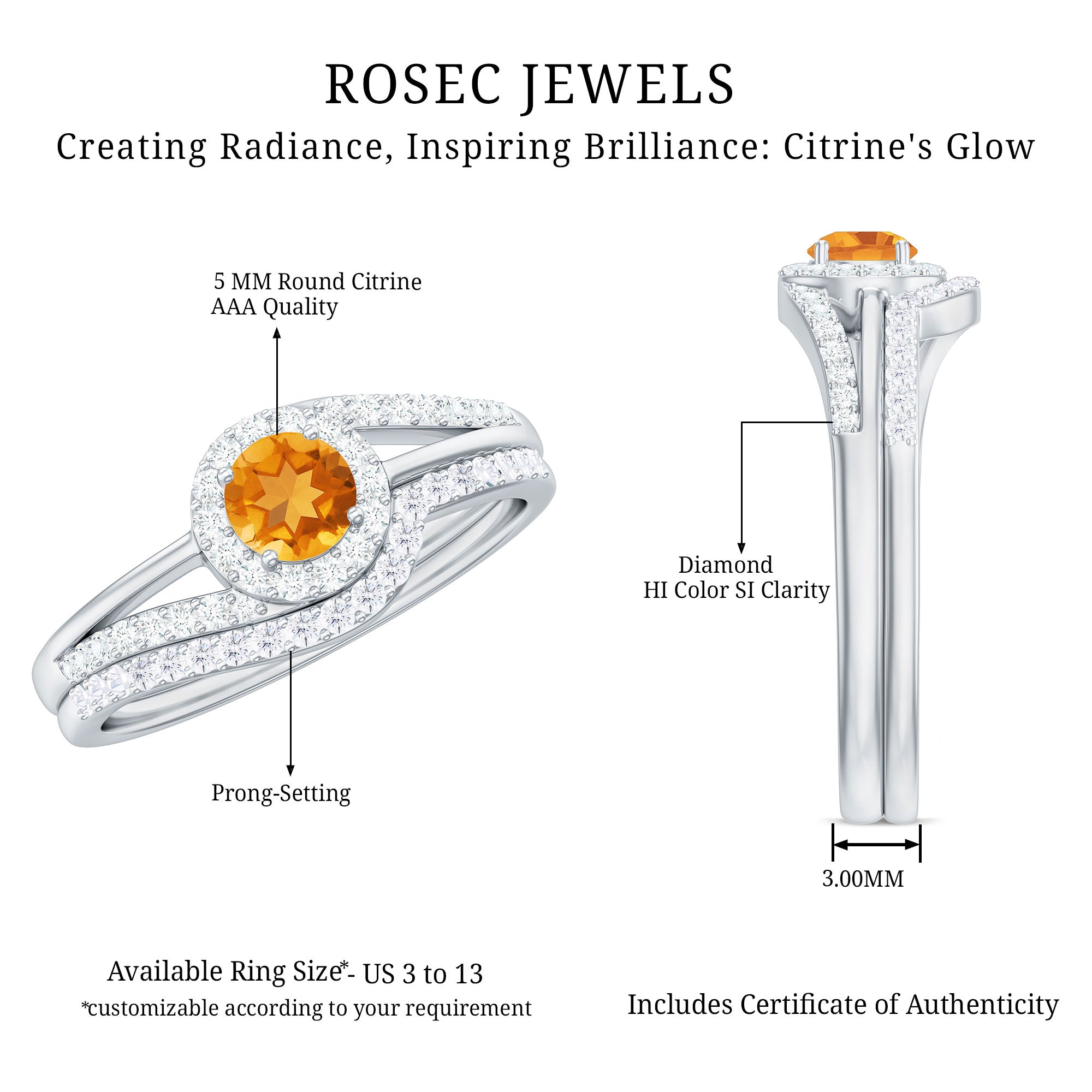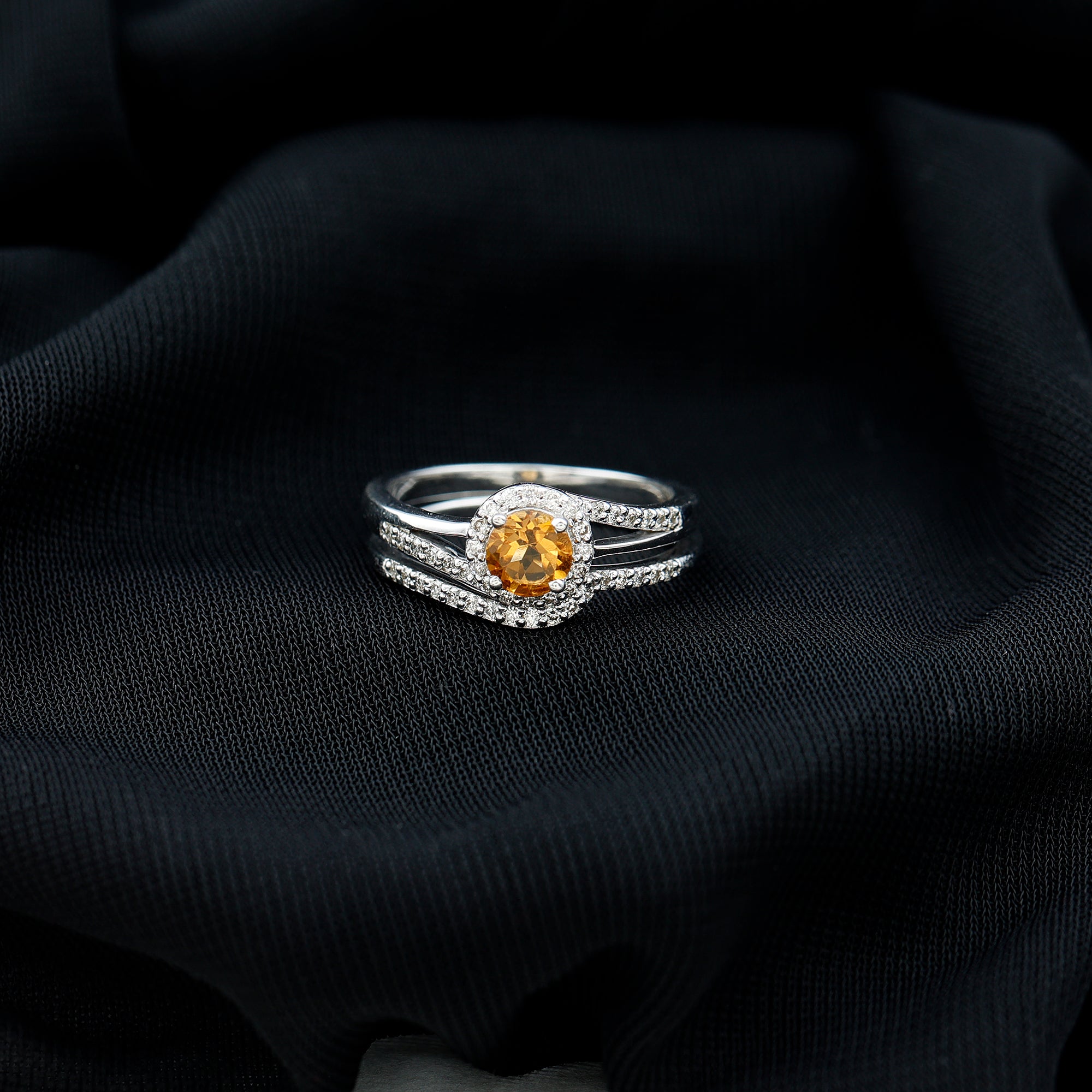 This Engagement Ring with Enhancer is embellished with Round Shape Citrine is set at the center encircled with Round Shape Diamond and more Diamond are set on the split shank and Enhancer Ring is encased with Round Shape Diamond, crafted in a Solid Gold.