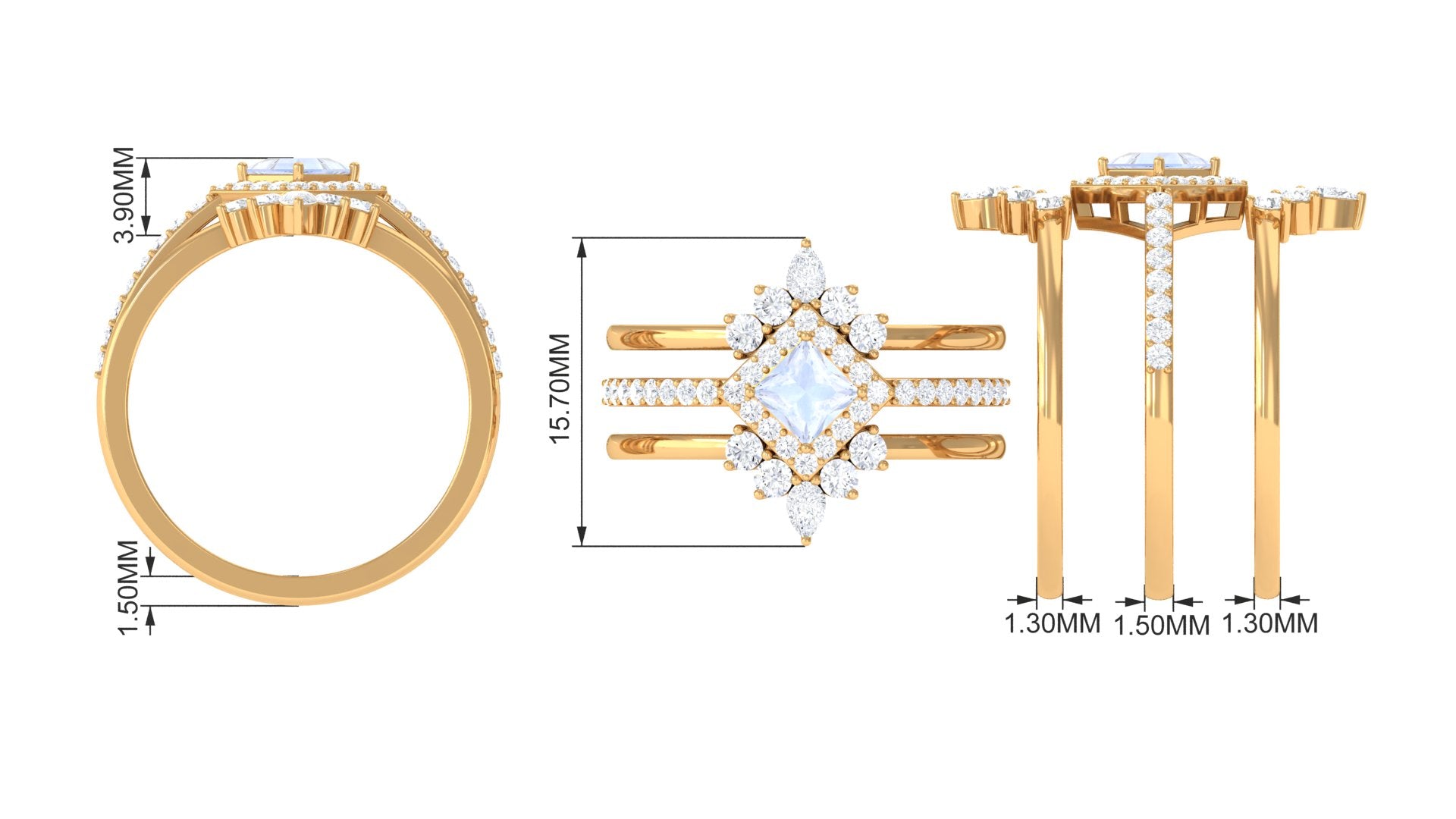 This stunning Wedding Ring Set is embellished with Princess Cut Moonstone secured in Prong Setting, while Round Moissanites studded on the matching bands.• The Moonstone Ring Set will complement her daily or special outfits. So dont wait, get this Unique Ring Set as an anniversary gift for her.