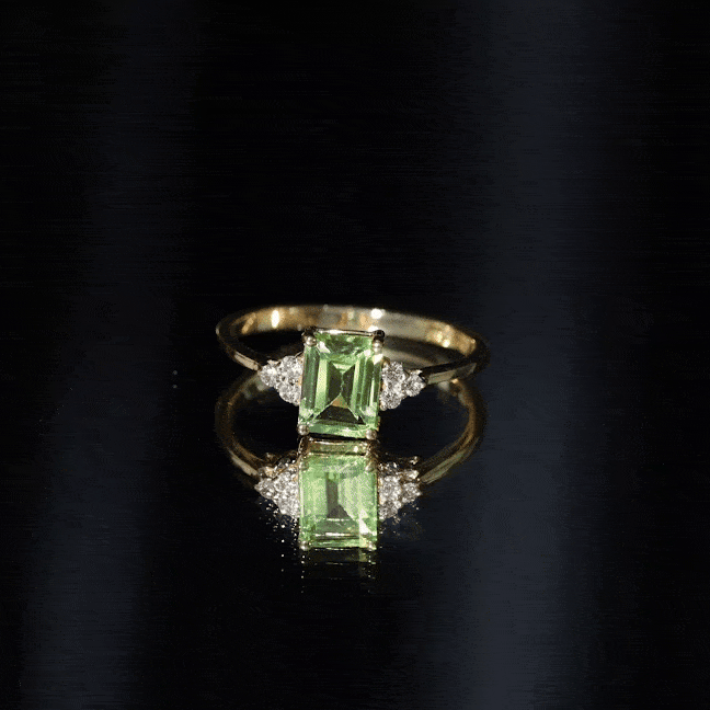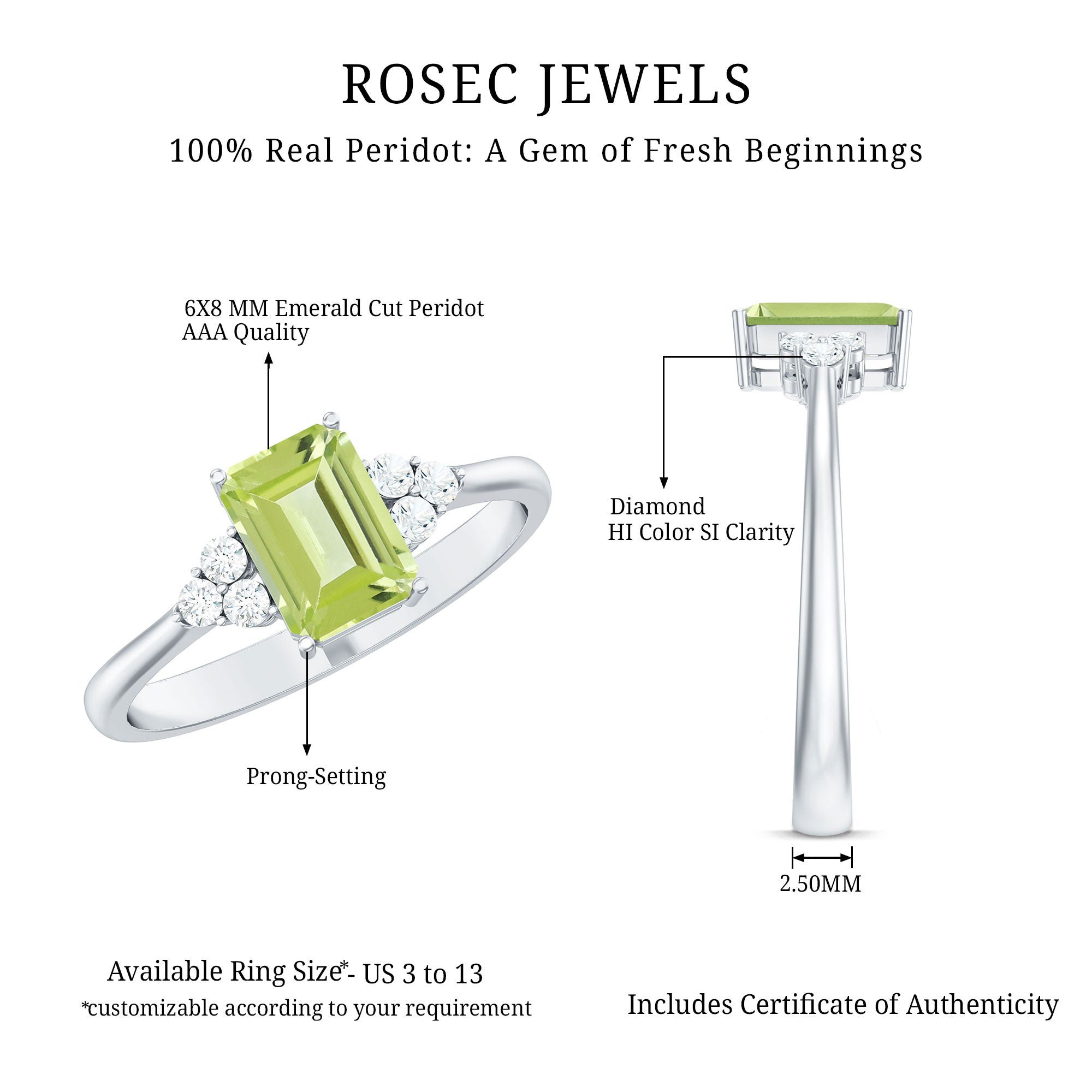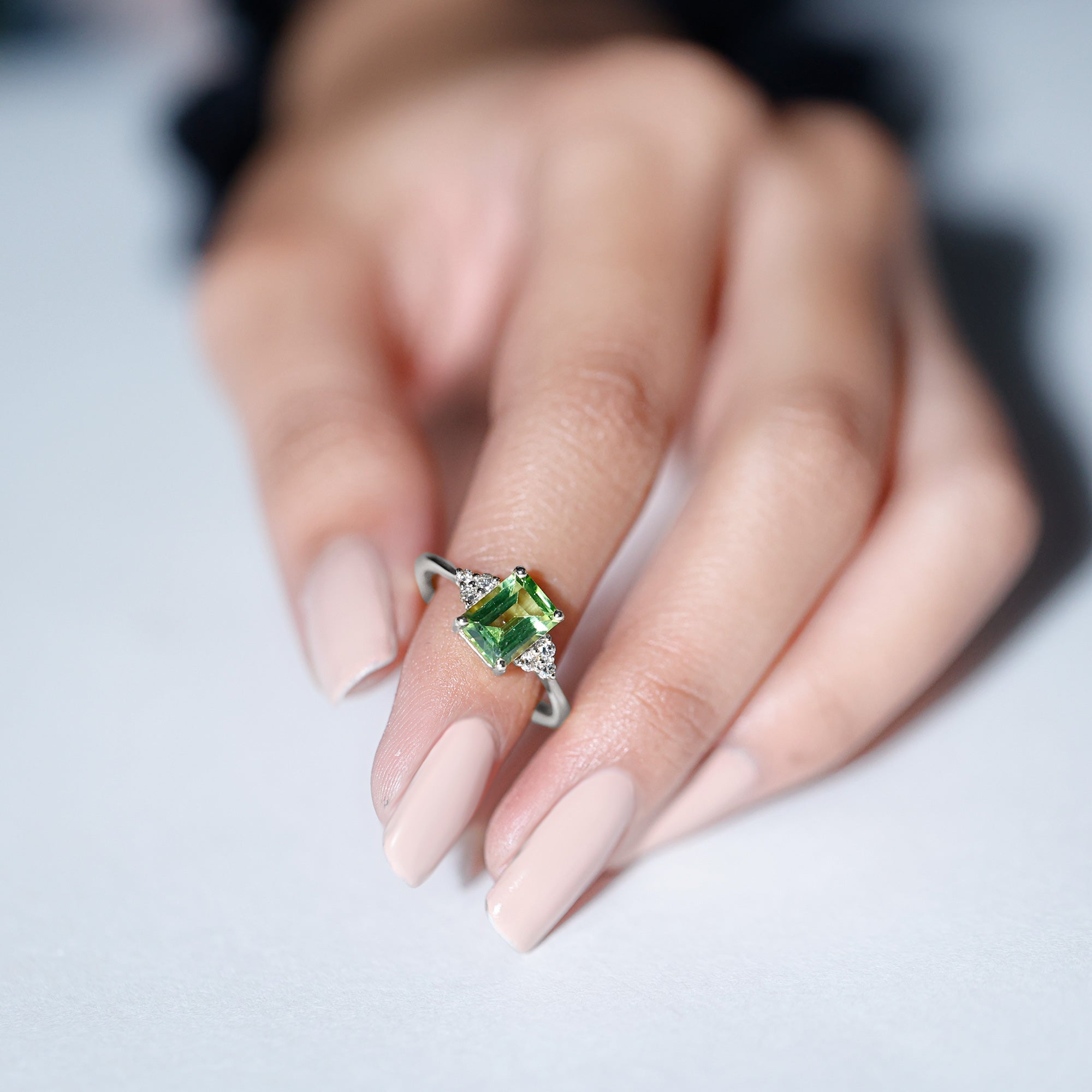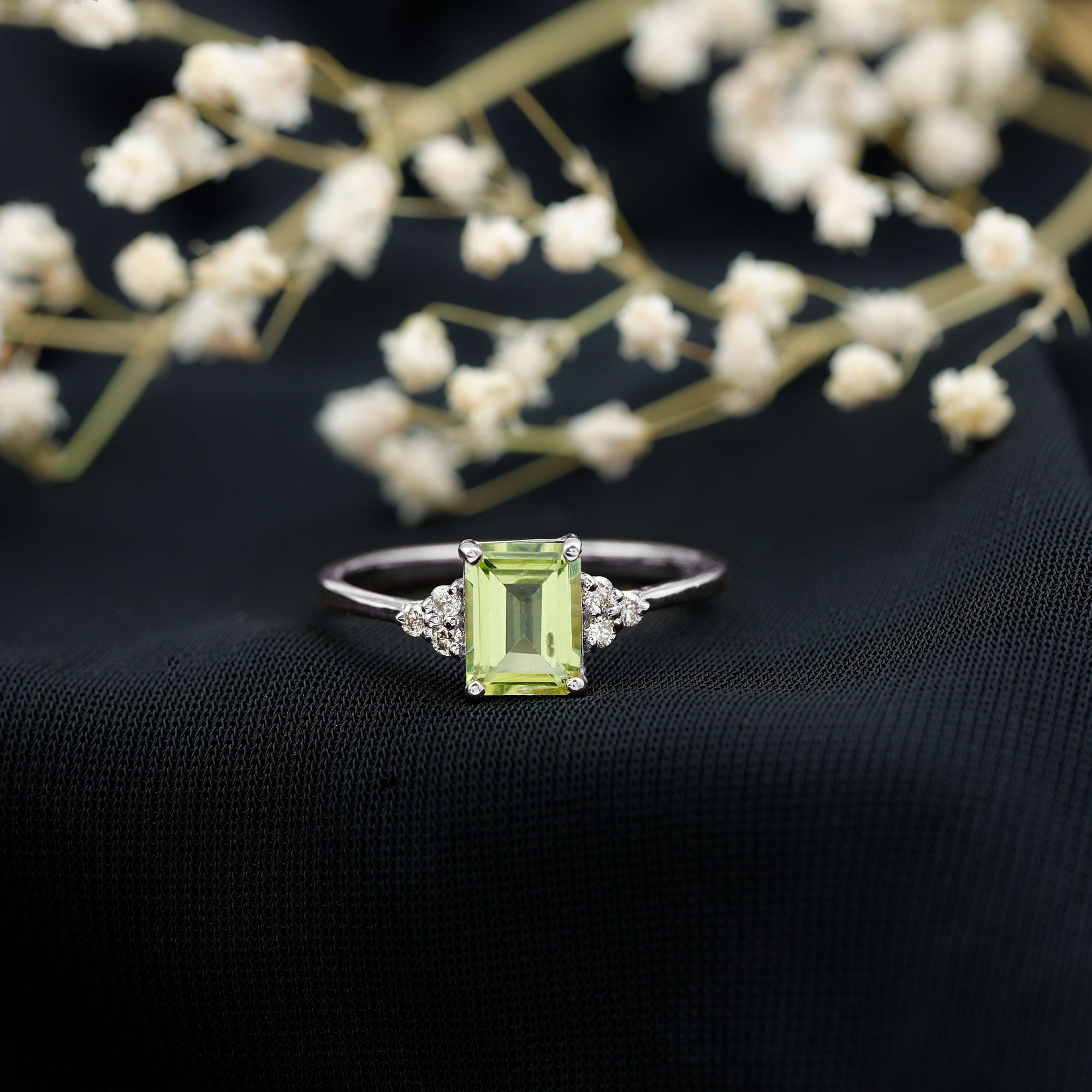 Emerald Cut Peridot Engagement Ring with Diamond Trio