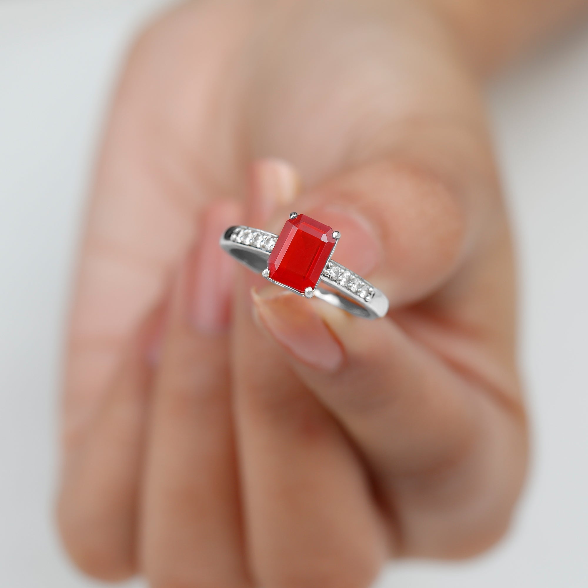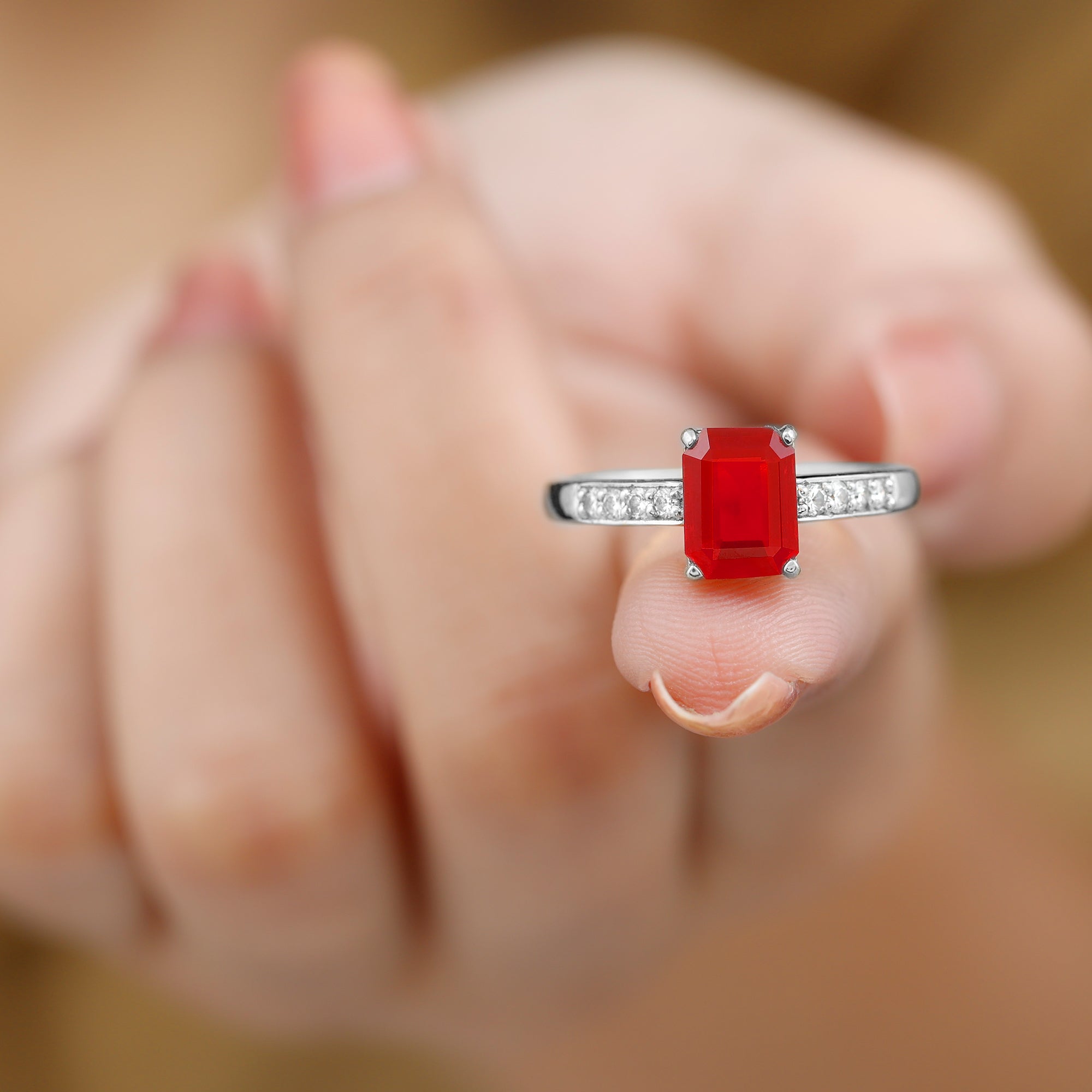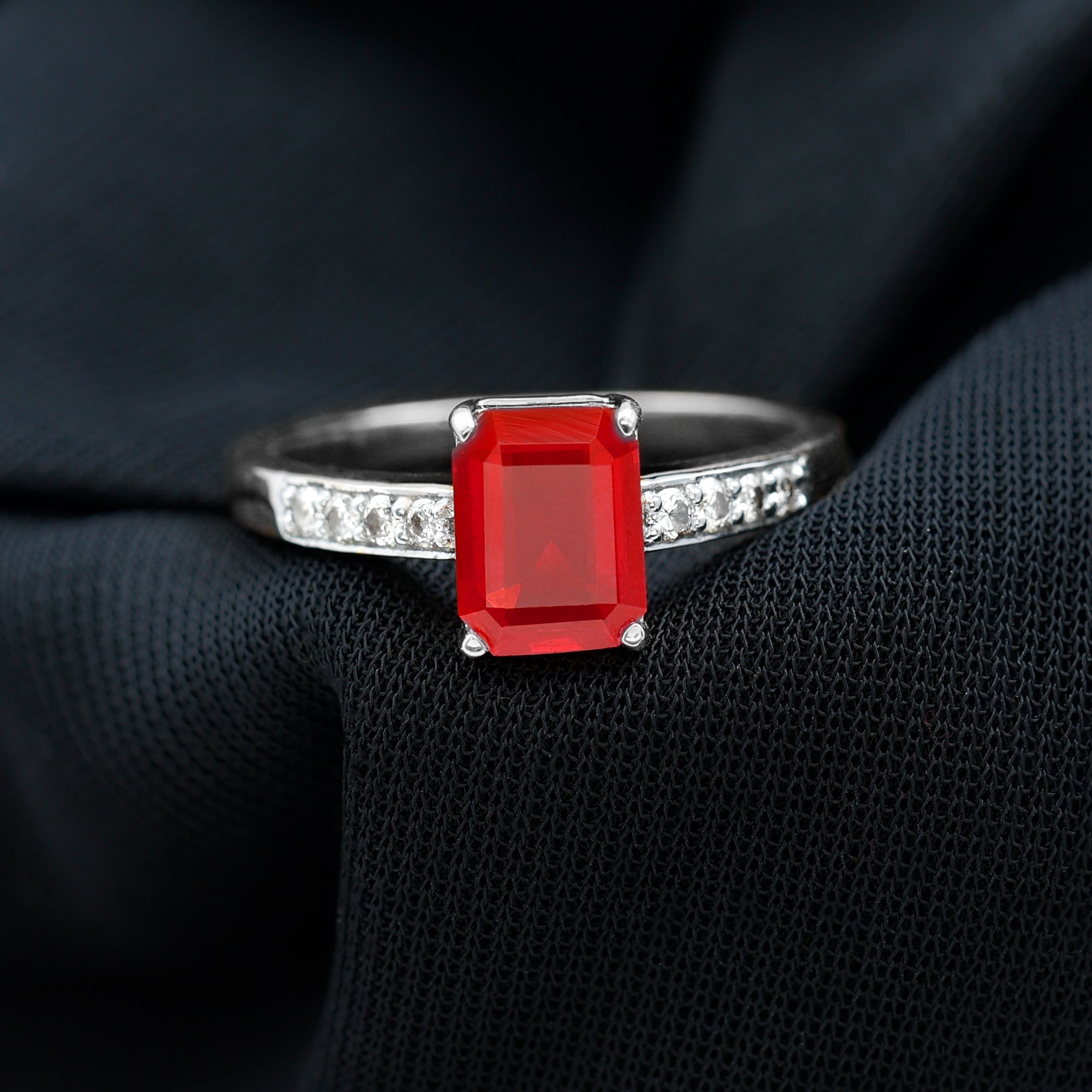 Octagon Cut Real Fire Opal Solitaire Ring with Diamond