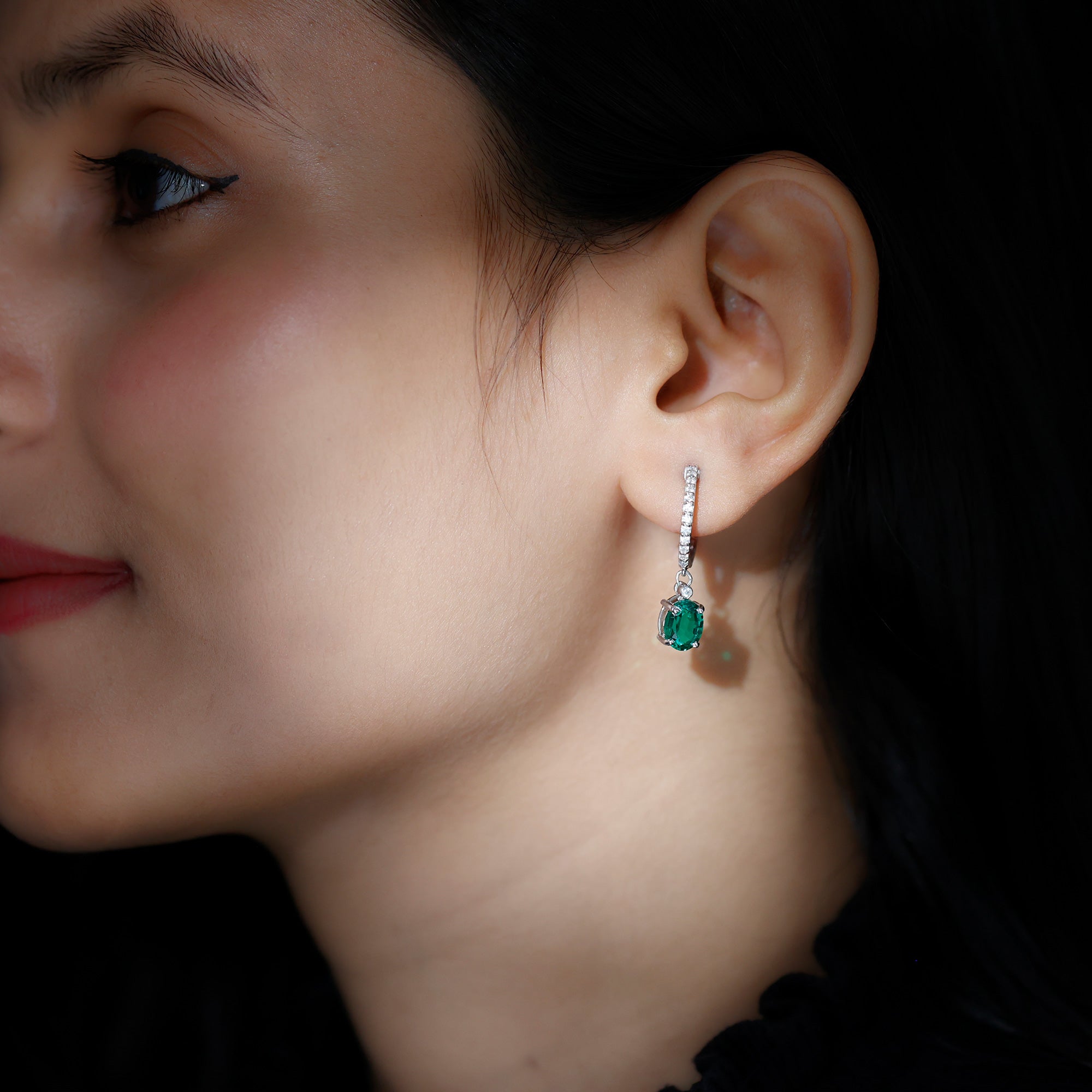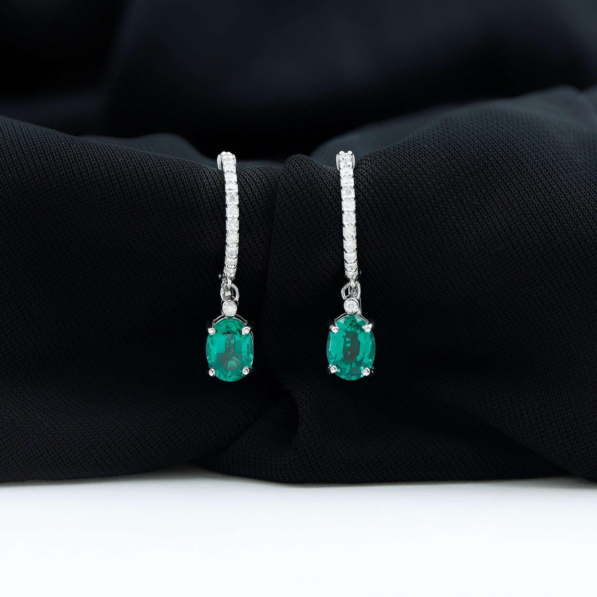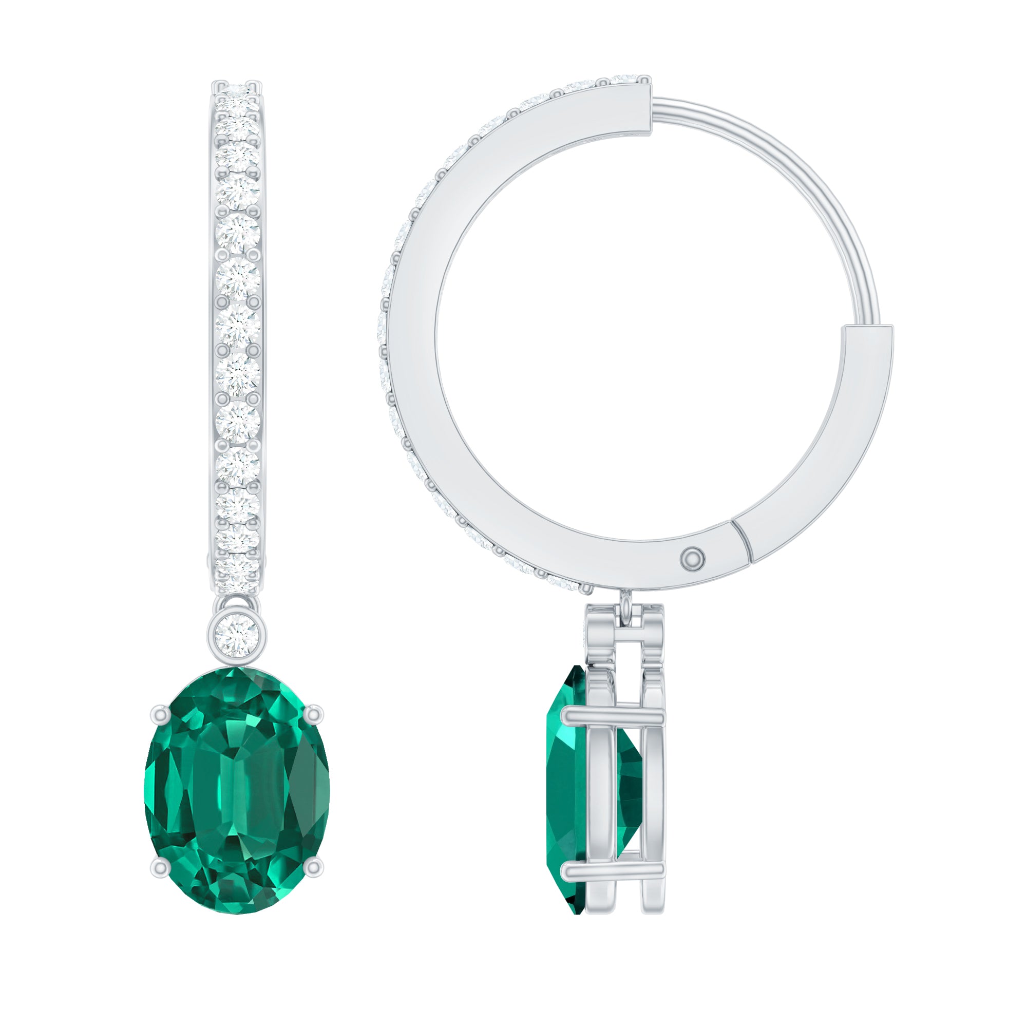 Oval Created Emerald and Diamond Hoop Drop Earrings