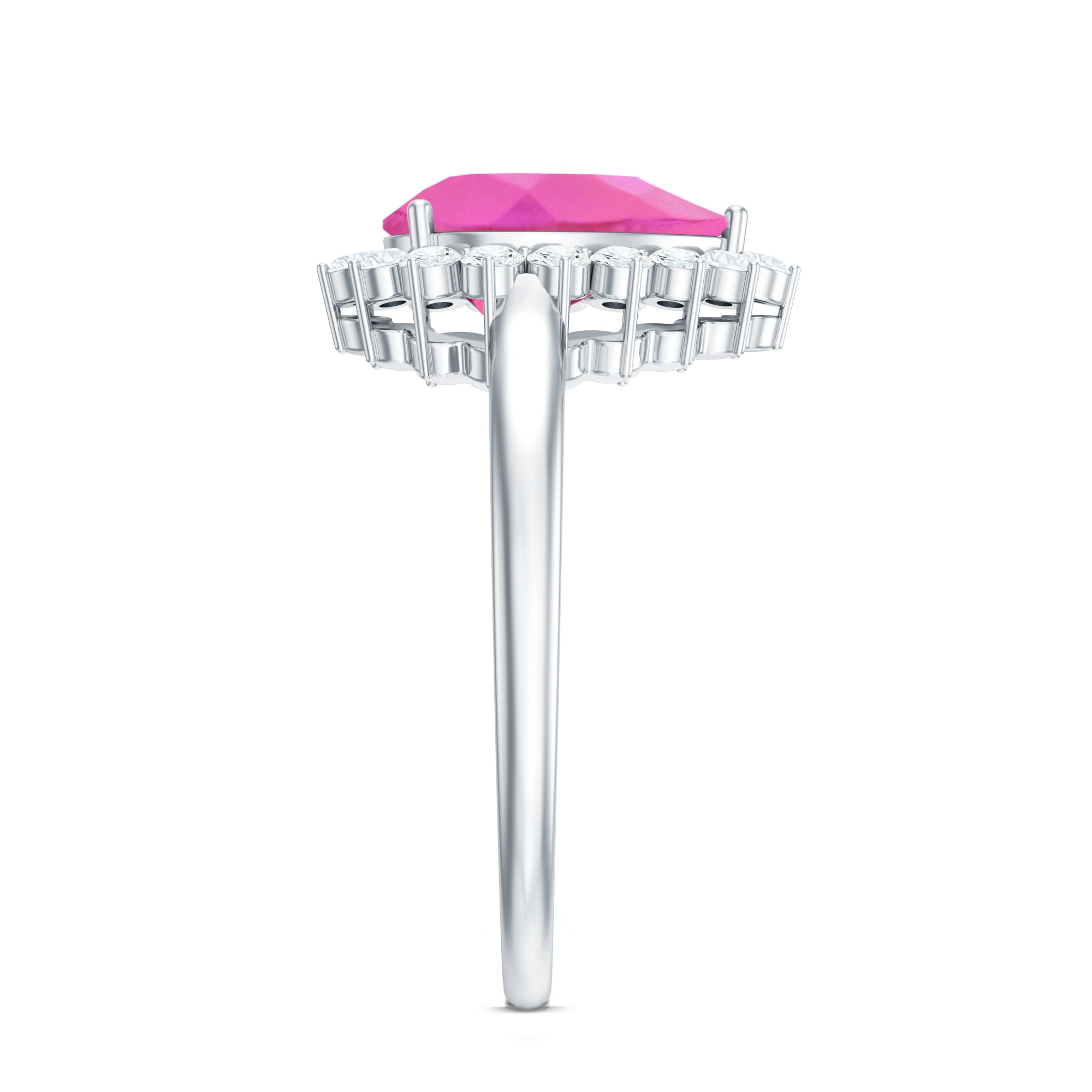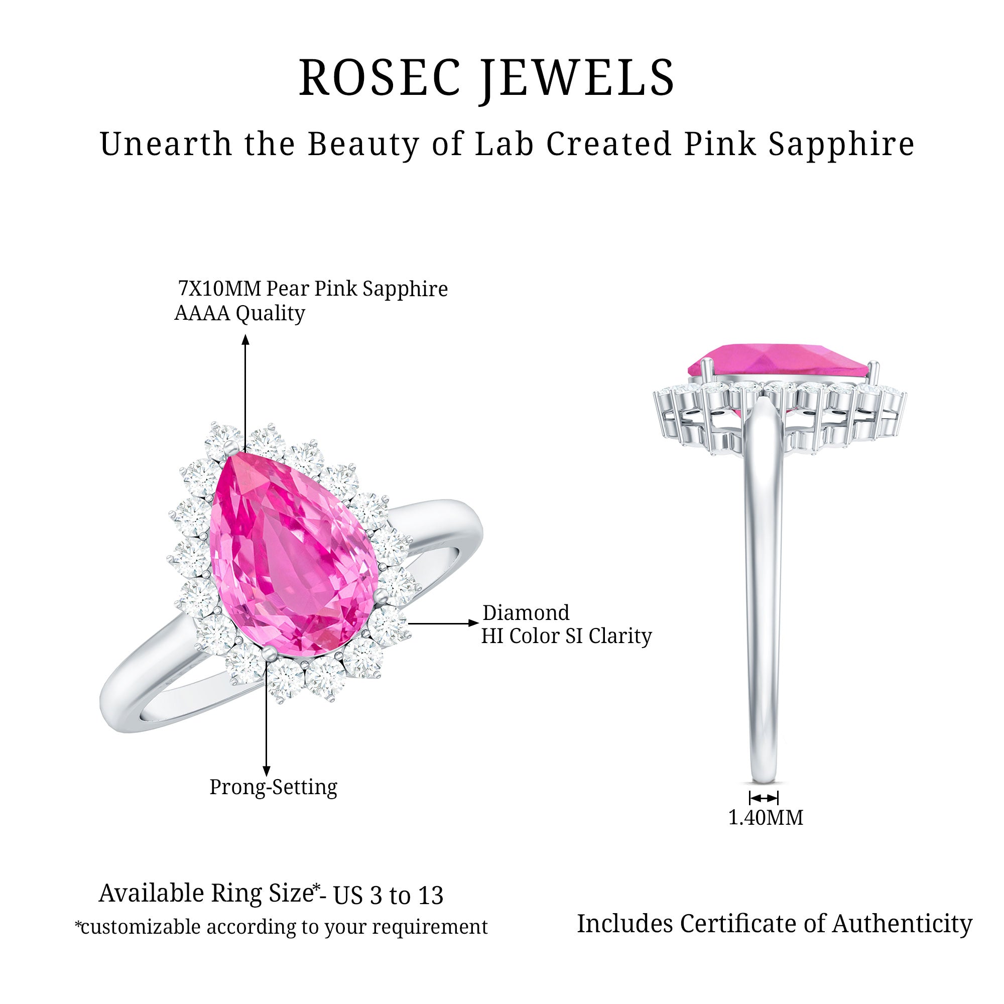 This stunning Teardrop Ring will surely capture everyones attention. Featuring a pear-cut created pink sapphire surrounded by round Diamond stones in a halo style, this ring exudes glamour and brilliance. Whether youre dressing up for a special occasion or want to elevate your everyday style, this dazzling piece is the perfect choice to leave a lasting impression and showcase your unique style.