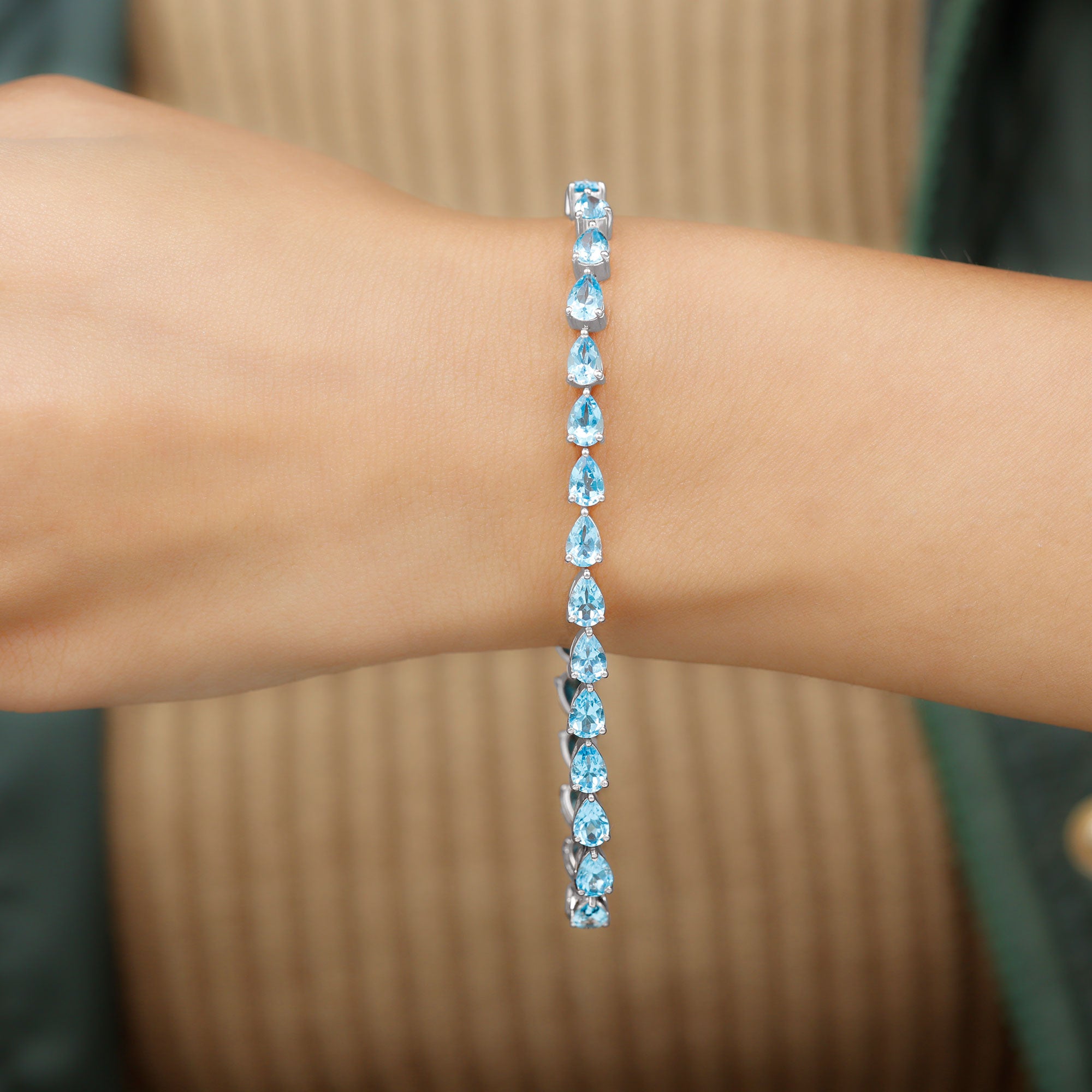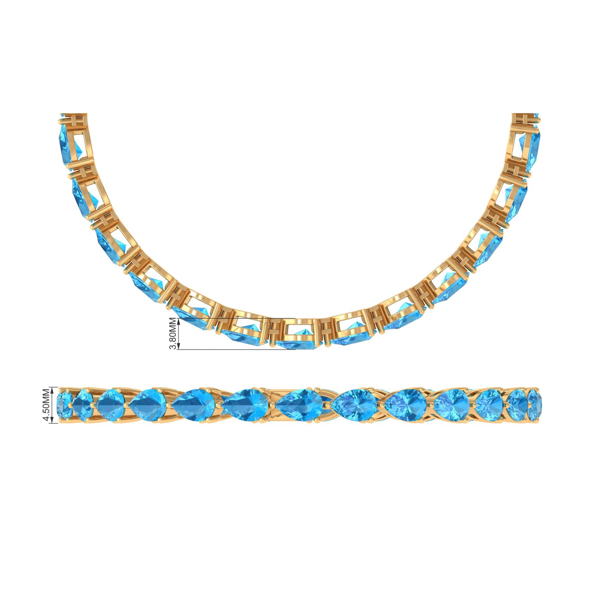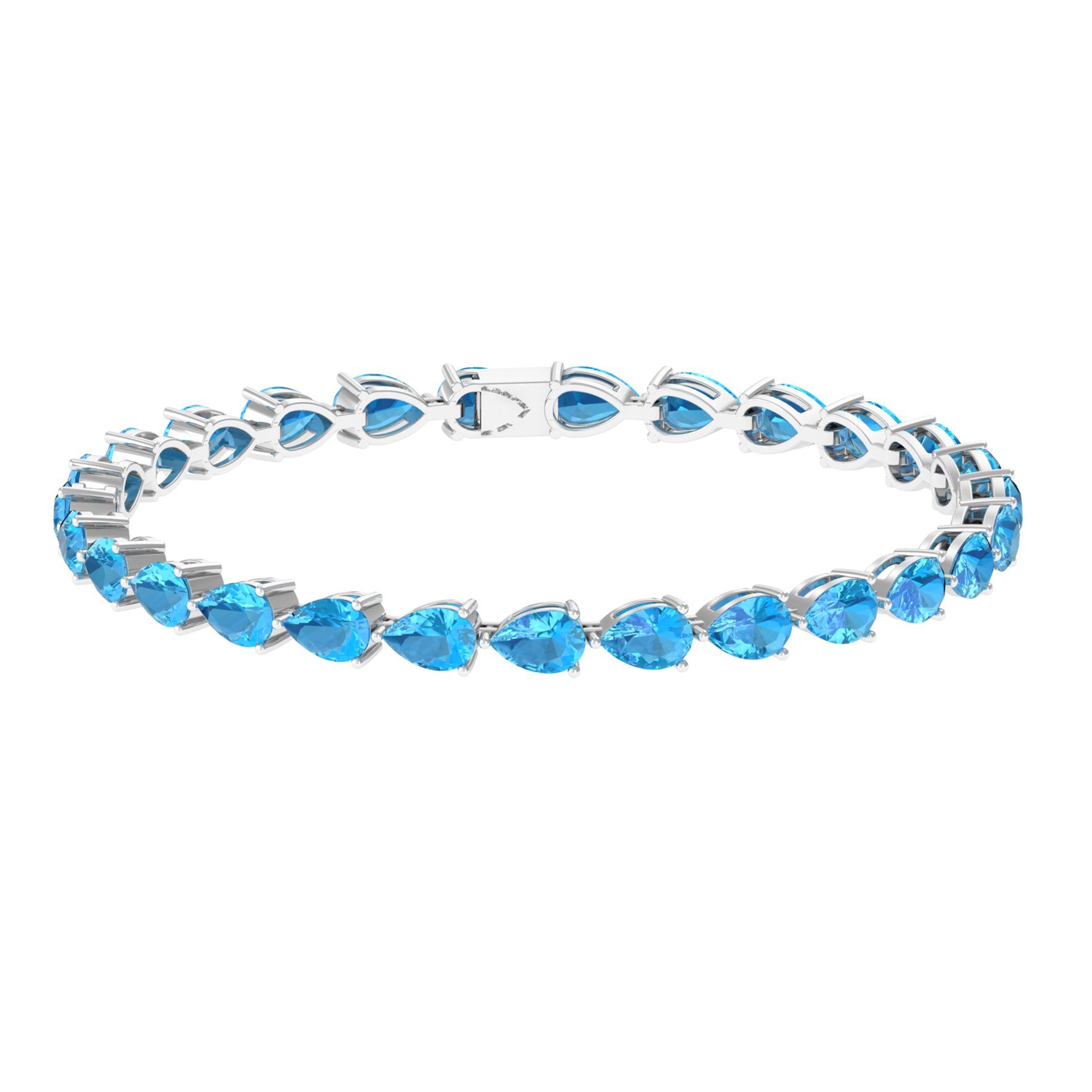 Classiness takes center stage with our East-West Tennis Bracelet featuring horizontal Pear Cut Swiss Blue Topaz gems secured in a sleek prong setting. The vivid Swiss Blue Topaz stones add a pop of color and charm, making this piece a versatile accessory suitable for any occasion.