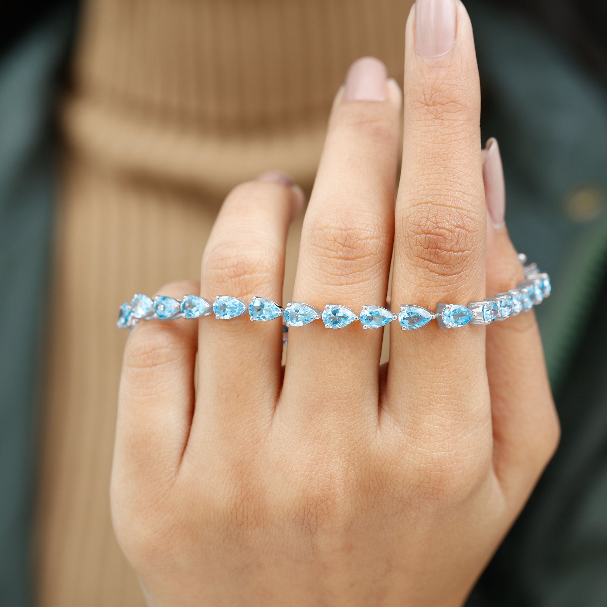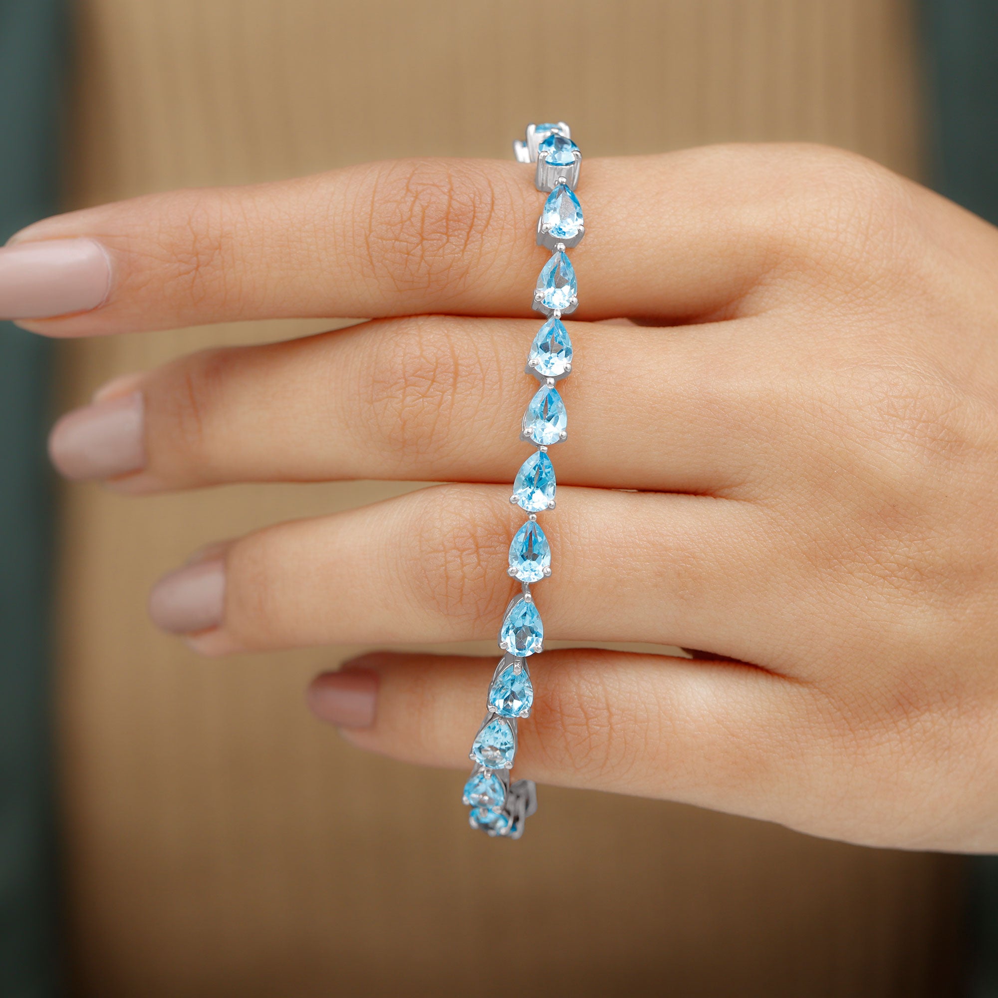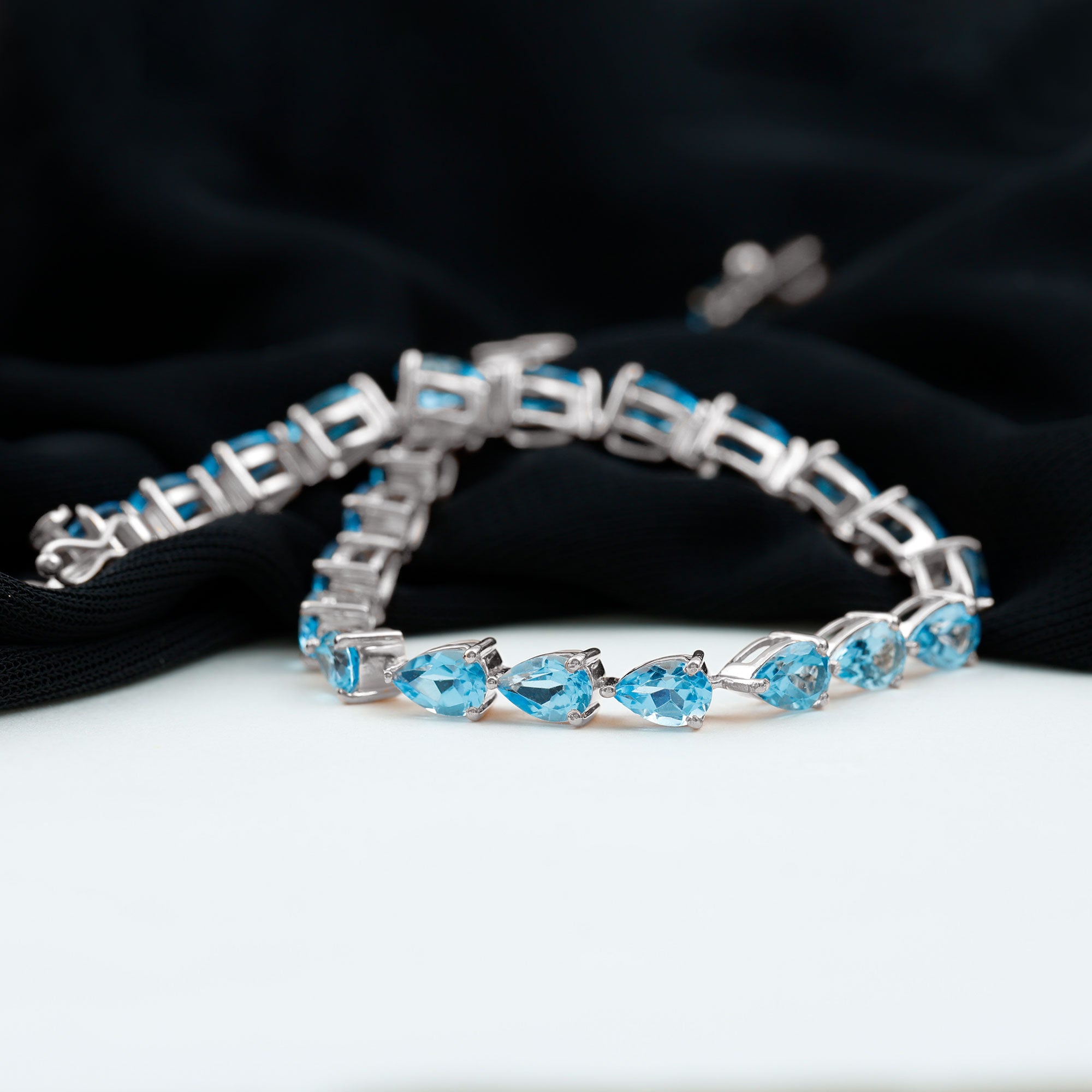 Classiness takes center stage with our East-West Tennis Bracelet featuring horizontal Pear Cut Swiss Blue Topaz gems secured in a sleek prong setting. The vivid Swiss Blue Topaz stones add a pop of color and charm, making this piece a versatile accessory suitable for any occasion.