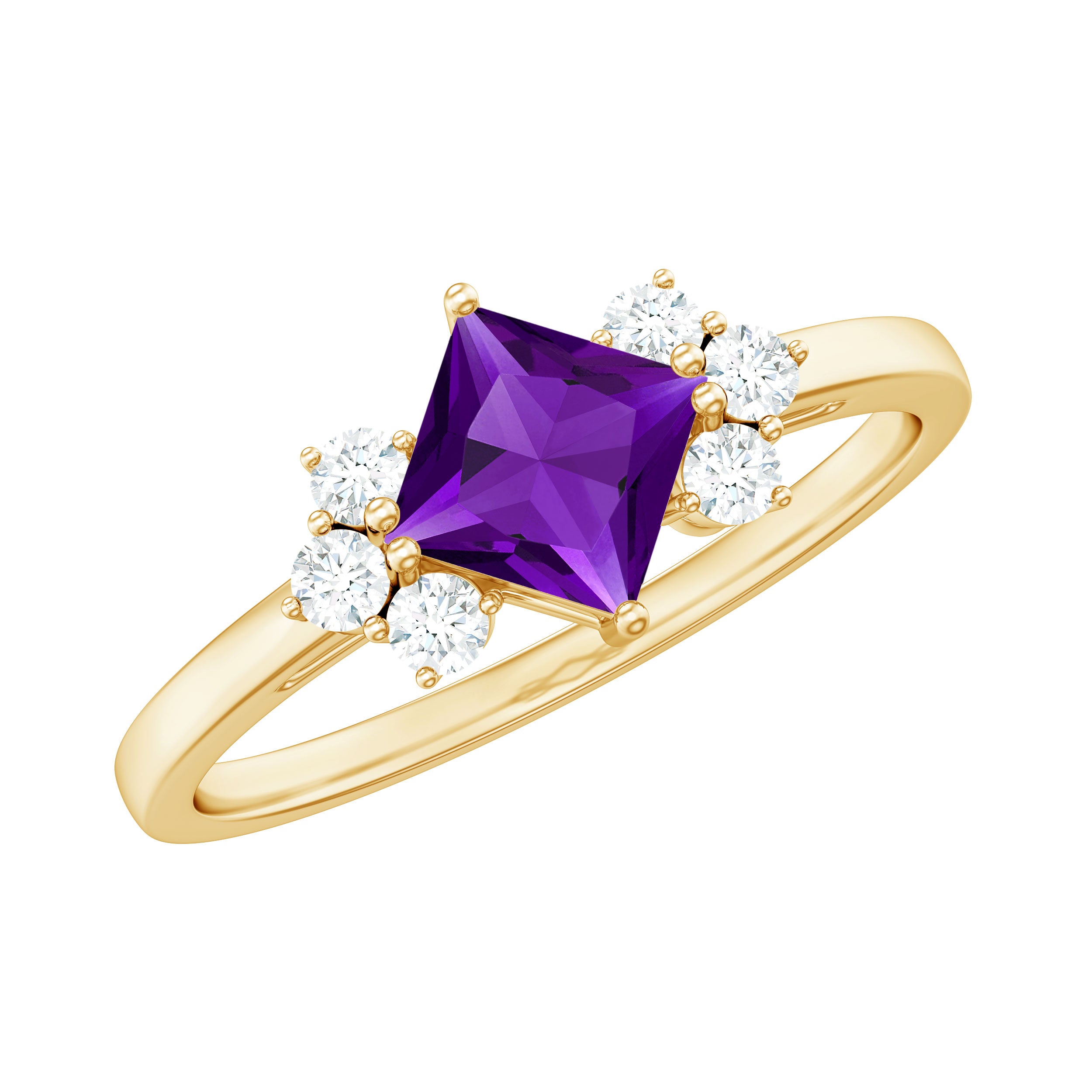 Make a promise that shines bright with this Princess Cut Amethyst Ring, embellished with a trio of Diamond stones. A symbol of devotion and everlasting love.