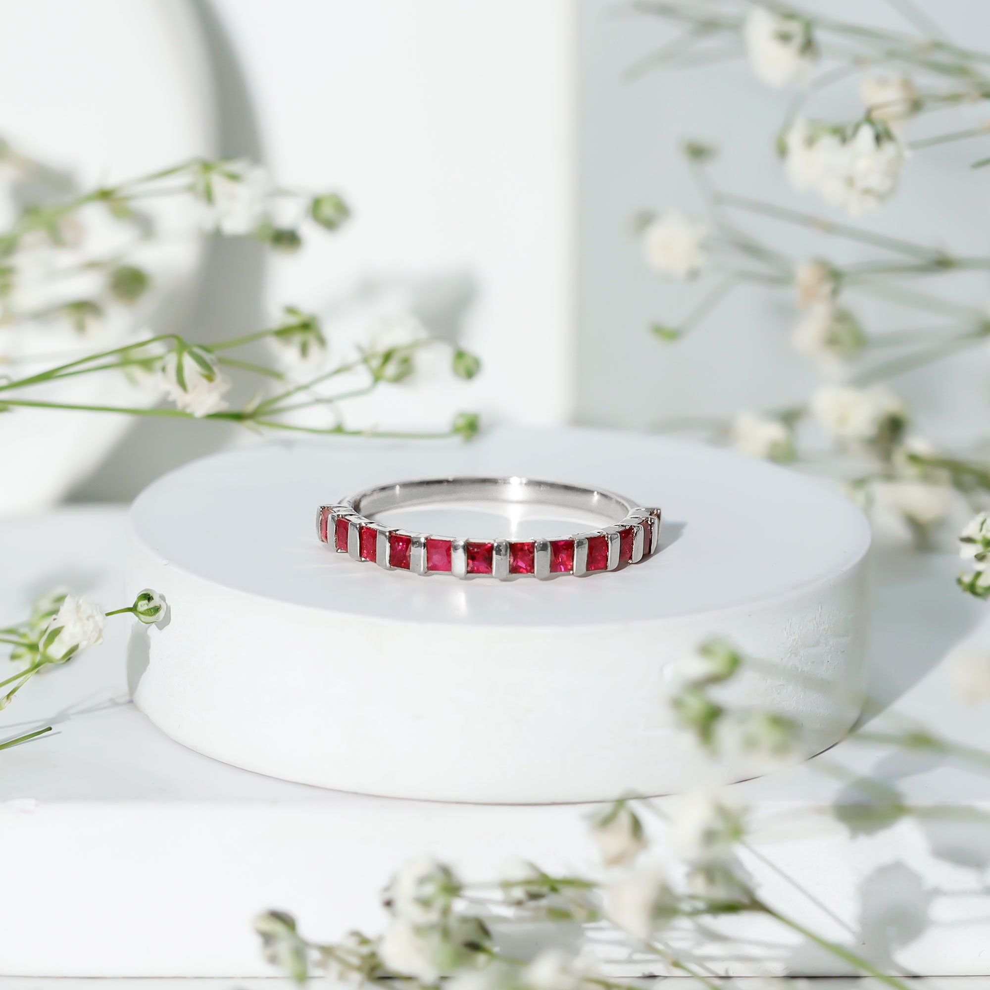 Surprise your beloved with this charming Half Eternity Ring adorned with Princess Cut Ruby in Bar Setting. Solid Gold build gives an opulent appeal to this Anniversary Ring.