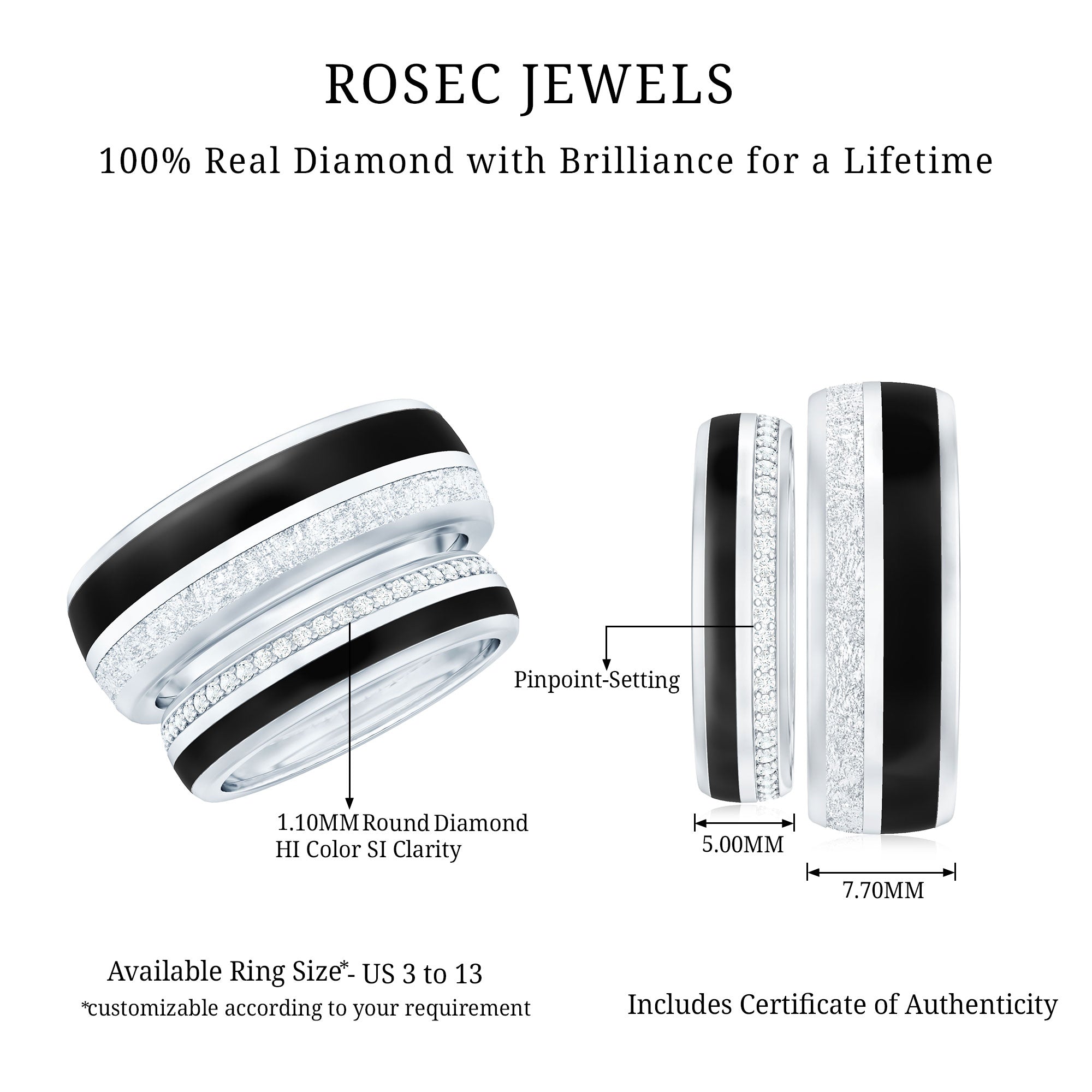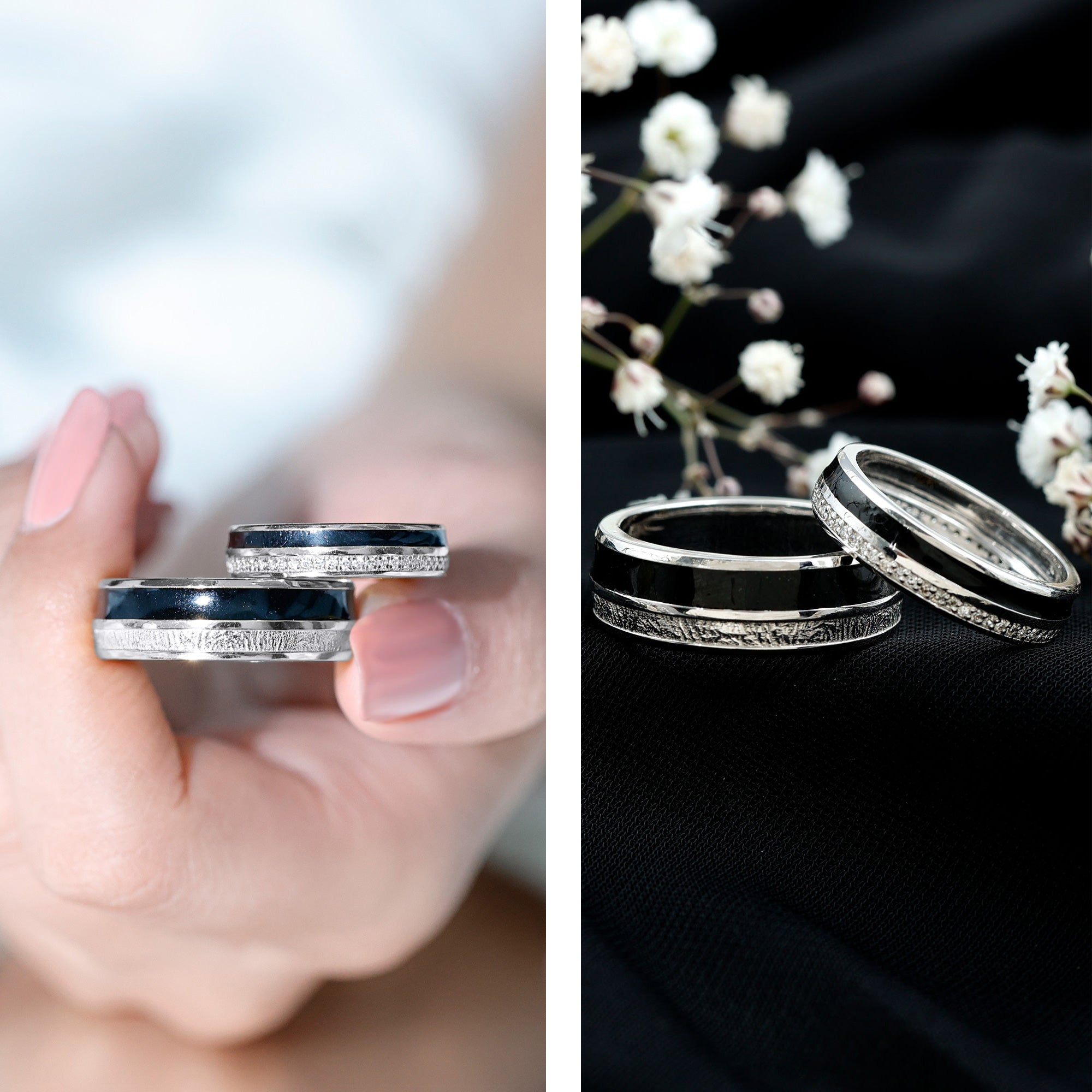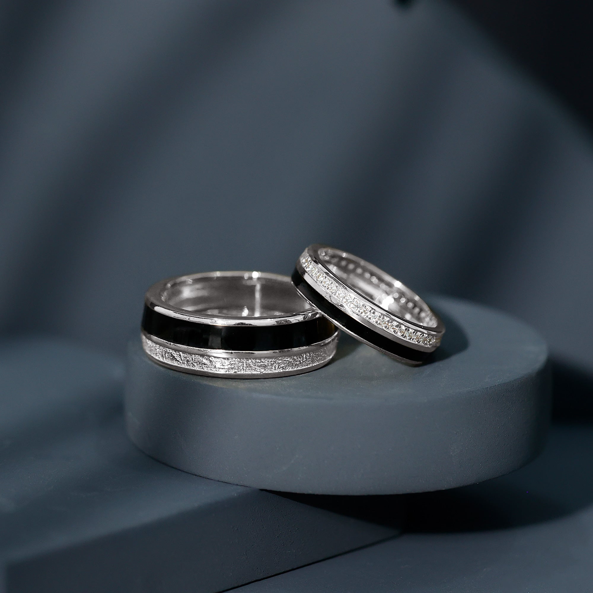 This elegant Couple Wedding Band Set blends modern sophistication with timeless symbolism, creating a perfect pairing for partners who appreciate classy style. The men’s band features a striking combination of sleek black enamel and textured detailing. The contrast between the smooth enamel and the texture creates a unique design that stands out. The women’s band mirrors the men’s with its matching black enamel accents, creating a harmonious and coordinated look between the two rings. Adding a touch of brilliance and femininity, the women’s band ring showcases a full row of genuine and sparkling diamonds set in pinpoint setting. Together, these Wedding Bands for Him and Her symbolize unity through contrast, strength and softness, boldness and beauty, making them a meaningful choice for couples looking to celebrate their bond with matching rings that feel both modern and timeless. These Black Matching Wedding Bands are ideal for those who want a distinctive and stylish expression of their commitment.