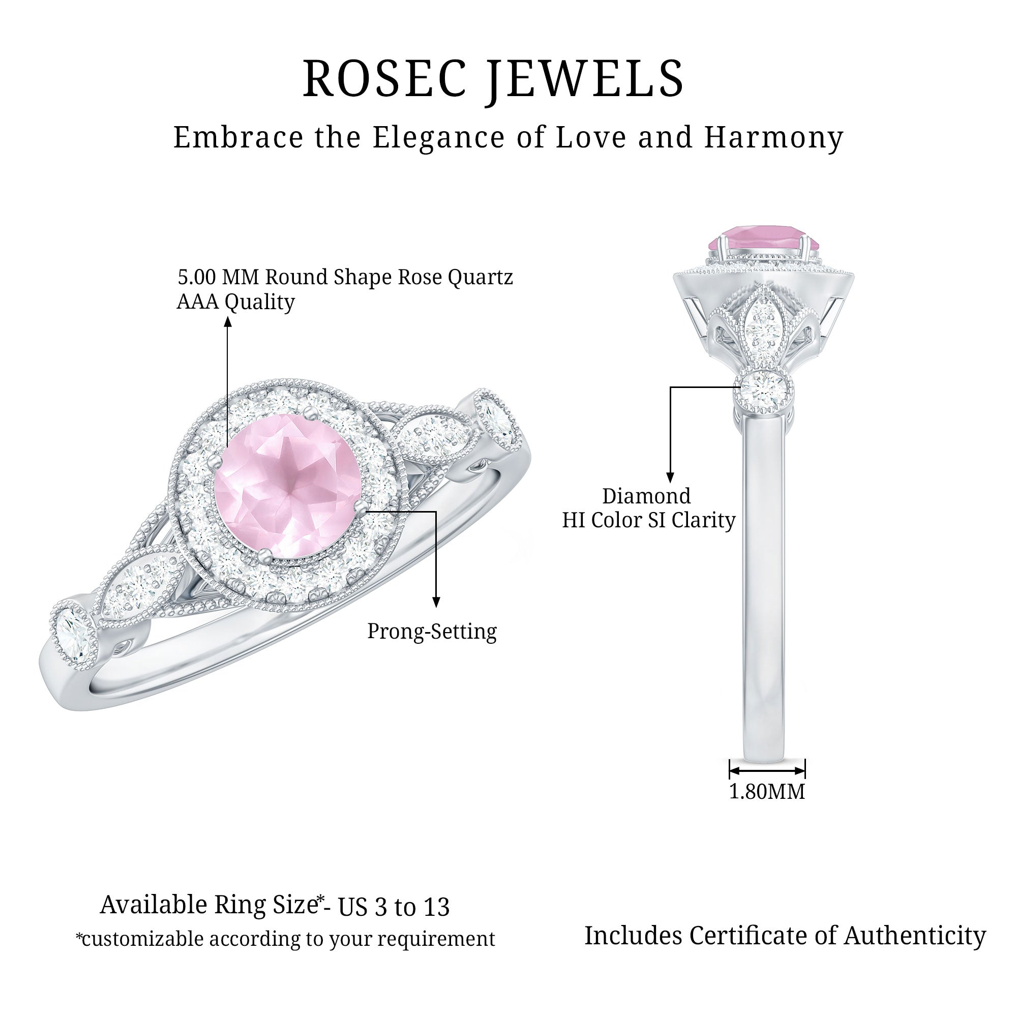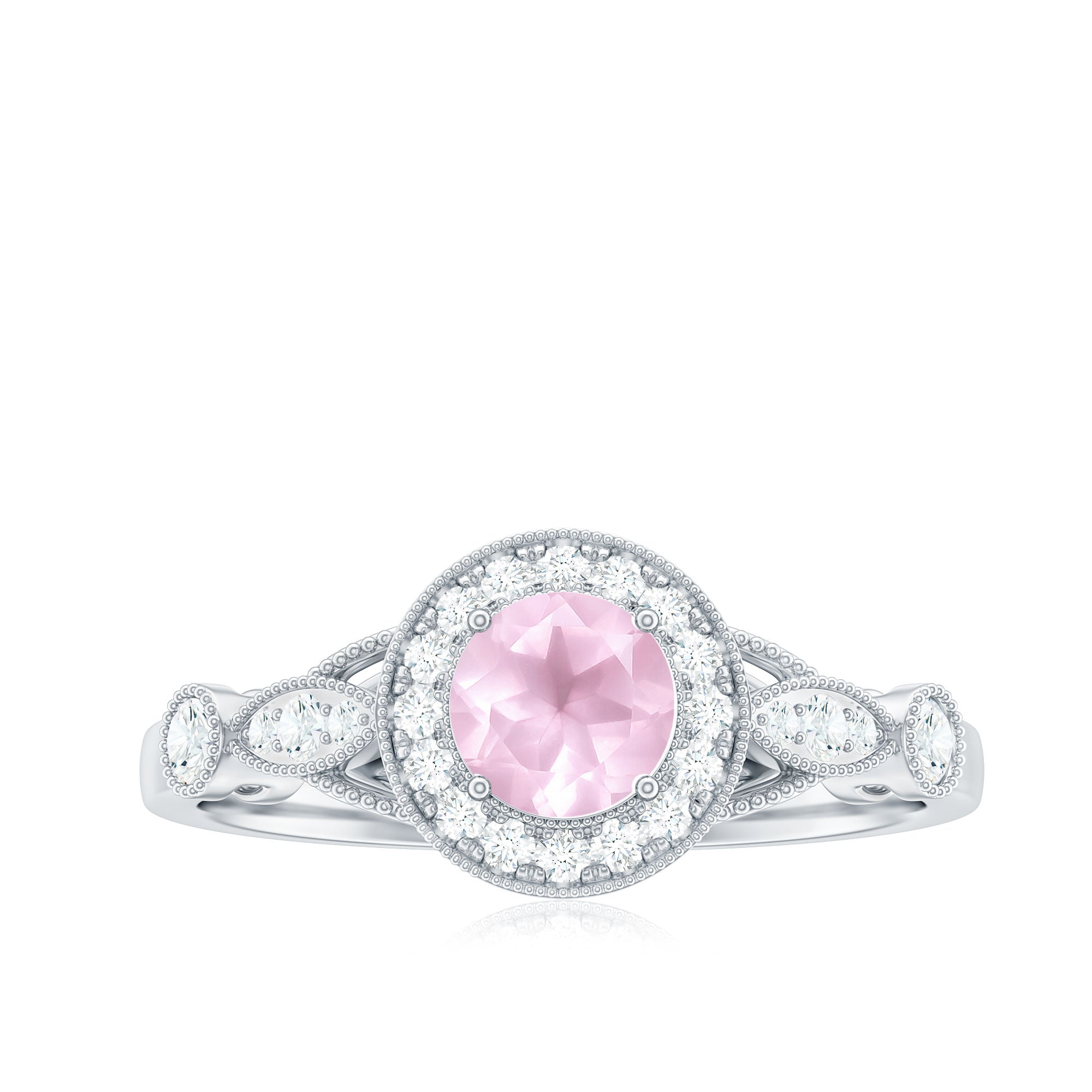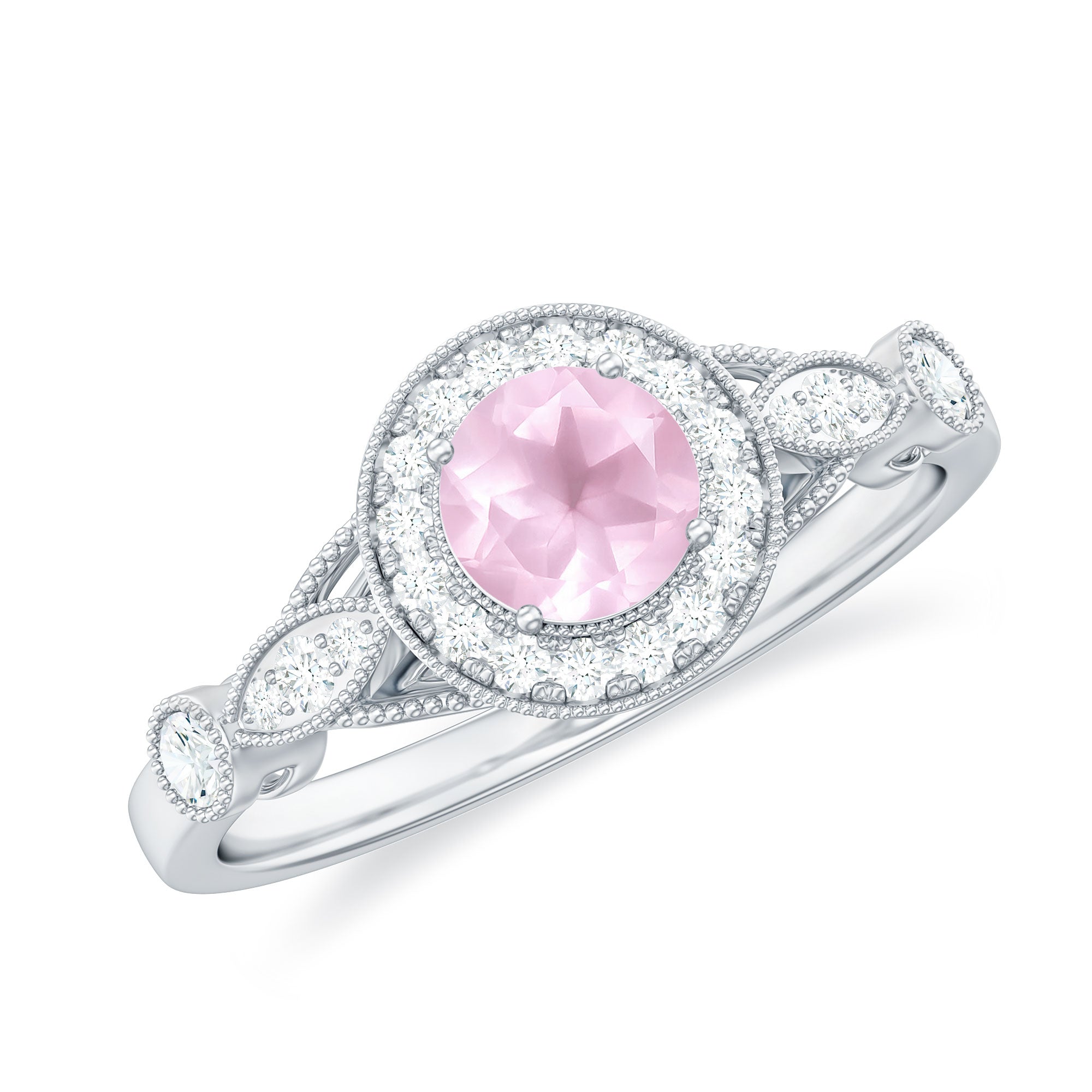The Vintage Engagement Ring is adorned with a 5 MM Round Shape Rose Quartz in 4 Prong Setting mounted in Solid Gold and embellished with Round Diamond arranged in Halo on the Solitaire Ring. The Engagement Ring is also decorated with Milgrain for a Vintage look.