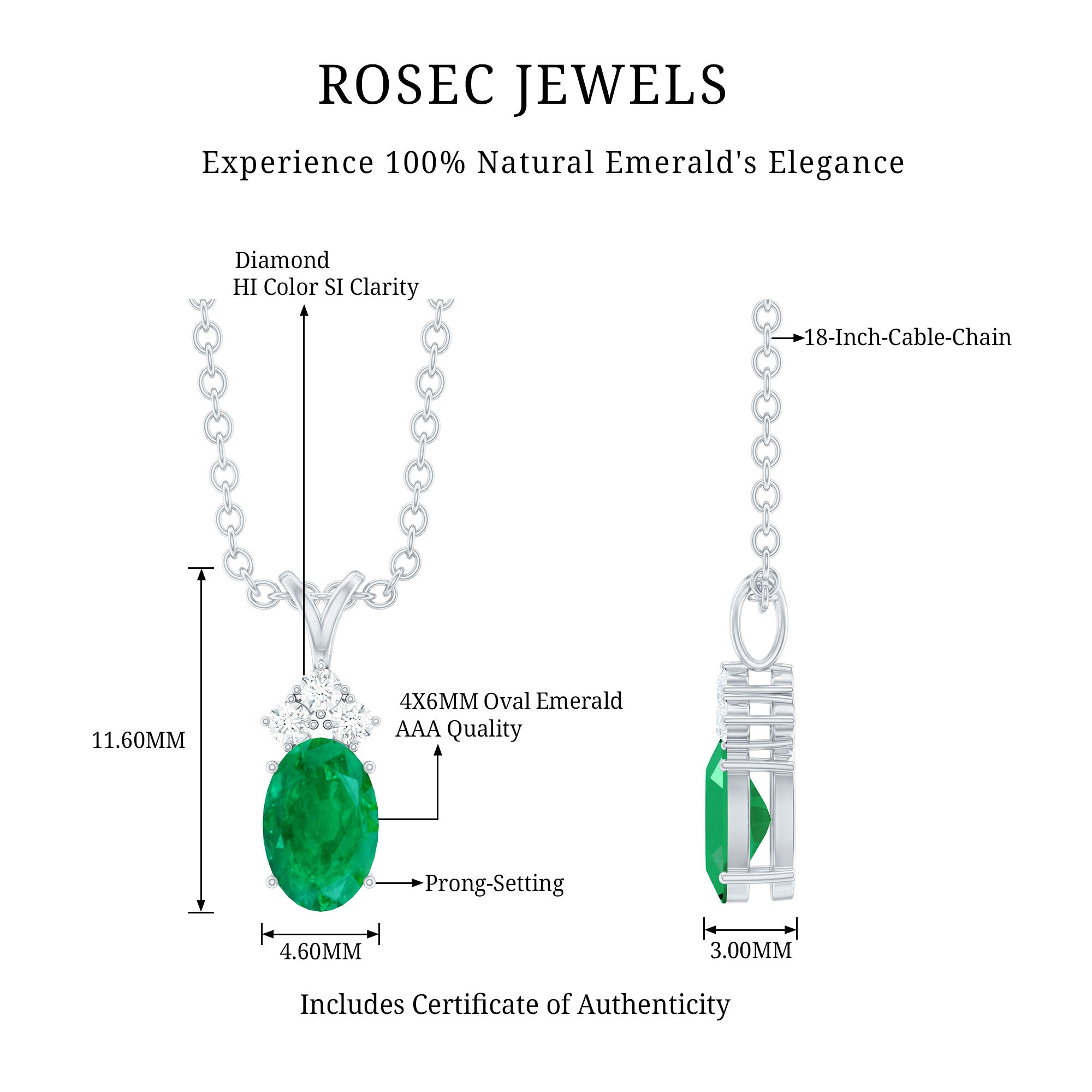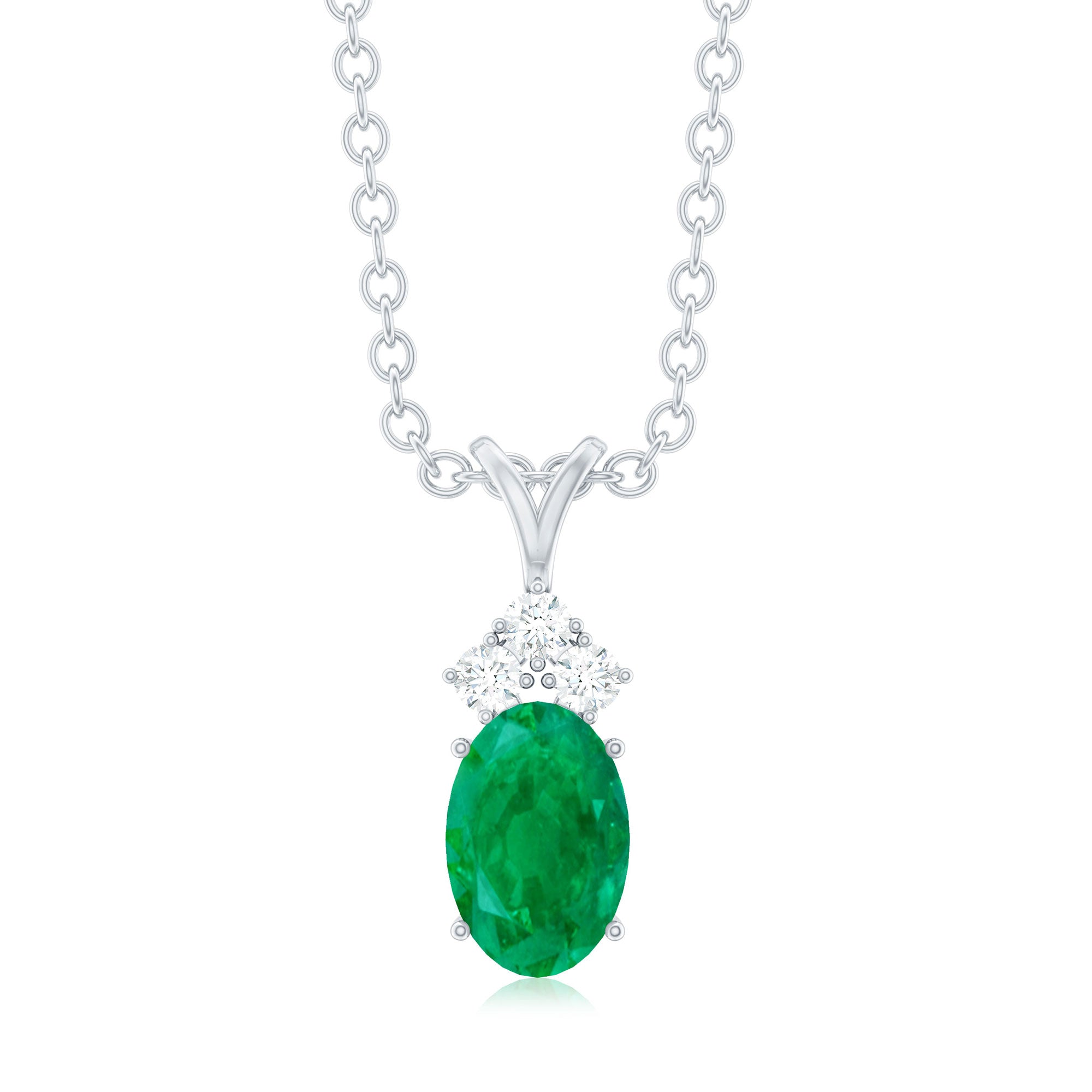 Complement her attire with this Oval Pendant Necklace embellished with an Oval Cut Emerald in 4 Prong Setting and topped with Round Diamond Trio. This Emerald Pendant is composed of Solid Metal and features a Rabbit Ear Bail. Present this Emerald Pendant Necklace to your special person and make her feel special.