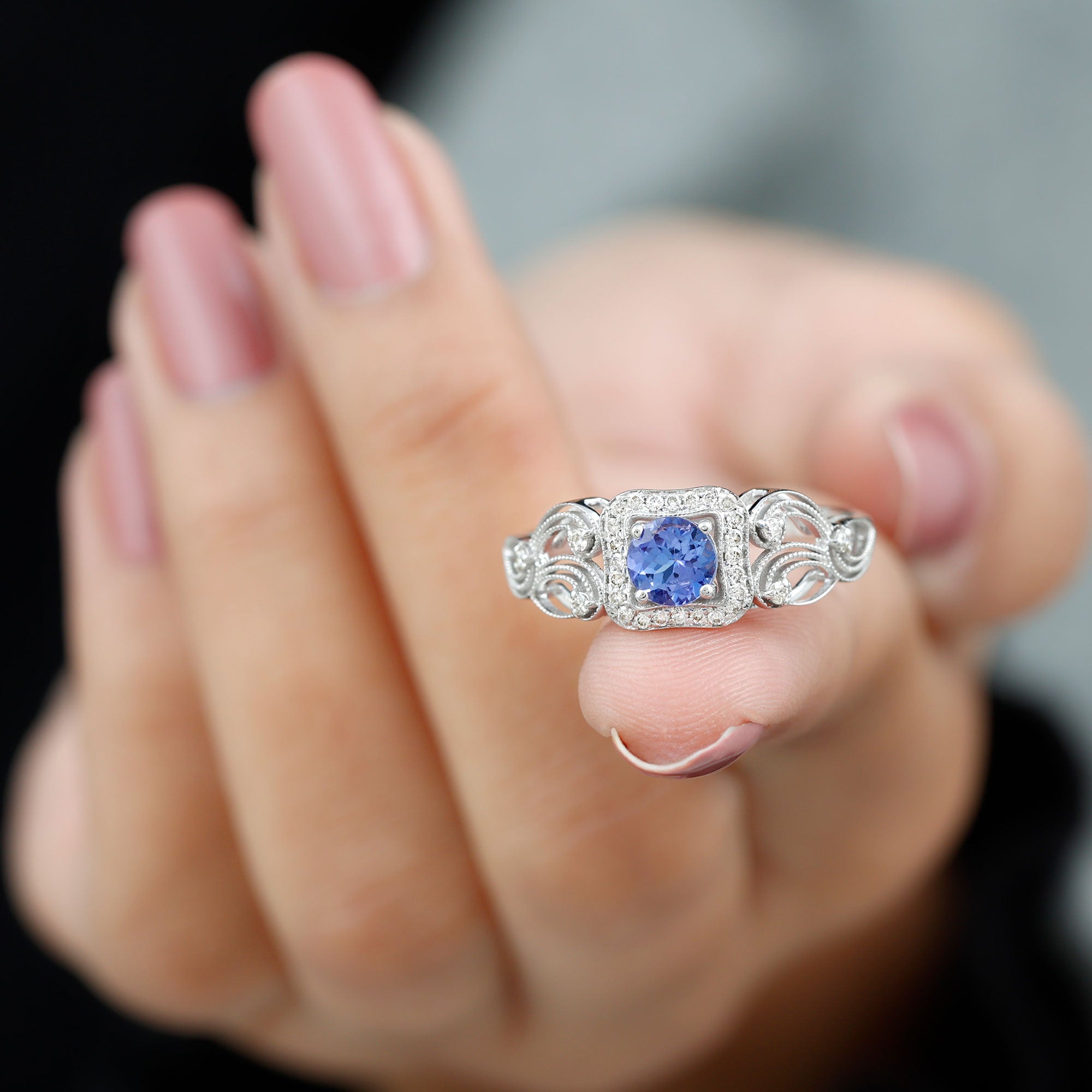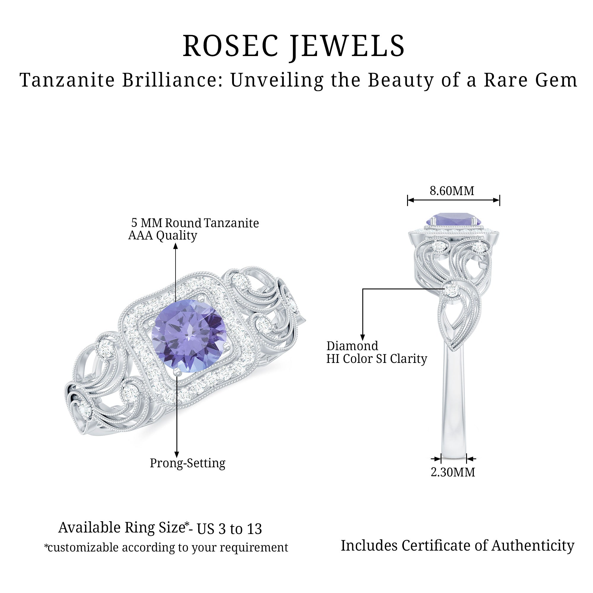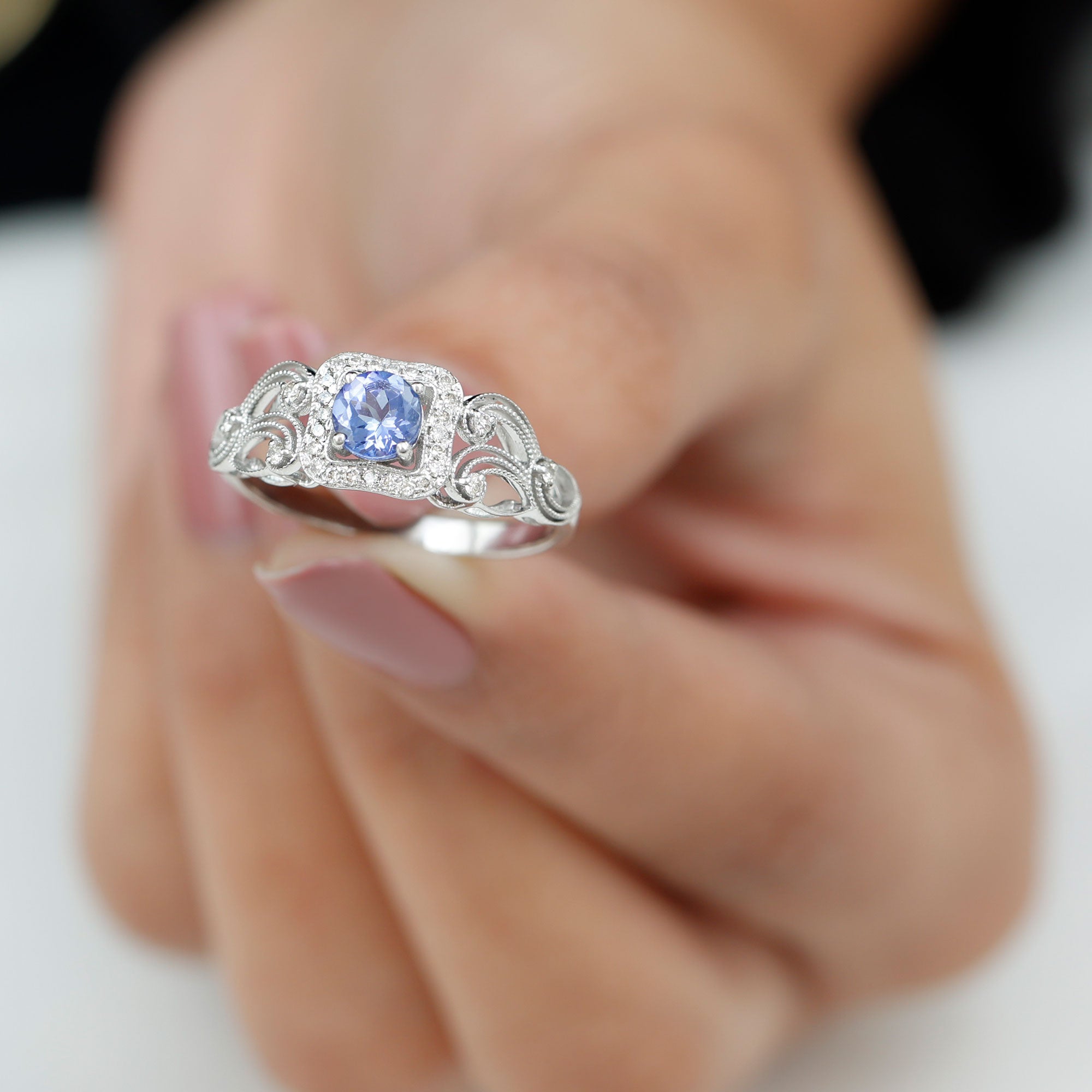 Unique Engagement Ring is beautiful vintage jewelry encrusted with Round Shape Tanzanite in the center with Round Shape Diamond set in a halo style. A milgrain floral design set with Diamond magnifies the piece.