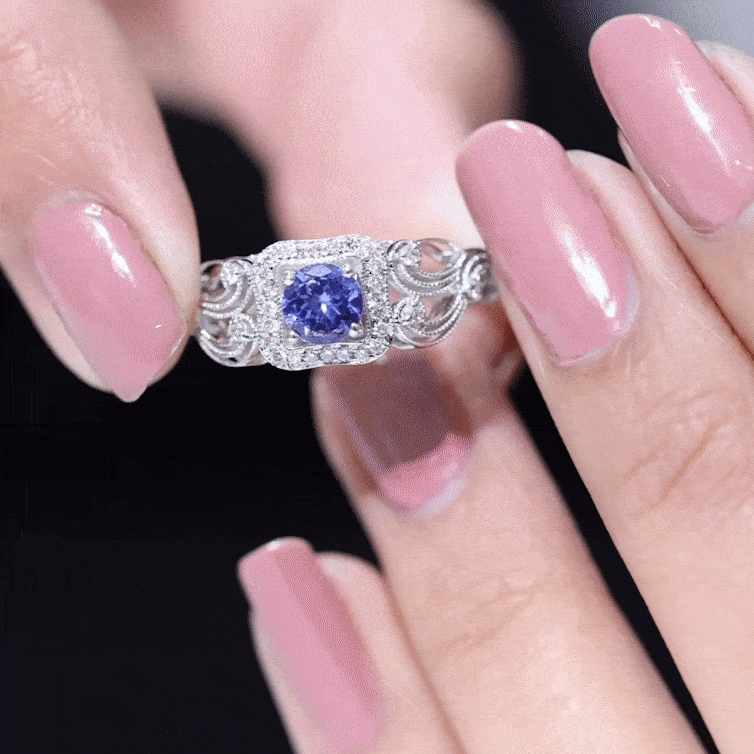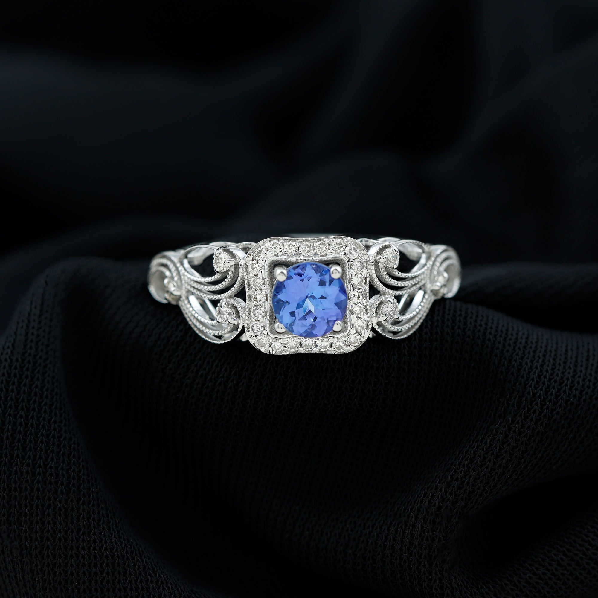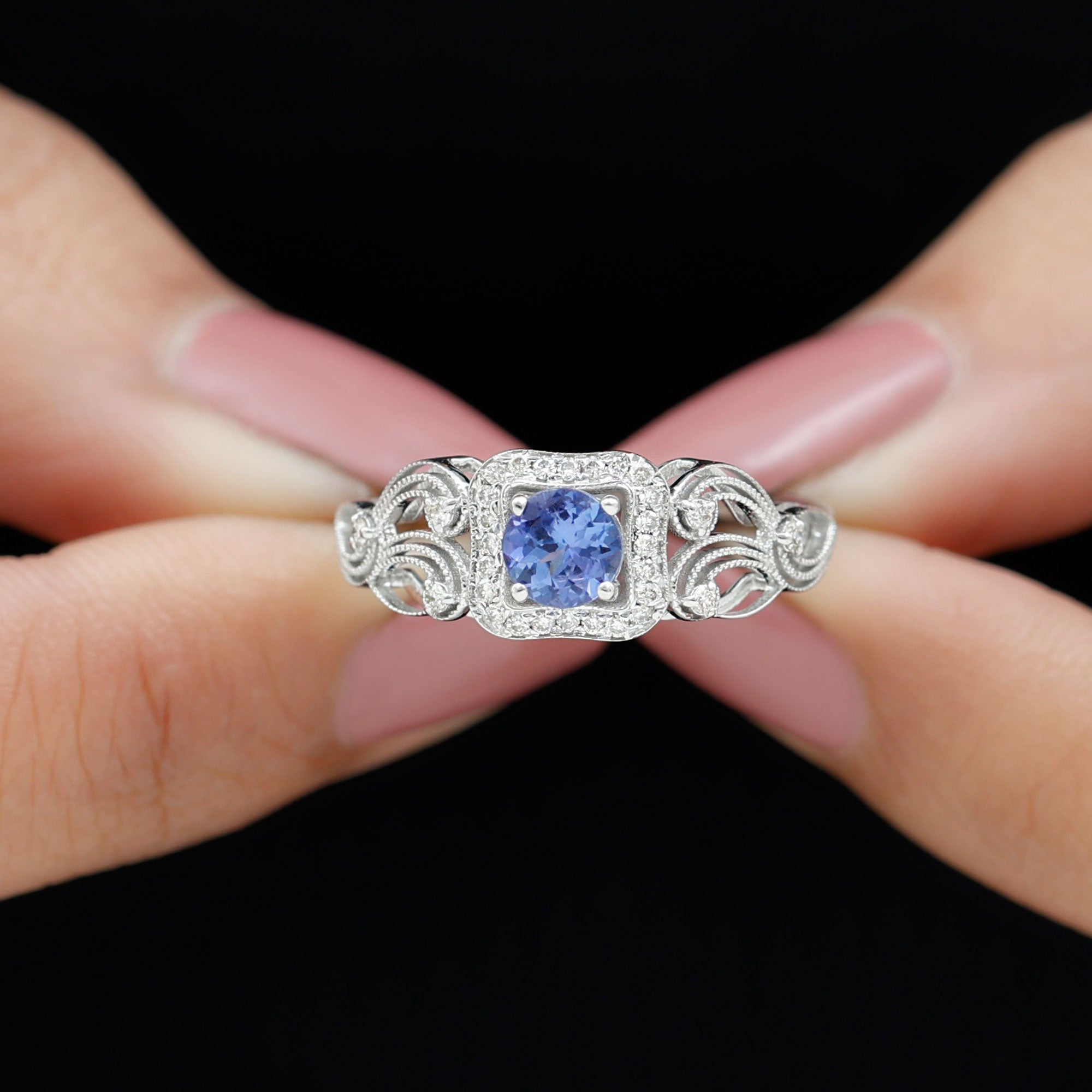 Unique Engagement Ring is beautiful vintage jewelry encrusted with Round Shape Tanzanite in the center with Round Shape Diamond set in a halo style. A milgrain floral design set with Diamond magnifies the piece.