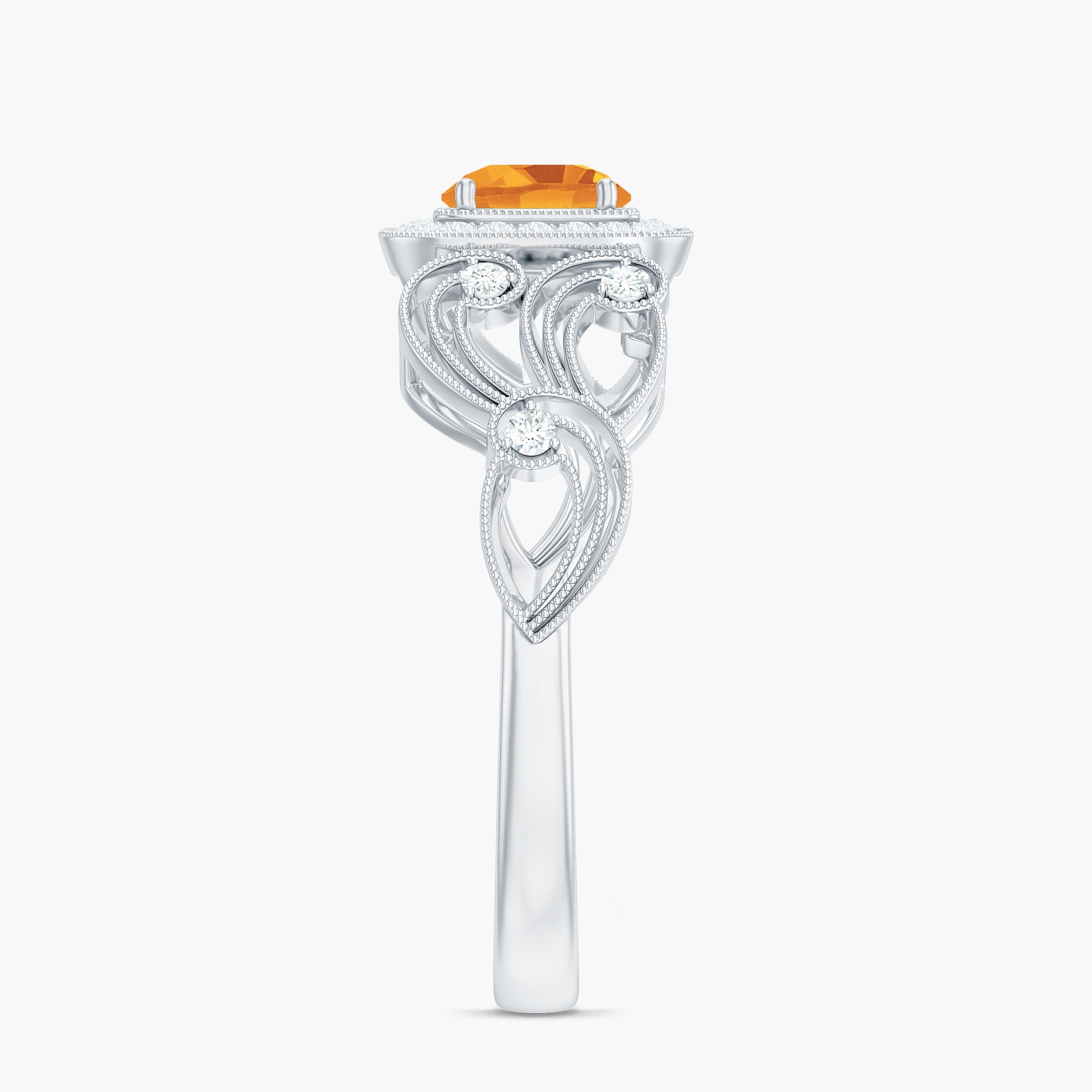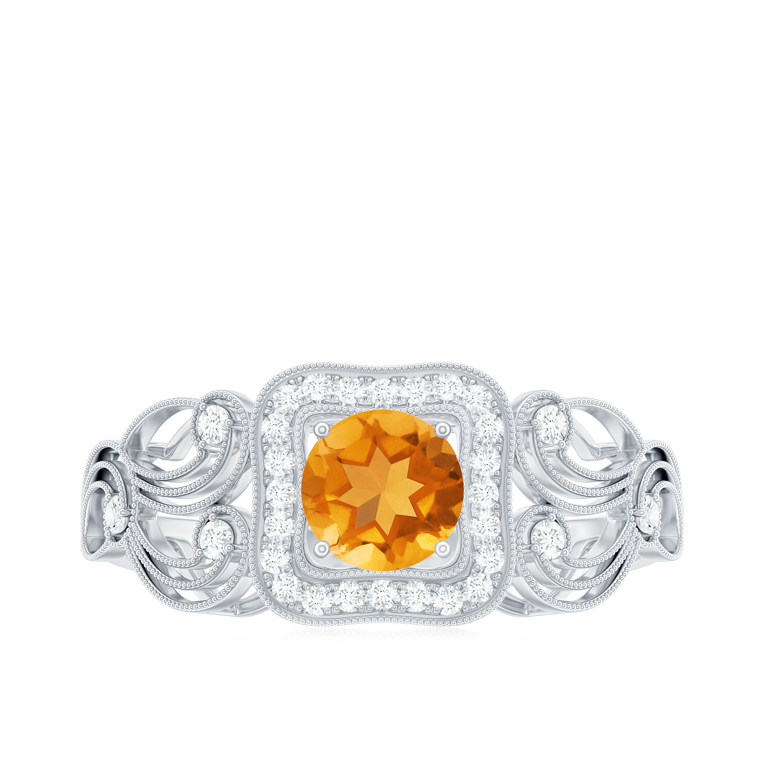 An Amazing and Fabulous Vintage Engagement Ring is a perfect gift for your lady. This Engagement Ring is decorated with Round Shape Citrine in the center and a Round Diamond is set as halo and side stones. The milgrain floral design set with Diamond stones magnifies the piece. This Citrine Engagement Ring is mounted in Gold Metal.