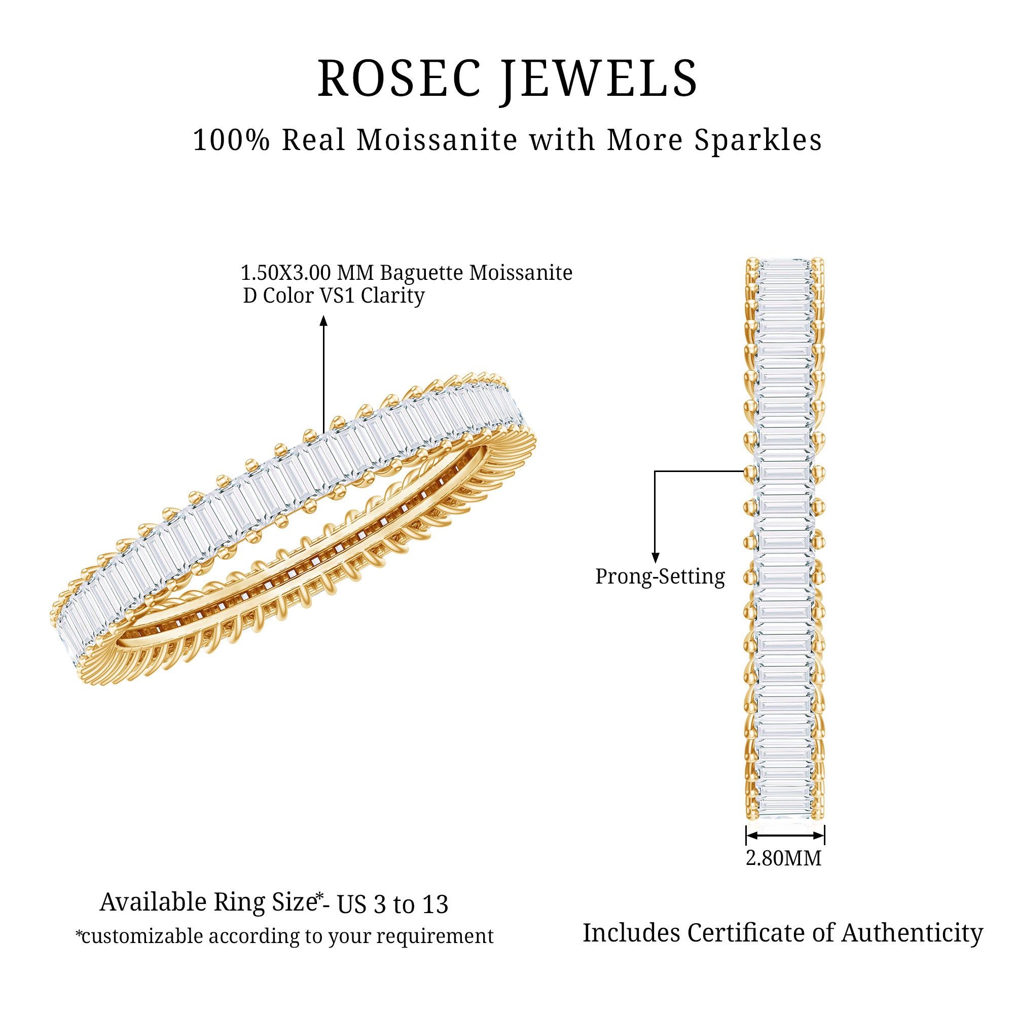 Rosec Jewels handcrafts moissanite wedding ring set with utmost care and perfection that you’ll fall in love with every single piece. The moissanite we choose to mount on men’s and women’s moissanite wedding bands are of highest quality. Moissanite is an ethical stone and now it has been widely accepted for traditional vows. So why don’t you witness the moissanite love in person?