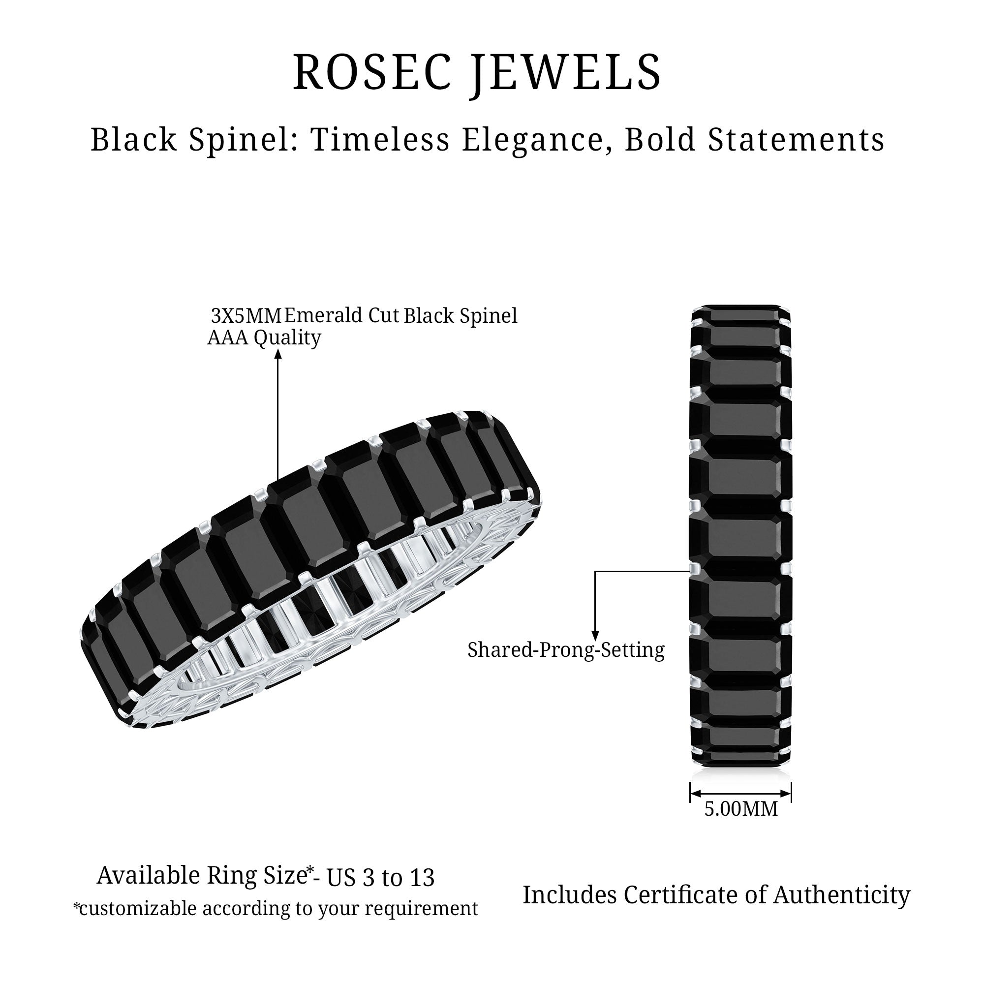 Black Spinel registers a fairly durable hardness rating of 8 out of 10 on Mohs Scale. That makes it highly resistant to regular wear and tear. So be it a Black Spinel Eternity Ring or the one fashioned in the Classic Solitaire Style, you can wear it everyday.
